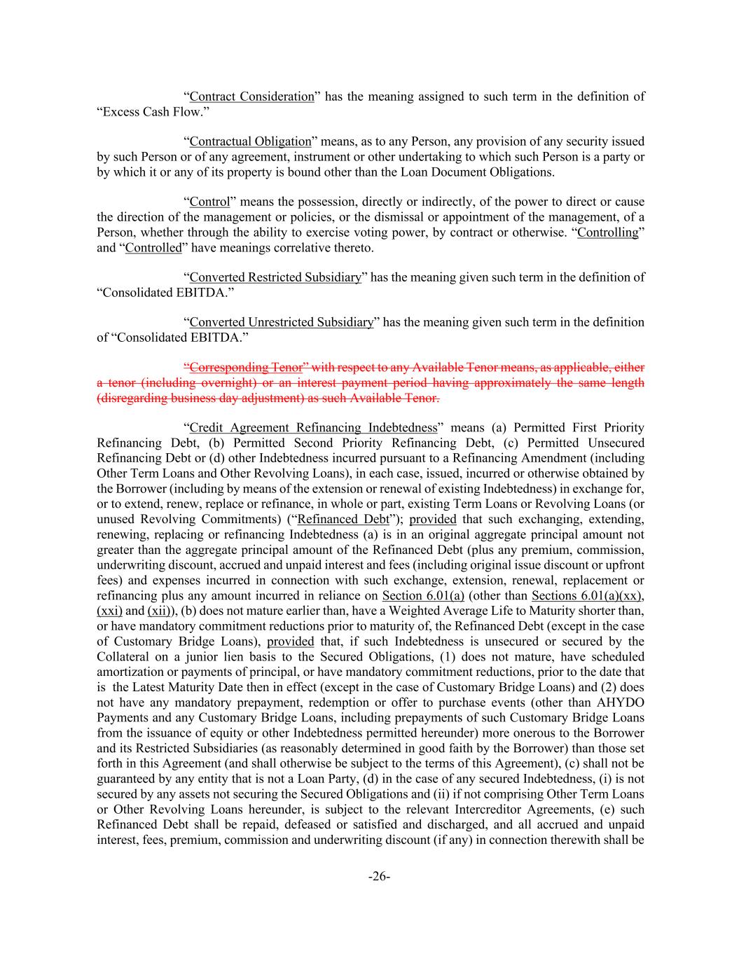 -26- “Contract Consideration” has the meaning assigned to such term in the definition of “Excess Cash Flow.” “Contractual Obligation” means, as to any Person, any provision of any security issued by such Person or of any agreement, instrument or other undertaking to which such Person is a party or by which it or any of its property is bound other than the Loan Document Obligations. “Control” means the possession, directly or indirectly, of the power to direct or cause the direction of the management or policies, or the dismissal or appointment of the management, of a Person, whether through the ability to exercise voting power, by contract or otherwise. “Controlling” and “Controlled” have meanings correlative thereto. “Converted Restricted Subsidiary” has the meaning given such term in the definition of “Consolidated EBITDA.” “Converted Unrestricted Subsidiary” has the meaning given such term in the definition of “Consolidated EBITDA.” “Corresponding Tenor” with respect to any Available Tenor means, as applicable, either a tenor (including overnight) or an interest payment period having approximately the same length (disregarding business day adjustment) as such Available Tenor. “Credit Agreement Refinancing Indebtedness” means (a) Permitted First Priority Refinancing Debt, (b) Permitted Second Priority Refinancing Debt, (c) Permitted Unsecured Refinancing Debt or (d) other Indebtedness incurred pursuant to a Refinancing Amendment (including Other Term Loans and Other Revolving Loans), in each case, issued, incurred or otherwise obtained by the Borrower (including by means of the extension or renewal of existing Indebtedness) in exchange for, or to extend, renew, replace or refinance, in whole or part, existing Term Loans or Revolving Loans (or unused Revolving Commitments) (“Refinanced Debt”); provided that such exchanging, extending, renewing, replacing or refinancing Indebtedness (a) is in an original aggregate principal amount not greater than the aggregate principal amount of the Refinanced Debt (plus any premium, commission, underwriting discount, accrued and unpaid interest and fees (including original issue discount or upfront fees) and expenses incurred in connection with such exchange, extension, renewal, replacement or refinancing plus any amount incurred in reliance on Section 6.01(a) (other than Sections 6.01(a)(xx), (xxi) and (xii)), (b) does not mature earlier than, have a Weighted Average Life to Maturity shorter than, or have mandatory commitment reductions prior to maturity of, the Refinanced Debt (except in the case of Customary Bridge Loans), provided that, if such Indebtedness is unsecured or secured by the Collateral on a junior lien basis to the Secured Obligations, (1) does not mature, have scheduled amortization or payments of principal, or have mandatory commitment reductions, prior to the date that is the Latest Maturity Date then in effect (except in the case of Customary Bridge Loans) and (2) does not have any mandatory prepayment, redemption or offer to purchase events (other than AHYDO Payments and any Customary Bridge Loans, including prepayments of such Customary Bridge Loans from the issuance of equity or other Indebtedness permitted hereunder) more onerous to the Borrower and its Restricted Subsidiaries (as reasonably determined in good faith by the Borrower) than those set forth in this Agreement (and shall otherwise be subject to the terms of this Agreement), (c) shall not be guaranteed by any entity that is not a Loan Party, (d) in the case of any secured Indebtedness, (i) is not secured by any assets not securing the Secured Obligations and (ii) if not comprising Other Term Loans or Other Revolving Loans hereunder, is subject to the relevant Intercreditor Agreements, (e) such Refinanced Debt shall be repaid, defeased or satisfied and discharged, and all accrued and unpaid interest, fees, premium, commission and underwriting discount (if any) in connection therewith shall be