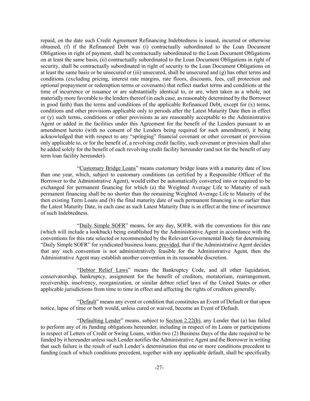 -27- repaid, on the date such Credit Agreement Refinancing Indebtedness is issued, incurred or otherwise obtained, (f) if the Refinanced Debt was (i) contractually subordinated to the Loan Document Obligations in right of payment, shall be contractually subordinated to the Loan Document Obligations on at least the same basis, (ii) contractually subordinated to the Loan Document Obligations in right of security, shall be contractually subordinated in right of security to the Loan Document Obligations on at least the same basis or be unsecured or (iii) unsecured, shall be unsecured and (g) has other terms and conditions (excluding pricing, interest rate margins, rate floors, discounts, fees, call protection and optional prepayment or redemption terms or covenants) that reflect market terms and conditions at the time of incurrence or issuance or are substantially identical to, or are, when taken as a whole, not materially more favorable to the lenders thereof (in each case, as reasonably determined by the Borrower in good faith) than the terms and conditions of the applicable Refinanced Debt, except for (x) terms, conditions and other provisions applicable only to periods after the Latest Maturity Date then in effect or (y) such terms, conditions or other provisions as are reasonably acceptable to the Administrative Agent or added in the facilities under this Agreement for the benefit of the Lenders pursuant to an amendment hereto (with no consent of the Lenders being required for such amendment), it being acknowledged that with respect to any “springing” financial covenant or other covenant or provision only applicable to, or for the benefit of, a revolving credit facility, such covenant or provision shall also be added solely for the benefit of each revolving credit facility hereunder (and not for the benefit of any term loan facility hereunder). “Customary Bridge Loans” means customary bridge loans with a maturity date of less than one year, which, subject to customary conditions (as certified by a Responsible Officer of the Borrower to the Administrative Agent), would either be automatically converted into or required to be exchanged for permanent financing for which (a) the Weighted Average Life to Maturity of such permanent financing shall be no shorter than the remaining Weighted Average Life to Maturity of the then existing Term Loans and (b) the final maturity date of such permanent financing is no earlier than the Latest Maturity Date, in each case as such Latest Maturity Date is in effect at the time of incurrence of such Indebtedness. “Daily Simple SOFR” means, for any day, SOFR, with the conventions for this rate (which will include a lookback) being established by the Administrative Agent in accordance with the conventions for this rate selected or recommended by the Relevant Governmental Body for determining “Daily Simple SOFR” for syndicated business loans; provided, that if the Administrative Agent decides that any such convention is not administratively feasible for the Administrative Agent, then the Administrative Agent may establish another convention in its reasonable discretion. “Debtor Relief Laws” means the Bankruptcy Code, and all other liquidation, conservatorship, bankruptcy, assignment for the benefit of creditors, moratorium, rearrangement, receivership, insolvency, reorganization, or similar debtor relief laws of the United States or other applicable jurisdictions from time to time in effect and affecting the rights of creditors generally. “Default” means any event or condition that constitutes an Event of Default or that upon notice, lapse of time or both would, unless cured or waived, become an Event of Default. “Defaulting Lender” means, subject to Section 2.22(b), any Lender that (a) has failed to perform any of its funding obligations hereunder, including in respect of its Loans or participations in respect of Letters of Credit or Swing Loans, within two (2) Business Days of the date required to be funded by it hereunder unless such Lender notifies the Administrative Agent and the Borrower in writing that such failure is the result of such Lender’s determination that one or more conditions precedent to funding (each of which conditions precedent, together with any applicable default, shall be specifically