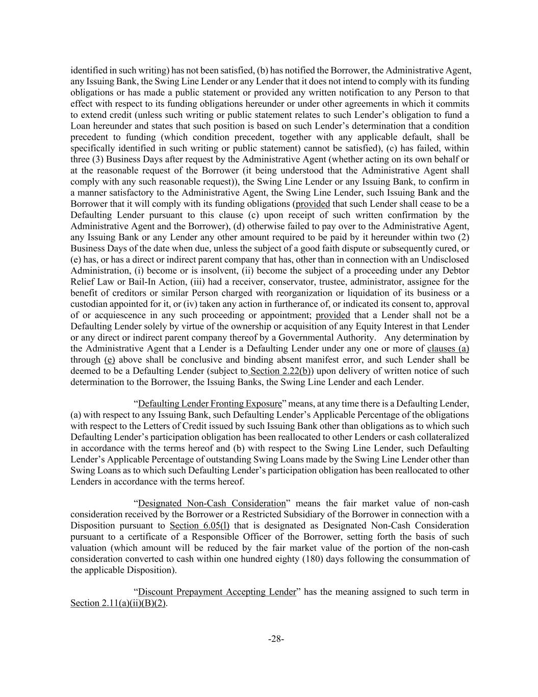 -28- identified in such writing) has not been satisfied, (b) has notified the Borrower, the Administrative Agent, any Issuing Bank, the Swing Line Lender or any Lender that it does not intend to comply with its funding obligations or has made a public statement or provided any written notification to any Person to that effect with respect to its funding obligations hereunder or under other agreements in which it commits to extend credit (unless such writing or public statement relates to such Lender’s obligation to fund a Loan hereunder and states that such position is based on such Lender’s determination that a condition precedent to funding (which condition precedent, together with any applicable default, shall be specifically identified in such writing or public statement) cannot be satisfied), (c) has failed, within three (3) Business Days after request by the Administrative Agent (whether acting on its own behalf or at the reasonable request of the Borrower (it being understood that the Administrative Agent shall comply with any such reasonable request)), the Swing Line Lender or any Issuing Bank, to confirm in a manner satisfactory to the Administrative Agent, the Swing Line Lender, such Issuing Bank and the Borrower that it will comply with its funding obligations (provided that such Lender shall cease to be a Defaulting Lender pursuant to this clause (c) upon receipt of such written confirmation by the Administrative Agent and the Borrower), (d) otherwise failed to pay over to the Administrative Agent, any Issuing Bank or any Lender any other amount required to be paid by it hereunder within two (2) Business Days of the date when due, unless the subject of a good faith dispute or subsequently cured, or (e) has, or has a direct or indirect parent company that has, other than in connection with an Undisclosed Administration, (i) become or is insolvent, (ii) become the subject of a proceeding under any Debtor Relief Law or Bail-In Action, (iii) had a receiver, conservator, trustee, administrator, assignee for the benefit of creditors or similar Person charged with reorganization or liquidation of its business or a custodian appointed for it, or (iv) taken any action in furtherance of, or indicated its consent to, approval of or acquiescence in any such proceeding or appointment; provided that a Lender shall not be a Defaulting Lender solely by virtue of the ownership or acquisition of any Equity Interest in that Lender or any direct or indirect parent company thereof by a Governmental Authority. Any determination by the Administrative Agent that a Lender is a Defaulting Lender under any one or more of clauses (a) through (e) above shall be conclusive and binding absent manifest error, and such Lender shall be deemed to be a Defaulting Lender (subject to Section 2.22(b)) upon delivery of written notice of such determination to the Borrower, the Issuing Banks, the Swing Line Lender and each Lender. “Defaulting Lender Fronting Exposure” means, at any time there is a Defaulting Lender, (a) with respect to any Issuing Bank, such Defaulting Lender’s Applicable Percentage of the obligations with respect to the Letters of Credit issued by such Issuing Bank other than obligations as to which such Defaulting Lender’s participation obligation has been reallocated to other Lenders or cash collateralized in accordance with the terms hereof and (b) with respect to the Swing Line Lender, such Defaulting Lender’s Applicable Percentage of outstanding Swing Loans made by the Swing Line Lender other than Swing Loans as to which such Defaulting Lender’s participation obligation has been reallocated to other Lenders in accordance with the terms hereof. “Designated Non-Cash Consideration” means the fair market value of non-cash consideration received by the Borrower or a Restricted Subsidiary of the Borrower in connection with a Disposition pursuant to Section 6.05(l) that is designated as Designated Non-Cash Consideration pursuant to a certificate of a Responsible Officer of the Borrower, setting forth the basis of such valuation (which amount will be reduced by the fair market value of the portion of the non-cash consideration converted to cash within one hundred eighty (180) days following the consummation of the applicable Disposition). “Discount Prepayment Accepting Lender” has the meaning assigned to such term in Section 2.11(a)(ii)(B)(2).