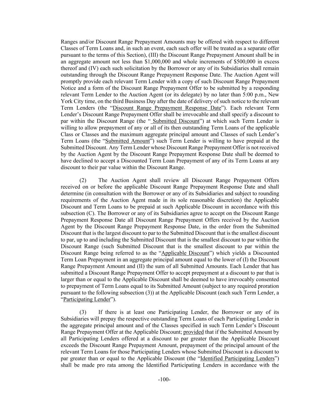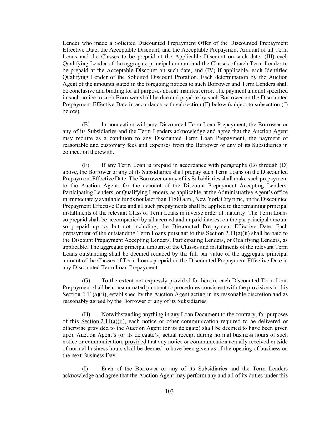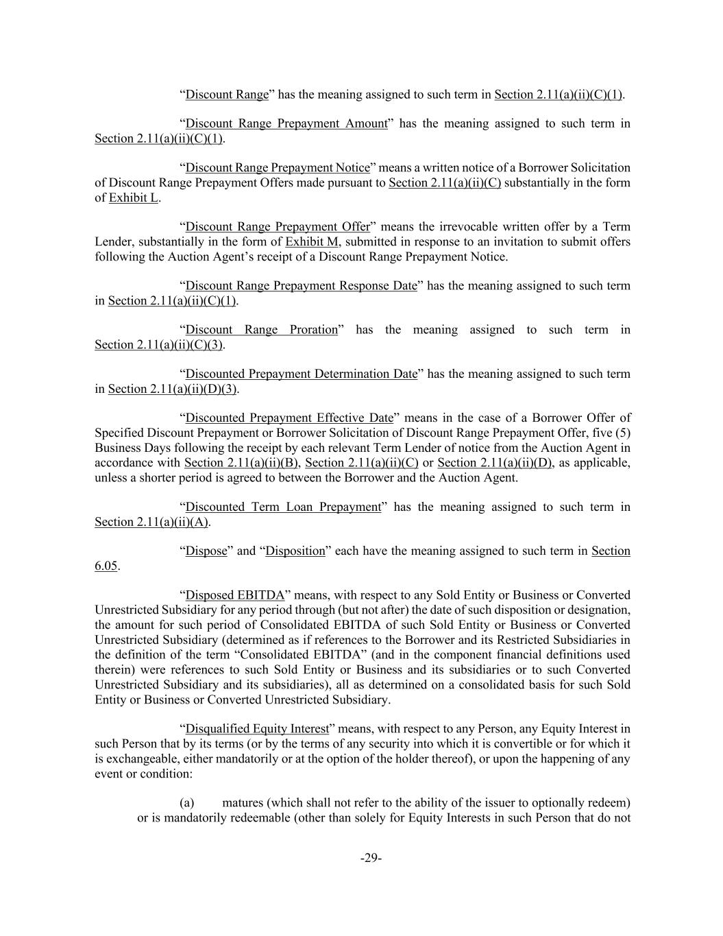 -29- “Discount Range” has the meaning assigned to such term in Section 2.11(a)(ii)(C)(1). “Discount Range Prepayment Amount” has the meaning assigned to such term in Section 2.11(a)(ii)(C)(1). “Discount Range Prepayment Notice” means a written notice of a Borrower Solicitation of Discount Range Prepayment Offers made pursuant to Section 2.11(a)(ii)(C) substantially in the form of Exhibit L. “Discount Range Prepayment Offer” means the irrevocable written offer by a Term Lender, substantially in the form of Exhibit M, submitted in response to an invitation to submit offers following the Auction Agent’s receipt of a Discount Range Prepayment Notice. “Discount Range Prepayment Response Date” has the meaning assigned to such term in Section 2.11(a)(ii)(C)(1). “Discount Range Proration” has the meaning assigned to such term in Section 2.11(a)(ii)(C)(3). “Discounted Prepayment Determination Date” has the meaning assigned to such term in Section 2.11(a)(ii)(D)(3). “Discounted Prepayment Effective Date” means in the case of a Borrower Offer of Specified Discount Prepayment or Borrower Solicitation of Discount Range Prepayment Offer, five (5) Business Days following the receipt by each relevant Term Lender of notice from the Auction Agent in accordance with Section 2.11(a)(ii)(B), Section 2.11(a)(ii)(C) or Section 2.11(a)(ii)(D), as applicable, unless a shorter period is agreed to between the Borrower and the Auction Agent. “Discounted Term Loan Prepayment” has the meaning assigned to such term in Section 2.11(a)(ii)(A). “Dispose” and “Disposition” each have the meaning assigned to such term in Section 6.05. “Disposed EBITDA” means, with respect to any Sold Entity or Business or Converted Unrestricted Subsidiary for any period through (but not after) the date of such disposition or designation, the amount for such period of Consolidated EBITDA of such Sold Entity or Business or Converted Unrestricted Subsidiary (determined as if references to the Borrower and its Restricted Subsidiaries in the definition of the term “Consolidated EBITDA” (and in the component financial definitions used therein) were references to such Sold Entity or Business and its subsidiaries or to such Converted Unrestricted Subsidiary and its subsidiaries), all as determined on a consolidated basis for such Sold Entity or Business or Converted Unrestricted Subsidiary. “Disqualified Equity Interest” means, with respect to any Person, any Equity Interest in such Person that by its terms (or by the terms of any security into which it is convertible or for which it is exchangeable, either mandatorily or at the option of the holder thereof), or upon the happening of any event or condition: (a) matures (which shall not refer to the ability of the issuer to optionally redeem) or is mandatorily redeemable (other than solely for Equity Interests in such Person that do not