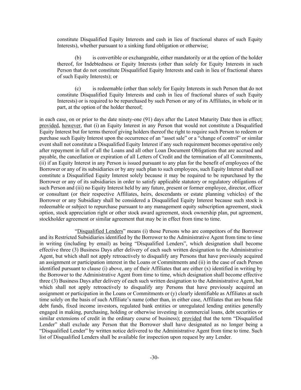 -30- constitute Disqualified Equity Interests and cash in lieu of fractional shares of such Equity Interests), whether pursuant to a sinking fund obligation or otherwise; (b) is convertible or exchangeable, either mandatorily or at the option of the holder thereof, for Indebtedness or Equity Interests (other than solely for Equity Interests in such Person that do not constitute Disqualified Equity Interests and cash in lieu of fractional shares of such Equity Interests); or (c) is redeemable (other than solely for Equity Interests in such Person that do not constitute Disqualified Equity Interests and cash in lieu of fractional shares of such Equity Interests) or is required to be repurchased by such Person or any of its Affiliates, in whole or in part, at the option of the holder thereof; in each case, on or prior to the date ninety-one (91) days after the Latest Maturity Date then in effect; provided, however, that (i) an Equity Interest in any Person that would not constitute a Disqualified Equity Interest but for terms thereof giving holders thereof the right to require such Person to redeem or purchase such Equity Interest upon the occurrence of an “asset sale” or a “change of control” or similar event shall not constitute a Disqualified Equity Interest if any such requirement becomes operative only after repayment in full of all the Loans and all other Loan Document Obligations that are accrued and payable, the cancellation or expiration of all Letters of Credit and the termination of all Commitments, (ii) if an Equity Interest in any Person is issued pursuant to any plan for the benefit of employees of the Borrower or any of its subsidiaries or by any such plan to such employees, such Equity Interest shall not constitute a Disqualified Equity Interest solely because it may be required to be repurchased by the Borrower or any of its subsidiaries in order to satisfy applicable statutory or regulatory obligations of such Person and (iii) no Equity Interest held by any future, present or former employee, director, officer or consultant (or their respective Affiliates, heirs, descendants or estate planning vehicles) of the Borrower or any Subsidiary shall be considered a Disqualified Equity Interest because such stock is redeemable or subject to repurchase pursuant to any management equity subscription agreement, stock option, stock appreciation right or other stock award agreement, stock ownership plan, put agreement, stockholder agreement or similar agreement that may be in effect from time to time. “Disqualified Lenders” means (i) those Persons who are competitors of the Borrower and its Restricted Subsidiaries identified by the Borrower to the Administrative Agent from time to time in writing (including by email) as being “Disqualified Lenders”, which designation shall become effective three (3) Business Days after delivery of each such written designation to the Administrative Agent, but which shall not apply retroactively to disqualify any Persons that have previously acquired an assignment or participation interest in the Loans or Commitments and (ii) in the case of each Person identified pursuant to clause (i) above, any of their Affiliates that are either (x) identified in writing by the Borrower to the Administrative Agent from time to time, which designation shall become effective three (3) Business Days after delivery of each such written designation to the Administrative Agent, but which shall not apply retroactively to disqualify any Persons that have previously acquired an assignment or participation in the Loans or Commitments or (y) clearly identifiable as Affiliates at such time solely on the basis of such Affiliate’s name (other than, in either case, Affiliates that are bona fide debt funds, fixed income investors, regulated bank entities or unregulated lending entities generally engaged in making, purchasing, holding or otherwise investing in commercial loans, debt securities or similar extensions of credit in the ordinary course of business); provided that the term “Disqualified Lender” shall exclude any Person that the Borrower shall have designated as no longer being a “Disqualified Lender” by written notice delivered to the Administrative Agent from time to time. Such list of Disqualified Lenders shall be available for inspection upon request by any Lender.