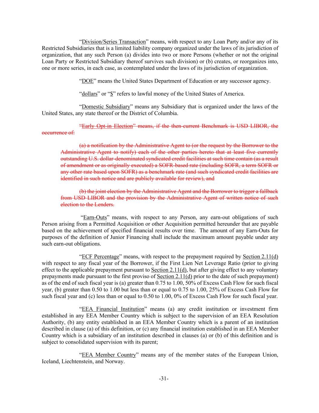 -31- “Division/Series Transaction” means, with respect to any Loan Party and/or any of its Restricted Subsidiaries that is a limited liability company organized under the laws of its jurisdiction of organization, that any such Person (a) divides into two or more Persons (whether or not the original Loan Party or Restricted Subsidiary thereof survives such division) or (b) creates, or reorganizes into, one or more series, in each case, as contemplated under the laws of its jurisdiction of organization. “DOE” means the United States Department of Education or any successor agency. “dollars” or “$” refers to lawful money of the United States of America. “Domestic Subsidiary” means any Subsidiary that is organized under the laws of the United States, any state thereof or the District of Columbia. “Early Opt-in Election” means, if the then-current Benchmark is USD LIBOR, the occurrence of: (a) a notification by the Administrative Agent to (or the request by the Borrower to the Administrative Agent to notify) each of the other parties hereto that at least five currently outstanding U.S. dollar-denominated syndicated credit facilities at such time contain (as a result of amendment or as originally executed) a SOFR-based rate (including SOFR, a term SOFR or any other rate based upon SOFR) as a benchmark rate (and such syndicated credit facilities are identified in such notice and are publicly available for review), and (b) the joint election by the Administrative Agent and the Borrower to trigger a fallback from USD LIBOR and the provision by the Administrative Agent of written notice of such election to the Lenders. “Earn-Outs” means, with respect to any Person, any earn-out obligations of such Person arising from a Permitted Acquisition or other Acquisition permitted hereunder that are payable based on the achievement of specified financial results over time. The amount of any Earn-Outs for purposes of the definition of Junior Financing shall include the maximum amount payable under any such earn-out obligations. “ECF Percentage” means, with respect to the prepayment required by Section 2.11(d) with respect to any fiscal year of the Borrower, if the First Lien Net Leverage Ratio (prior to giving effect to the applicable prepayment pursuant to Section 2.11(d), but after giving effect to any voluntary prepayments made pursuant to the first proviso of Section 2.11(d) prior to the date of such prepayment) as of the end of such fiscal year is (a) greater than 0.75 to 1.00, 50% of Excess Cash Flow for such fiscal year, (b) greater than 0.50 to 1.00 but less than or equal to 0.75 to 1.00, 25% of Excess Cash Flow for such fiscal year and (c) less than or equal to 0.50 to 1.00, 0% of Excess Cash Flow for such fiscal year. “EEA Financial Institution” means (a) any credit institution or investment firm established in any EEA Member Country which is subject to the supervision of an EEA Resolution Authority, (b) any entity established in an EEA Member Country which is a parent of an institution described in clause (a) of this definition, or (c) any financial institution established in an EEA Member Country which is a subsidiary of an institution described in clauses (a) or (b) of this definition and is subject to consolidated supervision with its parent; “EEA Member Country” means any of the member states of the European Union, Iceland, Liechtenstein, and Norway.