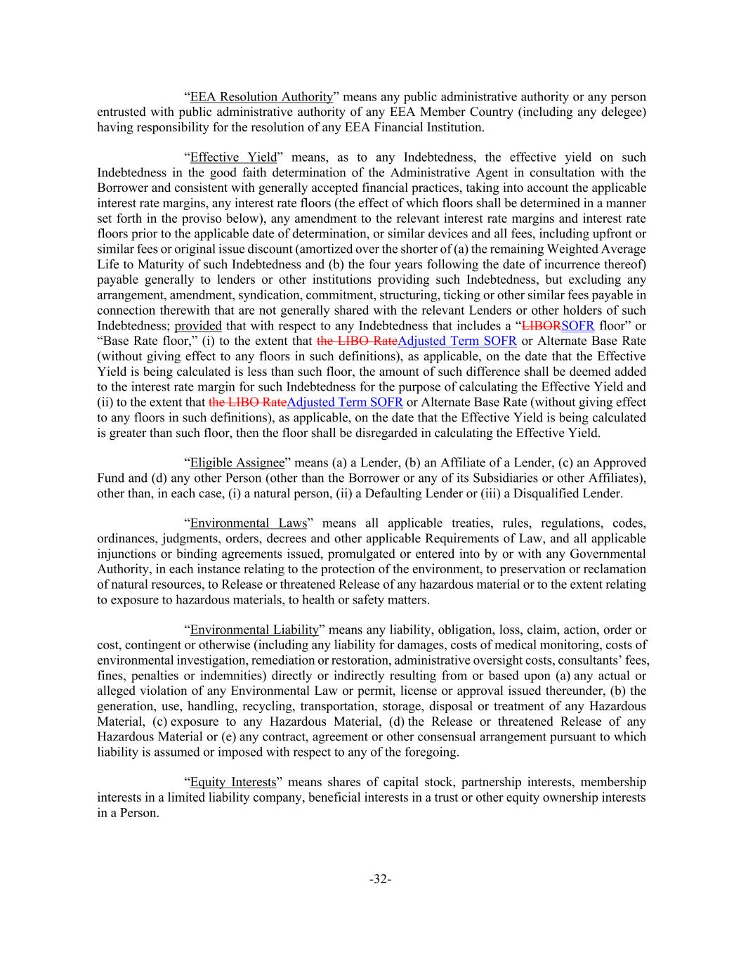 -32- “EEA Resolution Authority” means any public administrative authority or any person entrusted with public administrative authority of any EEA Member Country (including any delegee) having responsibility for the resolution of any EEA Financial Institution. “Effective Yield” means, as to any Indebtedness, the effective yield on such Indebtedness in the good faith determination of the Administrative Agent in consultation with the Borrower and consistent with generally accepted financial practices, taking into account the applicable interest rate margins, any interest rate floors (the effect of which floors shall be determined in a manner set forth in the proviso below), any amendment to the relevant interest rate margins and interest rate floors prior to the applicable date of determination, or similar devices and all fees, including upfront or similar fees or original issue discount (amortized over the shorter of (a) the remaining Weighted Average Life to Maturity of such Indebtedness and (b) the four years following the date of incurrence thereof) payable generally to lenders or other institutions providing such Indebtedness, but excluding any arrangement, amendment, syndication, commitment, structuring, ticking or other similar fees payable in connection therewith that are not generally shared with the relevant Lenders or other holders of such Indebtedness; provided that with respect to any Indebtedness that includes a “LIBORSOFR floor” or “Base Rate floor,” (i) to the extent that the LIBO RateAdjusted Term SOFR or Alternate Base Rate (without giving effect to any floors in such definitions), as applicable, on the date that the Effective Yield is being calculated is less than such floor, the amount of such difference shall be deemed added to the interest rate margin for such Indebtedness for the purpose of calculating the Effective Yield and (ii) to the extent that the LIBO RateAdjusted Term SOFR or Alternate Base Rate (without giving effect to any floors in such definitions), as applicable, on the date that the Effective Yield is being calculated is greater than such floor, then the floor shall be disregarded in calculating the Effective Yield. “Eligible Assignee” means (a) a Lender, (b) an Affiliate of a Lender, (c) an Approved Fund and (d) any other Person (other than the Borrower or any of its Subsidiaries or other Affiliates), other than, in each case, (i) a natural person, (ii) a Defaulting Lender or (iii) a Disqualified Lender. “Environmental Laws” means all applicable treaties, rules, regulations, codes, ordinances, judgments, orders, decrees and other applicable Requirements of Law, and all applicable injunctions or binding agreements issued, promulgated or entered into by or with any Governmental Authority, in each instance relating to the protection of the environment, to preservation or reclamation of natural resources, to Release or threatened Release of any hazardous material or to the extent relating to exposure to hazardous materials, to health or safety matters. “Environmental Liability” means any liability, obligation, loss, claim, action, order or cost, contingent or otherwise (including any liability for damages, costs of medical monitoring, costs of environmental investigation, remediation or restoration, administrative oversight costs, consultants’ fees, fines, penalties or indemnities) directly or indirectly resulting from or based upon (a) any actual or alleged violation of any Environmental Law or permit, license or approval issued thereunder, (b) the generation, use, handling, recycling, transportation, storage, disposal or treatment of any Hazardous Material, (c) exposure to any Hazardous Material, (d) the Release or threatened Release of any Hazardous Material or (e) any contract, agreement or other consensual arrangement pursuant to which liability is assumed or imposed with respect to any of the foregoing. “Equity Interests” means shares of capital stock, partnership interests, membership interests in a limited liability company, beneficial interests in a trust or other equity ownership interests in a Person.