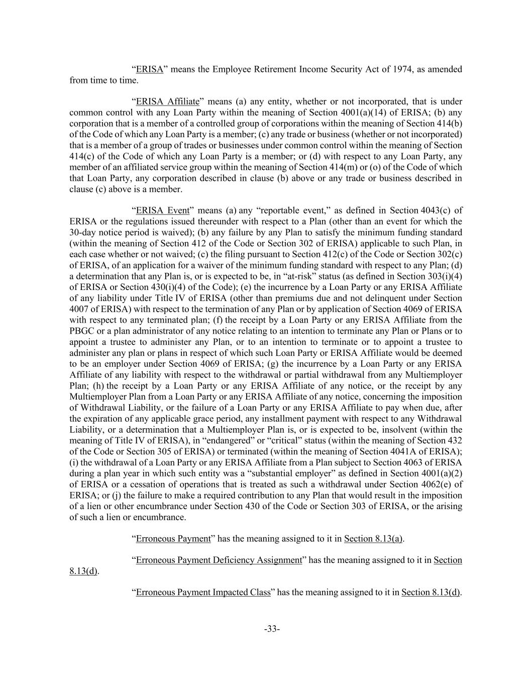 -33- “ERISA” means the Employee Retirement Income Security Act of 1974, as amended from time to time. “ERISA Affiliate” means (a) any entity, whether or not incorporated, that is under common control with any Loan Party within the meaning of Section 4001(a)(14) of ERISA; (b) any corporation that is a member of a controlled group of corporations within the meaning of Section 414(b) of the Code of which any Loan Party is a member; (c) any trade or business (whether or not incorporated) that is a member of a group of trades or businesses under common control within the meaning of Section 414(c) of the Code of which any Loan Party is a member; or (d) with respect to any Loan Party, any member of an affiliated service group within the meaning of Section 414(m) or (o) of the Code of which that Loan Party, any corporation described in clause (b) above or any trade or business described in clause (c) above is a member. “ERISA Event” means (a) any “reportable event,” as defined in Section 4043(c) of ERISA or the regulations issued thereunder with respect to a Plan (other than an event for which the 30-day notice period is waived); (b) any failure by any Plan to satisfy the minimum funding standard (within the meaning of Section 412 of the Code or Section 302 of ERISA) applicable to such Plan, in each case whether or not waived; (c) the filing pursuant to Section 412(c) of the Code or Section 302(c) of ERISA, of an application for a waiver of the minimum funding standard with respect to any Plan; (d) a determination that any Plan is, or is expected to be, in “at-risk” status (as defined in Section 303(i)(4) of ERISA or Section 430(i)(4) of the Code); (e) the incurrence by a Loan Party or any ERISA Affiliate of any liability under Title IV of ERISA (other than premiums due and not delinquent under Section 4007 of ERISA) with respect to the termination of any Plan or by application of Section 4069 of ERISA with respect to any terminated plan; (f) the receipt by a Loan Party or any ERISA Affiliate from the PBGC or a plan administrator of any notice relating to an intention to terminate any Plan or Plans or to appoint a trustee to administer any Plan, or to an intention to terminate or to appoint a trustee to administer any plan or plans in respect of which such Loan Party or ERISA Affiliate would be deemed to be an employer under Section 4069 of ERISA; (g) the incurrence by a Loan Party or any ERISA Affiliate of any liability with respect to the withdrawal or partial withdrawal from any Multiemployer Plan; (h) the receipt by a Loan Party or any ERISA Affiliate of any notice, or the receipt by any Multiemployer Plan from a Loan Party or any ERISA Affiliate of any notice, concerning the imposition of Withdrawal Liability, or the failure of a Loan Party or any ERISA Affiliate to pay when due, after the expiration of any applicable grace period, any installment payment with respect to any Withdrawal Liability, or a determination that a Multiemployer Plan is, or is expected to be, insolvent (within the meaning of Title IV of ERISA), in “endangered” or “critical” status (within the meaning of Section 432 of the Code or Section 305 of ERISA) or terminated (within the meaning of Section 4041A of ERISA); (i) the withdrawal of a Loan Party or any ERISA Affiliate from a Plan subject to Section 4063 of ERISA during a plan year in which such entity was a “substantial employer” as defined in Section 4001(a)(2) of ERISA or a cessation of operations that is treated as such a withdrawal under Section 4062(e) of ERISA; or (j) the failure to make a required contribution to any Plan that would result in the imposition of a lien or other encumbrance under Section 430 of the Code or Section 303 of ERISA, or the arising of such a lien or encumbrance. “Erroneous Payment” has the meaning assigned to it in Section 8.13(a). “Erroneous Payment Deficiency Assignment” has the meaning assigned to it in Section 8.13(d). “Erroneous Payment Impacted Class” has the meaning assigned to it in Section 8.13(d).