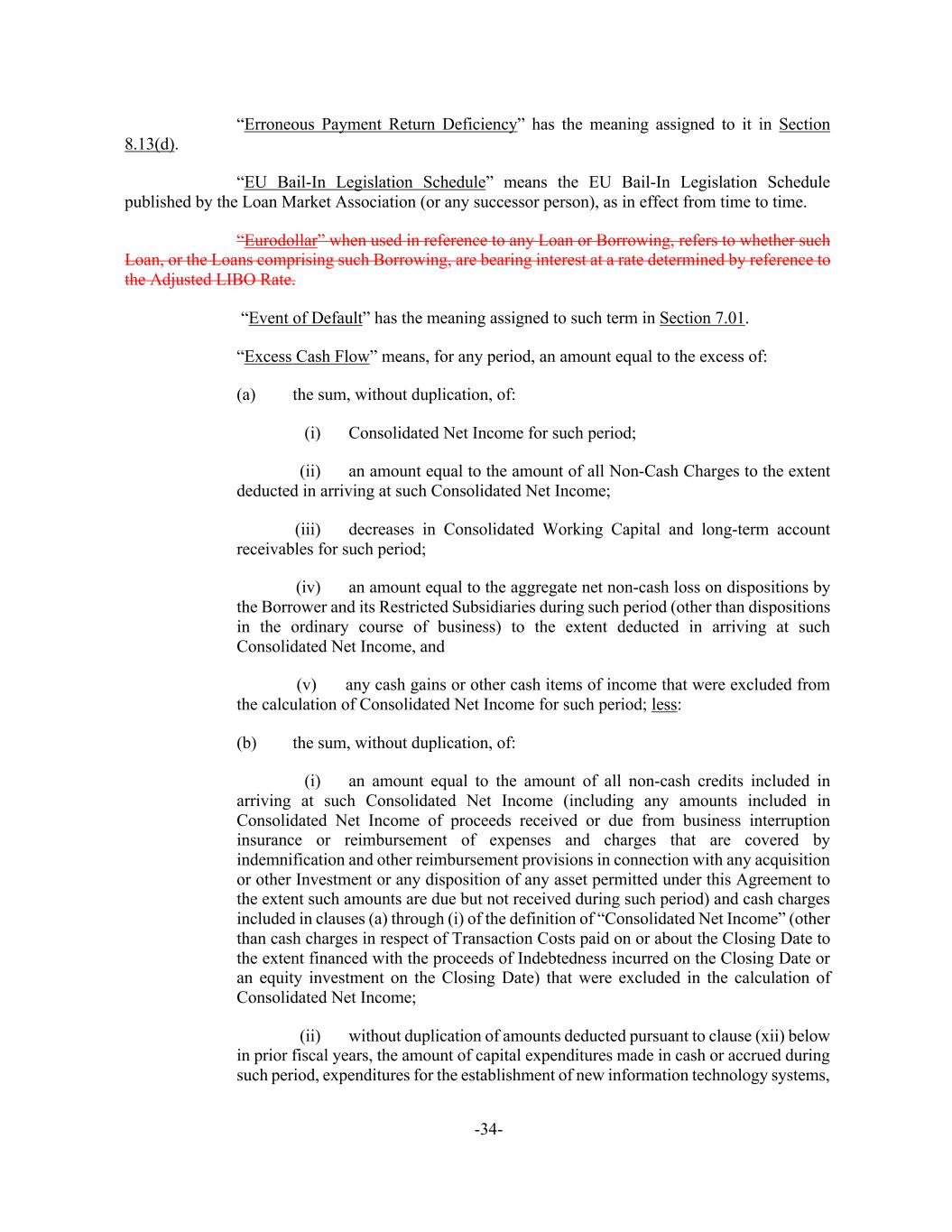 -34- “Erroneous Payment Return Deficiency” has the meaning assigned to it in Section 8.13(d). “EU Bail-In Legislation Schedule” means the EU Bail-In Legislation Schedule published by the Loan Market Association (or any successor person), as in effect from time to time. “Eurodollar” when used in reference to any Loan or Borrowing, refers to whether such Loan, or the Loans comprising such Borrowing, are bearing interest at a rate determined by reference to the Adjusted LIBO Rate. “Event of Default” has the meaning assigned to such term in Section 7.01. “Excess Cash Flow” means, for any period, an amount equal to the excess of: (a) the sum, without duplication, of: (i) Consolidated Net Income for such period; (ii) an amount equal to the amount of all Non-Cash Charges to the extent deducted in arriving at such Consolidated Net Income; (iii) decreases in Consolidated Working Capital and long-term account receivables for such period; (iv) an amount equal to the aggregate net non-cash loss on dispositions by the Borrower and its Restricted Subsidiaries during such period (other than dispositions in the ordinary course of business) to the extent deducted in arriving at such Consolidated Net Income, and (v) any cash gains or other cash items of income that were excluded from the calculation of Consolidated Net Income for such period; less: (b) the sum, without duplication, of: (i) an amount equal to the amount of all non-cash credits included in arriving at such Consolidated Net Income (including any amounts included in Consolidated Net Income of proceeds received or due from business interruption insurance or reimbursement of expenses and charges that are covered by indemnification and other reimbursement provisions in connection with any acquisition or other Investment or any disposition of any asset permitted under this Agreement to the extent such amounts are due but not received during such period) and cash charges included in clauses (a) through (i) of the definition of “Consolidated Net Income” (other than cash charges in respect of Transaction Costs paid on or about the Closing Date to the extent financed with the proceeds of Indebtedness incurred on the Closing Date or an equity investment on the Closing Date) that were excluded in the calculation of Consolidated Net Income; (ii) without duplication of amounts deducted pursuant to clause (xii) below in prior fiscal years, the amount of capital expenditures made in cash or accrued during such period, expenditures for the establishment of new information technology systems,