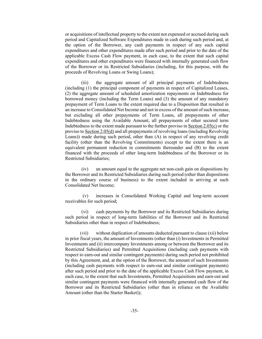 -35- or acquisitions of intellectual property to the extent not expensed or accrued during such period and Capitalized Software Expenditures made in cash during such period and, at the option of the Borrower, any cash payments in respect of any such capital expenditures and other expenditures made after such period and prior to the date of the applicable Excess Cash Flow payment, in each case, to the extent that such capital expenditures and other expenditures were financed with internally generated cash flow of the Borrower or its Restricted Subsidiaries (including, for this purpose, with the proceeds of Revolving Loans or Swing Loans); (iii) the aggregate amount of all principal payments of Indebtedness (including (1) the principal component of payments in respect of Capitalized Leases, (2) the aggregate amount of scheduled amortization repayments on Indebtedness for borrowed money (including the Term Loans) and (3) the amount of any mandatory prepayment of Term Loans to the extent required due to a Disposition that resulted in an increase to Consolidated Net Income and not in excess of the amount of such increase, but excluding all other prepayments of Term Loans, all prepayments of other Indebtedness using the Available Amount, all prepayments of other secured term Indebtedness to the extent made pursuant to the further proviso in Section 2.05(c) or the proviso to Section 2.05(d) and all prepayments of revolving loans (including Revolving Loans)) made during such period, other than (A) in respect of any revolving credit facility (other than the Revolving Commitments) except to the extent there is an equivalent permanent reduction in commitments thereunder and (B) to the extent financed with the proceeds of other long-term Indebtedness of the Borrower or its Restricted Subsidiaries; (iv) an amount equal to the aggregate net non-cash gain on dispositions by the Borrower and its Restricted Subsidiaries during such period (other than dispositions in the ordinary course of business) to the extent included in arriving at such Consolidated Net Income; (v) increases in Consolidated Working Capital and long-term account receivables for such period; (vi) cash payments by the Borrower and its Restricted Subsidiaries during such period in respect of long-term liabilities of the Borrower and its Restricted Subsidiaries other than in respect of Indebtedness; (vii) without duplication of amounts deducted pursuant to clause (xii) below in prior fiscal years, the amount of Investments (other than (i) Investments in Permitted Investments and (ii) intercompany Investments among or between the Borrower and its Restricted Subsidiaries) and Permitted Acquisitions (including cash payments with respect to earn-out and similar contingent payments) during such period not prohibited by this Agreement, and, at the option of the Borrower, the amount of such Investments (including cash payments with respect to earn-out and similar contingent payments) after such period and prior to the date of the applicable Excess Cash Flow payment, in each case, to the extent that such Investments, Permitted Acquisitions and earn-out and similar contingent payments were financed with internally generated cash flow of the Borrower and its Restricted Subsidiaries (other than in reliance on the Available Amount (other than the Starter Basket));