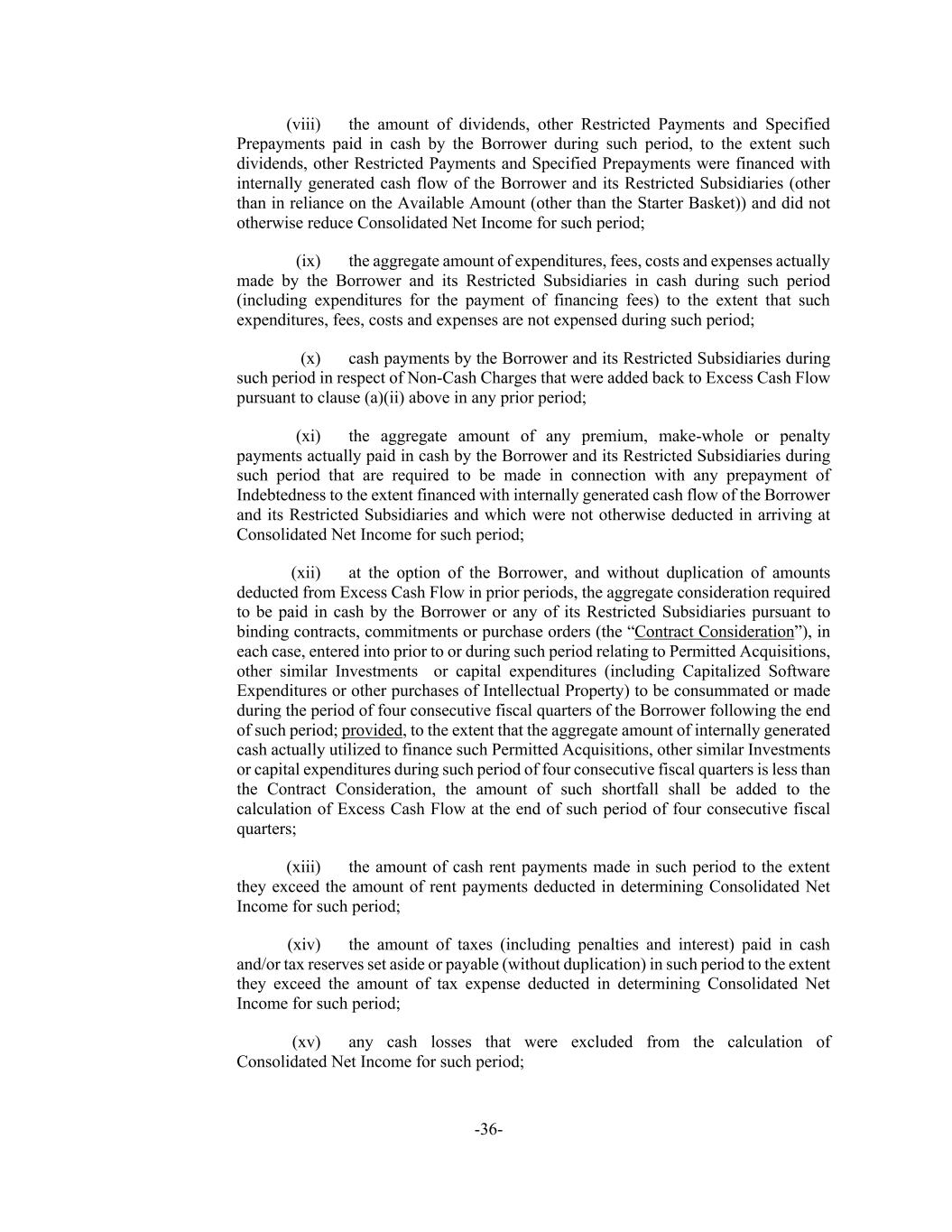 -36- (viii) the amount of dividends, other Restricted Payments and Specified Prepayments paid in cash by the Borrower during such period, to the extent such dividends, other Restricted Payments and Specified Prepayments were financed with internally generated cash flow of the Borrower and its Restricted Subsidiaries (other than in reliance on the Available Amount (other than the Starter Basket)) and did not otherwise reduce Consolidated Net Income for such period; (ix) the aggregate amount of expenditures, fees, costs and expenses actually made by the Borrower and its Restricted Subsidiaries in cash during such period (including expenditures for the payment of financing fees) to the extent that such expenditures, fees, costs and expenses are not expensed during such period; (x) cash payments by the Borrower and its Restricted Subsidiaries during such period in respect of Non-Cash Charges that were added back to Excess Cash Flow pursuant to clause (a)(ii) above in any prior period; (xi) the aggregate amount of any premium, make-whole or penalty payments actually paid in cash by the Borrower and its Restricted Subsidiaries during such period that are required to be made in connection with any prepayment of Indebtedness to the extent financed with internally generated cash flow of the Borrower and its Restricted Subsidiaries and which were not otherwise deducted in arriving at Consolidated Net Income for such period; (xii) at the option of the Borrower, and without duplication of amounts deducted from Excess Cash Flow in prior periods, the aggregate consideration required to be paid in cash by the Borrower or any of its Restricted Subsidiaries pursuant to binding contracts, commitments or purchase orders (the “Contract Consideration”), in each case, entered into prior to or during such period relating to Permitted Acquisitions, other similar Investments or capital expenditures (including Capitalized Software Expenditures or other purchases of Intellectual Property) to be consummated or made during the period of four consecutive fiscal quarters of the Borrower following the end of such period; provided, to the extent that the aggregate amount of internally generated cash actually utilized to finance such Permitted Acquisitions, other similar Investments or capital expenditures during such period of four consecutive fiscal quarters is less than the Contract Consideration, the amount of such shortfall shall be added to the calculation of Excess Cash Flow at the end of such period of four consecutive fiscal quarters; (xiii) the amount of cash rent payments made in such period to the extent they exceed the amount of rent payments deducted in determining Consolidated Net Income for such period; (xiv) the amount of taxes (including penalties and interest) paid in cash and/or tax reserves set aside or payable (without duplication) in such period to the extent they exceed the amount of tax expense deducted in determining Consolidated Net Income for such period; (xv) any cash losses that were excluded from the calculation of Consolidated Net Income for such period;