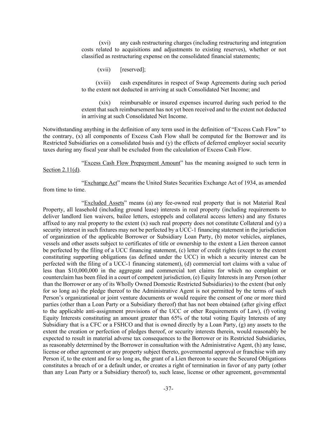 -37- (xvi) any cash restructuring charges (including restructuring and integration costs related to acquisitions and adjustments to existing reserves), whether or not classified as restructuring expense on the consolidated financial statements; (xvii) [reserved]; (xviii) cash expenditures in respect of Swap Agreements during such period to the extent not deducted in arriving at such Consolidated Net Income; and (xix) reimbursable or insured expenses incurred during such period to the extent that such reimbursement has not yet been received and to the extent not deducted in arriving at such Consolidated Net Income. Notwithstanding anything in the definition of any term used in the definition of “Excess Cash Flow” to the contrary, (x) all components of Excess Cash Flow shall be computed for the Borrower and its Restricted Subsidiaries on a consolidated basis and (y) the effects of deferred employer social security taxes during any fiscal year shall be excluded from the calculation of Excess Cash Flow. “Excess Cash Flow Prepayment Amount” has the meaning assigned to such term in Section 2.11(d). “Exchange Act” means the United States Securities Exchange Act of 1934, as amended from time to time. “Excluded Assets” means (a) any fee-owned real property that is not Material Real Property, all leasehold (including ground lease) interests in real property (including requirements to deliver landlord lien waivers, bailee letters, estoppels and collateral access letters) and any fixtures affixed to any real property to the extent (x) such real property does not constitute Collateral and (y) a security interest in such fixtures may not be perfected by a UCC-1 financing statement in the jurisdiction of organization of the applicable Borrower or Subsidiary Loan Party, (b) motor vehicles, airplanes, vessels and other assets subject to certificates of title or ownership to the extent a Lien thereon cannot be perfected by the filing of a UCC financing statement, (c) letter of credit rights (except to the extent constituting supporting obligations (as defined under the UCC) in which a security interest can be perfected with the filing of a UCC-1 financing statement), (d) commercial tort claims with a value of less than $10,000,000 in the aggregate and commercial tort claims for which no complaint or counterclaim has been filed in a court of competent jurisdiction, (e) Equity Interests in any Person (other than the Borrower or any of its Wholly Owned Domestic Restricted Subsidiaries) to the extent (but only for so long as) the pledge thereof to the Administrative Agent is not permitted by the terms of such Person’s organizational or joint venture documents or would require the consent of one or more third parties (other than a Loan Party or a Subsidiary thereof) that has not been obtained (after giving effect to the applicable anti-assignment provisions of the UCC or other Requirements of Law), (f) voting Equity Interests constituting an amount greater than 65% of the total voting Equity Interests of any Subsidiary that is a CFC or a FSHCO and that is owned directly by a Loan Party, (g) any assets to the extent the creation or perfection of pledges thereof, or security interests therein, would reasonably be expected to result in material adverse tax consequences to the Borrower or its Restricted Subsidiaries, as reasonably determined by the Borrower in consultation with the Administrative Agent, (h) any lease, license or other agreement or any property subject thereto, governmental approval or franchise with any Person if, to the extent and for so long as, the grant of a Lien thereon to secure the Secured Obligations constitutes a breach of or a default under, or creates a right of termination in favor of any party (other than any Loan Party or a Subsidiary thereof) to, such lease, license or other agreement, governmental