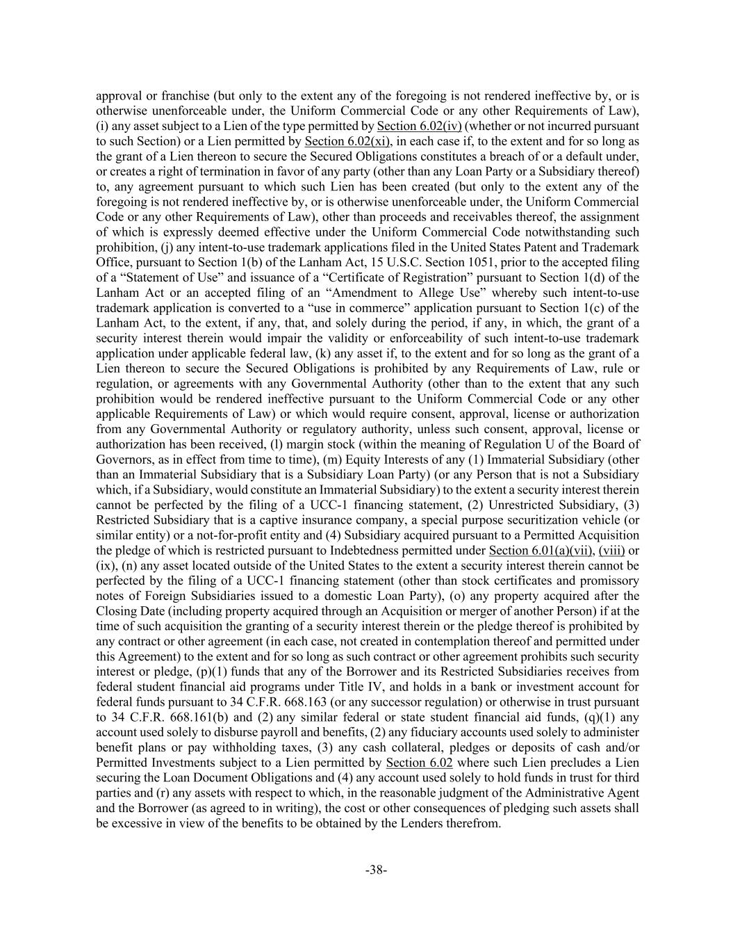 -38- approval or franchise (but only to the extent any of the foregoing is not rendered ineffective by, or is otherwise unenforceable under, the Uniform Commercial Code or any other Requirements of Law), (i) any asset subject to a Lien of the type permitted by Section 6.02(iv) (whether or not incurred pursuant to such Section) or a Lien permitted by Section 6.02(xi), in each case if, to the extent and for so long as the grant of a Lien thereon to secure the Secured Obligations constitutes a breach of or a default under, or creates a right of termination in favor of any party (other than any Loan Party or a Subsidiary thereof) to, any agreement pursuant to which such Lien has been created (but only to the extent any of the foregoing is not rendered ineffective by, or is otherwise unenforceable under, the Uniform Commercial Code or any other Requirements of Law), other than proceeds and receivables thereof, the assignment of which is expressly deemed effective under the Uniform Commercial Code notwithstanding such prohibition, (j) any intent-to-use trademark applications filed in the United States Patent and Trademark Office, pursuant to Section 1(b) of the Lanham Act, 15 U.S.C. Section 1051, prior to the accepted filing of a “Statement of Use” and issuance of a “Certificate of Registration” pursuant to Section 1(d) of the Lanham Act or an accepted filing of an “Amendment to Allege Use” whereby such intent-to-use trademark application is converted to a “use in commerce” application pursuant to Section 1(c) of the Lanham Act, to the extent, if any, that, and solely during the period, if any, in which, the grant of a security interest therein would impair the validity or enforceability of such intent-to-use trademark application under applicable federal law, (k) any asset if, to the extent and for so long as the grant of a Lien thereon to secure the Secured Obligations is prohibited by any Requirements of Law, rule or regulation, or agreements with any Governmental Authority (other than to the extent that any such prohibition would be rendered ineffective pursuant to the Uniform Commercial Code or any other applicable Requirements of Law) or which would require consent, approval, license or authorization from any Governmental Authority or regulatory authority, unless such consent, approval, license or authorization has been received, (l) margin stock (within the meaning of Regulation U of the Board of Governors, as in effect from time to time), (m) Equity Interests of any (1) Immaterial Subsidiary (other than an Immaterial Subsidiary that is a Subsidiary Loan Party) (or any Person that is not a Subsidiary which, if a Subsidiary, would constitute an Immaterial Subsidiary) to the extent a security interest therein cannot be perfected by the filing of a UCC-1 financing statement, (2) Unrestricted Subsidiary, (3) Restricted Subsidiary that is a captive insurance company, a special purpose securitization vehicle (or similar entity) or a not-for-profit entity and (4) Subsidiary acquired pursuant to a Permitted Acquisition the pledge of which is restricted pursuant to Indebtedness permitted under Section 6.01(a)(vii), (viii) or (ix), (n) any asset located outside of the United States to the extent a security interest therein cannot be perfected by the filing of a UCC-1 financing statement (other than stock certificates and promissory notes of Foreign Subsidiaries issued to a domestic Loan Party), (o) any property acquired after the Closing Date (including property acquired through an Acquisition or merger of another Person) if at the time of such acquisition the granting of a security interest therein or the pledge thereof is prohibited by any contract or other agreement (in each case, not created in contemplation thereof and permitted under this Agreement) to the extent and for so long as such contract or other agreement prohibits such security interest or pledge, (p)(1) funds that any of the Borrower and its Restricted Subsidiaries receives from federal student financial aid programs under Title IV, and holds in a bank or investment account for federal funds pursuant to 34 C.F.R. 668.163 (or any successor regulation) or otherwise in trust pursuant to 34 C.F.R. 668.161(b) and (2) any similar federal or state student financial aid funds, (q)(1) any account used solely to disburse payroll and benefits, (2) any fiduciary accounts used solely to administer benefit plans or pay withholding taxes, (3) any cash collateral, pledges or deposits of cash and/or Permitted Investments subject to a Lien permitted by Section 6.02 where such Lien precludes a Lien securing the Loan Document Obligations and (4) any account used solely to hold funds in trust for third parties and (r) any assets with respect to which, in the reasonable judgment of the Administrative Agent and the Borrower (as agreed to in writing), the cost or other consequences of pledging such assets shall be excessive in view of the benefits to be obtained by the Lenders therefrom.