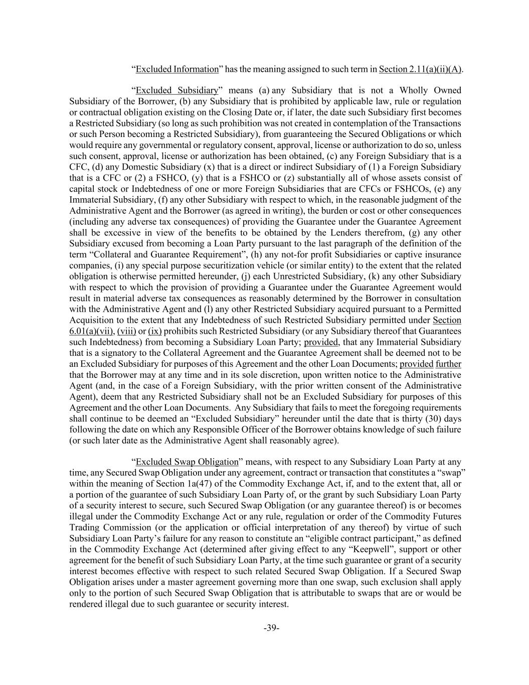 -39- “Excluded Information” has the meaning assigned to such term in Section 2.11(a)(ii)(A). “Excluded Subsidiary” means (a) any Subsidiary that is not a Wholly Owned Subsidiary of the Borrower, (b) any Subsidiary that is prohibited by applicable law, rule or regulation or contractual obligation existing on the Closing Date or, if later, the date such Subsidiary first becomes a Restricted Subsidiary (so long as such prohibition was not created in contemplation of the Transactions or such Person becoming a Restricted Subsidiary), from guaranteeing the Secured Obligations or which would require any governmental or regulatory consent, approval, license or authorization to do so, unless such consent, approval, license or authorization has been obtained, (c) any Foreign Subsidiary that is a CFC, (d) any Domestic Subsidiary (x) that is a direct or indirect Subsidiary of (1) a Foreign Subsidiary that is a CFC or (2) a FSHCO, (y) that is a FSHCO or (z) substantially all of whose assets consist of capital stock or Indebtedness of one or more Foreign Subsidiaries that are CFCs or FSHCOs, (e) any Immaterial Subsidiary, (f) any other Subsidiary with respect to which, in the reasonable judgment of the Administrative Agent and the Borrower (as agreed in writing), the burden or cost or other consequences (including any adverse tax consequences) of providing the Guarantee under the Guarantee Agreement shall be excessive in view of the benefits to be obtained by the Lenders therefrom, (g) any other Subsidiary excused from becoming a Loan Party pursuant to the last paragraph of the definition of the term “Collateral and Guarantee Requirement”, (h) any not-for profit Subsidiaries or captive insurance companies, (i) any special purpose securitization vehicle (or similar entity) to the extent that the related obligation is otherwise permitted hereunder, (j) each Unrestricted Subsidiary, (k) any other Subsidiary with respect to which the provision of providing a Guarantee under the Guarantee Agreement would result in material adverse tax consequences as reasonably determined by the Borrower in consultation with the Administrative Agent and (l) any other Restricted Subsidiary acquired pursuant to a Permitted Acquisition to the extent that any Indebtedness of such Restricted Subsidiary permitted under Section 6.01(a)(vii), (viii) or (ix) prohibits such Restricted Subsidiary (or any Subsidiary thereof that Guarantees such Indebtedness) from becoming a Subsidiary Loan Party; provided, that any Immaterial Subsidiary that is a signatory to the Collateral Agreement and the Guarantee Agreement shall be deemed not to be an Excluded Subsidiary for purposes of this Agreement and the other Loan Documents; provided further that the Borrower may at any time and in its sole discretion, upon written notice to the Administrative Agent (and, in the case of a Foreign Subsidiary, with the prior written consent of the Administrative Agent), deem that any Restricted Subsidiary shall not be an Excluded Subsidiary for purposes of this Agreement and the other Loan Documents. Any Subsidiary that fails to meet the foregoing requirements shall continue to be deemed an “Excluded Subsidiary” hereunder until the date that is thirty (30) days following the date on which any Responsible Officer of the Borrower obtains knowledge of such failure (or such later date as the Administrative Agent shall reasonably agree). “Excluded Swap Obligation” means, with respect to any Subsidiary Loan Party at any time, any Secured Swap Obligation under any agreement, contract or transaction that constitutes a “swap” within the meaning of Section 1a(47) of the Commodity Exchange Act, if, and to the extent that, all or a portion of the guarantee of such Subsidiary Loan Party of, or the grant by such Subsidiary Loan Party of a security interest to secure, such Secured Swap Obligation (or any guarantee thereof) is or becomes illegal under the Commodity Exchange Act or any rule, regulation or order of the Commodity Futures Trading Commission (or the application or official interpretation of any thereof) by virtue of such Subsidiary Loan Party’s failure for any reason to constitute an “eligible contract participant,” as defined in the Commodity Exchange Act (determined after giving effect to any “Keepwell”, support or other agreement for the benefit of such Subsidiary Loan Party, at the time such guarantee or grant of a security interest becomes effective with respect to such related Secured Swap Obligation. If a Secured Swap Obligation arises under a master agreement governing more than one swap, such exclusion shall apply only to the portion of such Secured Swap Obligation that is attributable to swaps that are or would be rendered illegal due to such guarantee or security interest.