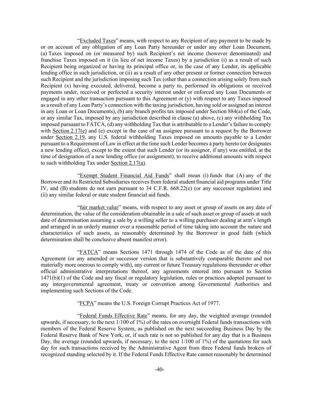 -40- “Excluded Taxes” means, with respect to any Recipient of any payment to be made by or on account of any obligation of any Loan Party hereunder or under any other Loan Document, (a) Taxes imposed on (or measured by) such Recipient’s net income (however denominated) and franchise Taxes imposed on it (in lieu of net income Taxes) by a jurisdiction (i) as a result of such Recipient being organized or having its principal office or, in the case of any Lender, its applicable lending office in such jurisdiction, or (ii) as a result of any other present or former connection between such Recipient and the jurisdiction imposing such Tax (other than a connection arising solely from such Recipient (x) having executed, delivered, become a party to, performed its obligations or received payments under, received or perfected a security interest under or enforced any Loan Documents or engaged in any other transaction pursuant to this Agreement or (y) with respect to any Taxes imposed as a result of any Loan Party’s connection with the taxing jurisdiction, having sold or assigned an interest in any Loan or Loan Documents), (b) any branch profits tax imposed under Section 884(a) of the Code, or any similar Tax, imposed by any jurisdiction described in clause (a) above, (c) any withholding Tax imposed pursuant to FATCA, (d) any withholding Tax that is attributable to a Lender’s failure to comply with Section 2.17(e) and (e) except in the case of an assignee pursuant to a request by the Borrower under Section 2.19, any U.S. federal withholding Taxes imposed on amounts payable to a Lender pursuant to a Requirement of Law in effect at the time such Lender becomes a party hereto (or designates a new lending office), except to the extent that such Lender (or its assignor, if any) was entitled, at the time of designation of a new lending office (or assignment), to receive additional amounts with respect to such withholding Tax under Section 2.17(a). “Exempt Student Financial Aid Funds” shall mean (i) funds that (A) any of the Borrower and its Restricted Subsidiaries receives from federal student financial aid programs under Title IV, and (B) students do not earn pursuant to 34 C.F.R. 668.22(e) (or any successor regulation) and (ii) any similar federal or state student financial aid funds. “fair market value” means, with respect to any asset or group of assets on any date of determination, the value of the consideration obtainable in a sale of such asset or group of assets at such date of determination assuming a sale by a willing seller to a willing purchaser dealing at arm’s length and arranged in an orderly manner over a reasonable period of time taking into account the nature and characteristics of such assets, as reasonably determined by the Borrower in good faith (which determination shall be conclusive absent manifest error). “FATCA” means Sections 1471 through 1474 of the Code as of the date of this Agreement (or any amended or successor version that is substantively comparable thereto and not materially more onerous to comply with), any current or future Treasury regulations thereunder or other official administrative interpretations thereof, any agreements entered into pursuant to Section 1471(b)(1) of the Code and any fiscal or regulatory legislation, rules or practices adopted pursuant to any intergovernmental agreement, treaty or convention among Governmental Authorities and implementing such Sections of the Code. “FCPA” means the U.S. Foreign Corrupt Practices Act of 1977. “Federal Funds Effective Rate” means, for any day, the weighted average (rounded upwards, if necessary, to the next 1/100 of 1%) of the rates on overnight Federal funds transactions with members of the Federal Reserve System, as published on the next succeeding Business Day by the Federal Reserve Bank of New York, or, if such rate is not so published for any day that is a Business Day, the average (rounded upwards, if necessary, to the next 1/100 of 1%) of the quotations for such day for such transactions received by the Administrative Agent from three Federal funds brokers of recognized standing selected by it. If the Federal Funds Effective Rate cannot reasonably be determined