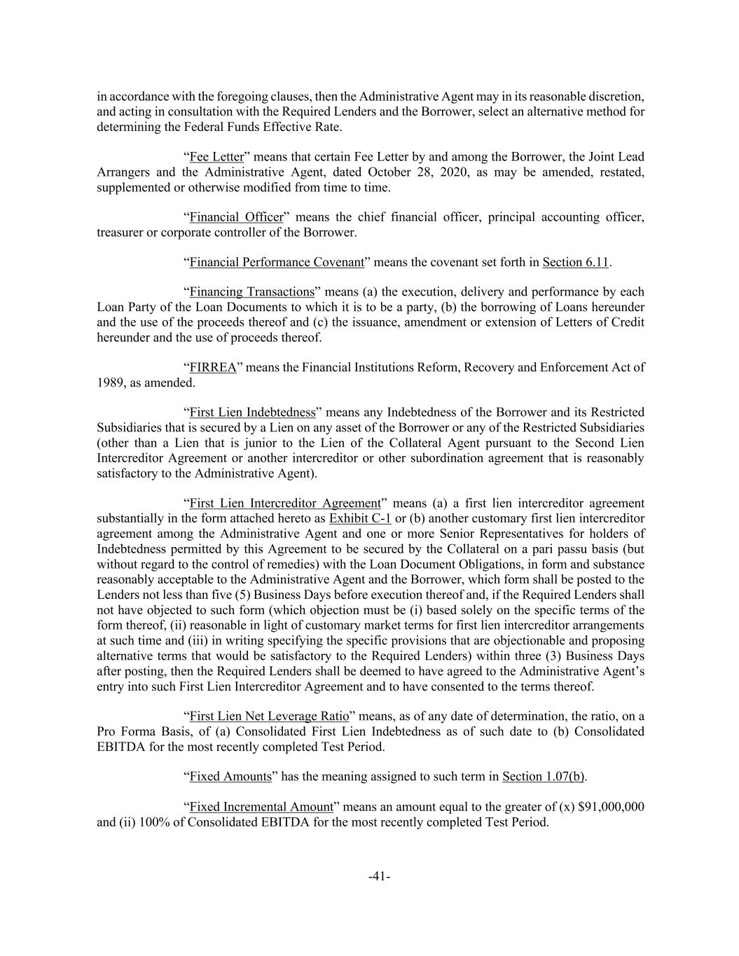 -41- in accordance with the foregoing clauses, then the Administrative Agent may in its reasonable discretion, and acting in consultation with the Required Lenders and the Borrower, select an alternative method for determining the Federal Funds Effective Rate. “Fee Letter” means that certain Fee Letter by and among the Borrower, the Joint Lead Arrangers and the Administrative Agent, dated October 28, 2020, as may be amended, restated, supplemented or otherwise modified from time to time. “Financial Officer” means the chief financial officer, principal accounting officer, treasurer or corporate controller of the Borrower. “Financial Performance Covenant” means the covenant set forth in Section 6.11. “Financing Transactions” means (a) the execution, delivery and performance by each Loan Party of the Loan Documents to which it is to be a party, (b) the borrowing of Loans hereunder and the use of the proceeds thereof and (c) the issuance, amendment or extension of Letters of Credit hereunder and the use of proceeds thereof. “FIRREA” means the Financial Institutions Reform, Recovery and Enforcement Act of 1989, as amended. “First Lien Indebtedness” means any Indebtedness of the Borrower and its Restricted Subsidiaries that is secured by a Lien on any asset of the Borrower or any of the Restricted Subsidiaries (other than a Lien that is junior to the Lien of the Collateral Agent pursuant to the Second Lien Intercreditor Agreement or another intercreditor or other subordination agreement that is reasonably satisfactory to the Administrative Agent). “First Lien Intercreditor Agreement” means (a) a first lien intercreditor agreement substantially in the form attached hereto as Exhibit C-1 or (b) another customary first lien intercreditor agreement among the Administrative Agent and one or more Senior Representatives for holders of Indebtedness permitted by this Agreement to be secured by the Collateral on a pari passu basis (but without regard to the control of remedies) with the Loan Document Obligations, in form and substance reasonably acceptable to the Administrative Agent and the Borrower, which form shall be posted to the Lenders not less than five (5) Business Days before execution thereof and, if the Required Lenders shall not have objected to such form (which objection must be (i) based solely on the specific terms of the form thereof, (ii) reasonable in light of customary market terms for first lien intercreditor arrangements at such time and (iii) in writing specifying the specific provisions that are objectionable and proposing alternative terms that would be satisfactory to the Required Lenders) within three (3) Business Days after posting, then the Required Lenders shall be deemed to have agreed to the Administrative Agent’s entry into such First Lien Intercreditor Agreement and to have consented to the terms thereof. “First Lien Net Leverage Ratio” means, as of any date of determination, the ratio, on a Pro Forma Basis, of (a) Consolidated First Lien Indebtedness as of such date to (b) Consolidated EBITDA for the most recently completed Test Period. “Fixed Amounts” has the meaning assigned to such term in Section 1.07(b). “Fixed Incremental Amount” means an amount equal to the greater of (x) $91,000,000 and (ii) 100% of Consolidated EBITDA for the most recently completed Test Period.