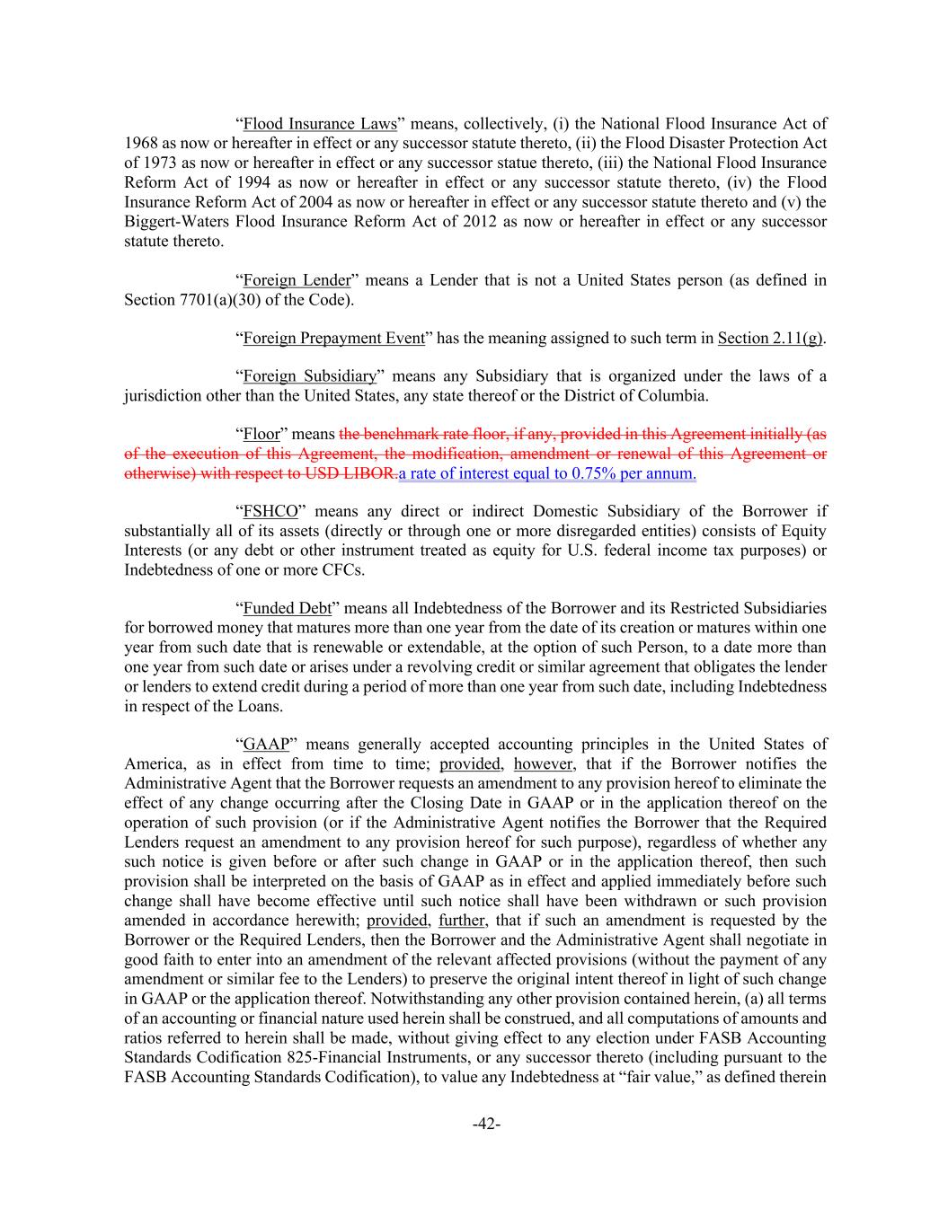 -42- “Flood Insurance Laws” means, collectively, (i) the National Flood Insurance Act of 1968 as now or hereafter in effect or any successor statute thereto, (ii) the Flood Disaster Protection Act of 1973 as now or hereafter in effect or any successor statue thereto, (iii) the National Flood Insurance Reform Act of 1994 as now or hereafter in effect or any successor statute thereto, (iv) the Flood Insurance Reform Act of 2004 as now or hereafter in effect or any successor statute thereto and (v) the Biggert-Waters Flood Insurance Reform Act of 2012 as now or hereafter in effect or any successor statute thereto. “Foreign Lender” means a Lender that is not a United States person (as defined in Section 7701(a)(30) of the Code). “Foreign Prepayment Event” has the meaning assigned to such term in Section 2.11(g). “Foreign Subsidiary” means any Subsidiary that is organized under the laws of a jurisdiction other than the United States, any state thereof or the District of Columbia. “Floor” means the benchmark rate floor, if any, provided in this Agreement initially (as of the execution of this Agreement, the modification, amendment or renewal of this Agreement or otherwise) with respect to USD LIBOR.a rate of interest equal to 0.75% per annum. “FSHCO” means any direct or indirect Domestic Subsidiary of the Borrower if substantially all of its assets (directly or through one or more disregarded entities) consists of Equity Interests (or any debt or other instrument treated as equity for U.S. federal income tax purposes) or Indebtedness of one or more CFCs. “Funded Debt” means all Indebtedness of the Borrower and its Restricted Subsidiaries for borrowed money that matures more than one year from the date of its creation or matures within one year from such date that is renewable or extendable, at the option of such Person, to a date more than one year from such date or arises under a revolving credit or similar agreement that obligates the lender or lenders to extend credit during a period of more than one year from such date, including Indebtedness in respect of the Loans. “GAAP” means generally accepted accounting principles in the United States of America, as in effect from time to time; provided, however, that if the Borrower notifies the Administrative Agent that the Borrower requests an amendment to any provision hereof to eliminate the effect of any change occurring after the Closing Date in GAAP or in the application thereof on the operation of such provision (or if the Administrative Agent notifies the Borrower that the Required Lenders request an amendment to any provision hereof for such purpose), regardless of whether any such notice is given before or after such change in GAAP or in the application thereof, then such provision shall be interpreted on the basis of GAAP as in effect and applied immediately before such change shall have become effective until such notice shall have been withdrawn or such provision amended in accordance herewith; provided, further, that if such an amendment is requested by the Borrower or the Required Lenders, then the Borrower and the Administrative Agent shall negotiate in good faith to enter into an amendment of the relevant affected provisions (without the payment of any amendment or similar fee to the Lenders) to preserve the original intent thereof in light of such change in GAAP or the application thereof. Notwithstanding any other provision contained herein, (a) all terms of an accounting or financial nature used herein shall be construed, and all computations of amounts and ratios referred to herein shall be made, without giving effect to any election under FASB Accounting Standards Codification 825-Financial Instruments, or any successor thereto (including pursuant to the FASB Accounting Standards Codification), to value any Indebtedness at “fair value,” as defined therein