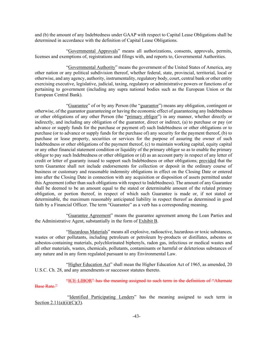 -43- and (b) the amount of any Indebtedness under GAAP with respect to Capital Lease Obligations shall be determined in accordance with the definition of Capital Lease Obligations. “Governmental Approvals” means all authorizations, consents, approvals, permits, licenses and exemptions of, registrations and filings with, and reports to, Governmental Authorities. “Governmental Authority” means the government of the United States of America, any other nation or any political subdivision thereof, whether federal, state, provincial, territorial, local or otherwise, and any agency, authority, instrumentality, regulatory body, court, central bank or other entity exercising executive, legislative, judicial, taxing, regulatory or administrative powers or functions of or pertaining to government (including any supra national bodies such as the European Union or the European Central Bank). “Guarantee” of or by any Person (the “guarantor”) means any obligation, contingent or otherwise, of the guarantor guaranteeing or having the economic effect of guaranteeing any Indebtedness or other obligations of any other Person (the “primary obligor”) in any manner, whether directly or indirectly, and including any obligation of the guarantor, direct or indirect, (a) to purchase or pay (or advance or supply funds for the purchase or payment of) such Indebtedness or other obligations or to purchase (or to advance or supply funds for the purchase of) any security for the payment thereof, (b) to purchase or lease property, securities or services for the purpose of assuring the owner of such Indebtedness or other obligations of the payment thereof, (c) to maintain working capital, equity capital or any other financial statement condition or liquidity of the primary obligor so as to enable the primary obligor to pay such Indebtedness or other obligation or (d) as an account party in respect of any letter of credit or letter of guaranty issued to support such Indebtedness or other obligations; provided that the term Guarantee shall not include endorsements for collection or deposit in the ordinary course of business or customary and reasonable indemnity obligations in effect on the Closing Date or entered into after the Closing Date in connection with any acquisition or disposition of assets permitted under this Agreement (other than such obligations with respect to Indebtedness). The amount of any Guarantee shall be deemed to be an amount equal to the stated or determinable amount of the related primary obligation, or portion thereof, in respect of which such Guarantee is made or, if not stated or determinable, the maximum reasonably anticipated liability in respect thereof as determined in good faith by a Financial Officer. The term “Guarantee” as a verb has a corresponding meaning. “Guarantee Agreement” means the guarantee agreement among the Loan Parties and the Administrative Agent, substantially in the form of Exhibit B. “Hazardous Materials” means all explosive, radioactive, hazardous or toxic substances, wastes or other pollutants, including petroleum or petroleum by-products or distillates, asbestos or asbestos-containing materials, polychlorinated biphenyls, radon gas, infectious or medical wastes and all other materials, wastes, chemicals, pollutants, contaminants or harmful or deleterious substances of any nature and in any form regulated pursuant to any Environmental Law. “Higher Education Act” shall mean the Higher Education Act of 1965, as amended, 20 U.S.C. Ch. 28, and any amendments or successor statutes thereto. “ICE LIBOR” has the meaning assigned to such term in the definition of “Alternate Base Rate.” “Identified Participating Lenders” has the meaning assigned to such term in Section 2.11(a)(ii)(C)(3).