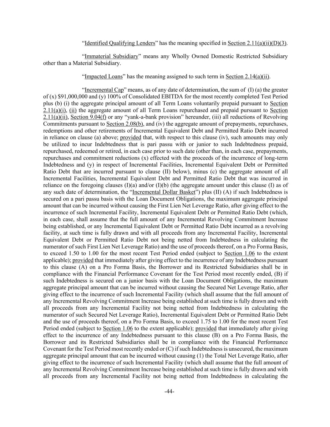 -44- “Identified Qualifying Lenders” has the meaning specified in Section 2.11(a)(ii)(D)(3). “Immaterial Subsidiary” means any Wholly Owned Domestic Restricted Subsidiary other than a Material Subsidiary. “Impacted Loans” has the meaning assigned to such term in Section 2.14(a)(ii). “Incremental Cap” means, as of any date of determination, the sum of (I) (a) the greater of (x) $91,000,000 and (y) 100% of Consolidated EBITDA for the most recently completed Test Period plus (b) (i) the aggregate principal amount of all Term Loans voluntarily prepaid pursuant to Section 2.11(a)(i), (ii) the aggregate amount of all Term Loans repurchased and prepaid pursuant to Section 2.11(a)(ii), Section 9.04(f) or any “yank-a-bank provision” hereunder, (iii) all reductions of Revolving Commitments pursuant to Section 2.08(b), and (iv) the aggregate amount of prepayments, repurchases, redemptions and other retirements of Incremental Equivalent Debt and Permitted Ratio Debt incurred in reliance on clause (a) above; provided that, with respect to this clause (iv), such amounts may only be utilized to incur Indebtedness that is pari passu with or junior to such Indebtedness prepaid, repurchased, redeemed or retired, in each case prior to such date (other than, in each case, prepayments, repurchases and commitment reductions (x) effected with the proceeds of the incurrence of long-term Indebtedness and (y) in respect of Incremental Facilities, Incremental Equivalent Debt or Permitted Ratio Debt that are incurred pursuant to clause (II) below), minus (c) the aggregate amount of all Incremental Facilities, Incremental Equivalent Debt and Permitted Ratio Debt that was incurred in reliance on the foregoing clauses (I)(a) and/or (I)(b) (the aggregate amount under this clause (I) as of any such date of determination, the “Incremental Dollar Basket”) plus (II) (A) if such Indebtedness is secured on a pari passu basis with the Loan Document Obligations, the maximum aggregate principal amount that can be incurred without causing the First Lien Net Leverage Ratio, after giving effect to the incurrence of such Incremental Facility, Incremental Equivalent Debt or Permitted Ratio Debt (which, in each case, shall assume that the full amount of any Incremental Revolving Commitment Increase being established, or any Incremental Equivalent Debt or Permitted Ratio Debt incurred as a revolving facility, at such time is fully drawn and with all proceeds from any Incremental Facility, Incremental Equivalent Debt or Permitted Ratio Debt not being netted from Indebtedness in calculating the numerator of such First Lien Net Leverage Ratio) and the use of proceeds thereof, on a Pro Forma Basis, to exceed 1.50 to 1.00 for the most recent Test Period ended (subject to Section 1.06 to the extent applicable); provided that immediately after giving effect to the incurrence of any Indebtedness pursuant to this clause (A) on a Pro Forma Basis, the Borrower and its Restricted Subsidiaries shall be in compliance with the Financial Performance Covenant for the Test Period most recently ended, (B) if such Indebtedness is secured on a junior basis with the Loan Document Obligations, the maximum aggregate principal amount that can be incurred without causing the Secured Net Leverage Ratio, after giving effect to the incurrence of such Incremental Facility (which shall assume that the full amount of any Incremental Revolving Commitment Increase being established at such time is fully drawn and with all proceeds from any Incremental Facility not being netted from Indebtedness in calculating the numerator of such Secured Net Leverage Ratio), Incremental Equivalent Debt or Permitted Ratio Debt and the use of proceeds thereof, on a Pro Forma Basis, to exceed 1.75 to 1.00 for the most recent Test Period ended (subject to Section 1.06 to the extent applicable); provided that immediately after giving effect to the incurrence of any Indebtedness pursuant to this clause (B) on a Pro Forma Basis, the Borrower and its Restricted Subsidiaries shall be in compliance with the Financial Performance Covenant for the Test Period most recently ended or (C) if such Indebtedness is unsecured, the maximum aggregate principal amount that can be incurred without causing (1) the Total Net Leverage Ratio, after giving effect to the incurrence of such Incremental Facility (which shall assume that the full amount of any Incremental Revolving Commitment Increase being established at such time is fully drawn and with all proceeds from any Incremental Facility not being netted from Indebtedness in calculating the