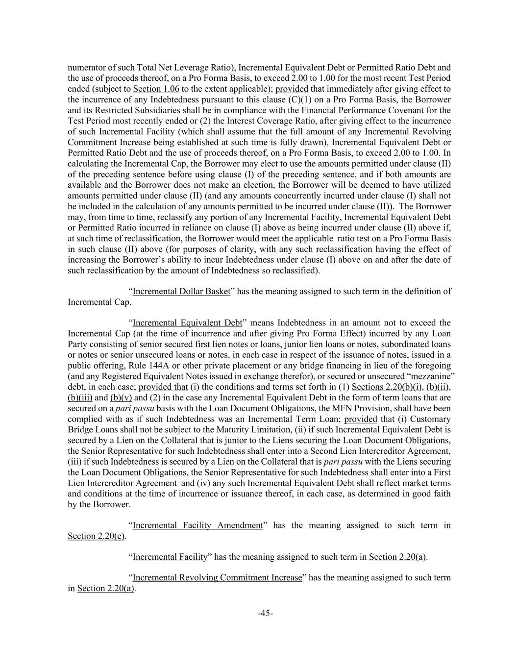 -45- numerator of such Total Net Leverage Ratio), Incremental Equivalent Debt or Permitted Ratio Debt and the use of proceeds thereof, on a Pro Forma Basis, to exceed 2.00 to 1.00 for the most recent Test Period ended (subject to Section 1.06 to the extent applicable); provided that immediately after giving effect to the incurrence of any Indebtedness pursuant to this clause (C)(1) on a Pro Forma Basis, the Borrower and its Restricted Subsidiaries shall be in compliance with the Financial Performance Covenant for the Test Period most recently ended or (2) the Interest Coverage Ratio, after giving effect to the incurrence of such Incremental Facility (which shall assume that the full amount of any Incremental Revolving Commitment Increase being established at such time is fully drawn), Incremental Equivalent Debt or Permitted Ratio Debt and the use of proceeds thereof, on a Pro Forma Basis, to exceed 2.00 to 1.00. In calculating the Incremental Cap, the Borrower may elect to use the amounts permitted under clause (II) of the preceding sentence before using clause (I) of the preceding sentence, and if both amounts are available and the Borrower does not make an election, the Borrower will be deemed to have utilized amounts permitted under clause (II) (and any amounts concurrently incurred under clause (I) shall not be included in the calculation of any amounts permitted to be incurred under clause (II)). The Borrower may, from time to time, reclassify any portion of any Incremental Facility, Incremental Equivalent Debt or Permitted Ratio incurred in reliance on clause (I) above as being incurred under clause (II) above if, at such time of reclassification, the Borrower would meet the applicable ratio test on a Pro Forma Basis in such clause (II) above (for purposes of clarity, with any such reclassification having the effect of increasing the Borrower’s ability to incur Indebtedness under clause (I) above on and after the date of such reclassification by the amount of Indebtedness so reclassified). “Incremental Dollar Basket” has the meaning assigned to such term in the definition of Incremental Cap. “Incremental Equivalent Debt” means Indebtedness in an amount not to exceed the Incremental Cap (at the time of incurrence and after giving Pro Forma Effect) incurred by any Loan Party consisting of senior secured first lien notes or loans, junior lien loans or notes, subordinated loans or notes or senior unsecured loans or notes, in each case in respect of the issuance of notes, issued in a public offering, Rule 144A or other private placement or any bridge financing in lieu of the foregoing (and any Registered Equivalent Notes issued in exchange therefor), or secured or unsecured “mezzanine” debt, in each case; provided that (i) the conditions and terms set forth in (1) Sections 2.20(b)(i), (b)(ii), (b)(iii) and (b)(v) and (2) in the case any Incremental Equivalent Debt in the form of term loans that are secured on a pari passu basis with the Loan Document Obligations, the MFN Provision, shall have been complied with as if such Indebtedness was an Incremental Term Loan; provided that (i) Customary Bridge Loans shall not be subject to the Maturity Limitation, (ii) if such Incremental Equivalent Debt is secured by a Lien on the Collateral that is junior to the Liens securing the Loan Document Obligations, the Senior Representative for such Indebtedness shall enter into a Second Lien Intercreditor Agreement, (iii) if such Indebtedness is secured by a Lien on the Collateral that is pari passu with the Liens securing the Loan Document Obligations, the Senior Representative for such Indebtedness shall enter into a First Lien Intercreditor Agreement and (iv) any such Incremental Equivalent Debt shall reflect market terms and conditions at the time of incurrence or issuance thereof, in each case, as determined in good faith by the Borrower. “Incremental Facility Amendment” has the meaning assigned to such term in Section 2.20(e). “Incremental Facility” has the meaning assigned to such term in Section 2.20(a). “Incremental Revolving Commitment Increase” has the meaning assigned to such term in Section 2.20(a).