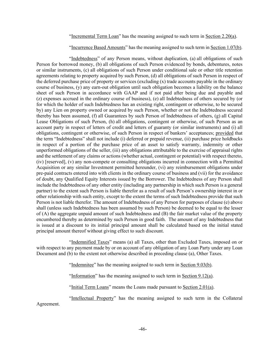 -46- “Incremental Term Loan” has the meaning assigned to such term in Section 2.20(a). “Incurrence Based Amounts” has the meaning assigned to such term in Section 1.07(b). “Indebtedness” of any Person means, without duplication, (a) all obligations of such Person for borrowed money, (b) all obligations of such Person evidenced by bonds, debentures, notes or similar instruments, (c) all obligations of such Person under conditional sale or other title retention agreements relating to property acquired by such Person, (d) all obligations of such Person in respect of the deferred purchase price of property or services (excluding (x) trade accounts payable in the ordinary course of business, (y) any earn-out obligation until such obligation becomes a liability on the balance sheet of such Person in accordance with GAAP and if not paid after being due and payable and (z) expenses accrued in the ordinary course of business), (e) all Indebtedness of others secured by (or for which the holder of such Indebtedness has an existing right, contingent or otherwise, to be secured by) any Lien on property owned or acquired by such Person, whether or not the Indebtedness secured thereby has been assumed, (f) all Guarantees by such Person of Indebtedness of others, (g) all Capital Lease Obligations of such Person, (h) all obligations, contingent or otherwise, of such Person as an account party in respect of letters of credit and letters of guaranty (or similar instruments) and (i) all obligations, contingent or otherwise, of such Person in respect of bankers’ acceptances; provided that the term “Indebtedness” shall not include (i) deferred or prepaid revenue, (ii) purchase price holdbacks in respect of a portion of the purchase price of an asset to satisfy warranty, indemnity or other unperformed obligations of the seller, (iii) any obligations attributable to the exercise of appraisal rights and the settlement of any claims or actions (whether actual, contingent or potential) with respect thereto, (iv) [reserved], (v) any non-compete or consulting obligations incurred in connection with a Permitted Acquisition or any similar Investment permitted hereunder, (vi) any reimbursement obligations under pre-paid contracts entered into with clients in the ordinary course of business and (vii) for the avoidance of doubt, any Qualified Equity Interests issued by the Borrower. The Indebtedness of any Person shall include the Indebtedness of any other entity (including any partnership in which such Person is a general partner) to the extent such Person is liable therefor as a result of such Person’s ownership interest in or other relationship with such entity, except to the extent the terms of such Indebtedness provide that such Person is not liable therefor. The amount of Indebtedness of any Person for purposes of clause (e) above shall (unless such Indebtedness has been assumed by such Person) be deemed to be equal to the lesser of (A) the aggregate unpaid amount of such Indebtedness and (B) the fair market value of the property encumbered thereby as determined by such Person in good faith. The amount of any Indebtedness that is issued at a discount to its initial principal amount shall be calculated based on the initial stated principal amount thereof without giving effect to such discount. “Indemnified Taxes” means (a) all Taxes, other than Excluded Taxes, imposed on or with respect to any payment made by or on account of any obligation of any Loan Party under any Loan Document and (b) to the extent not otherwise described in preceding clause (a), Other Taxes. “Indemnitee” has the meaning assigned to such term in Section 9.03(b). “Information” has the meaning assigned to such term in Section 9.12(a). “Initial Term Loans” means the Loans made pursuant to Section 2.01(a). “Intellectual Property” has the meaning assigned to such term in the Collateral Agreement.