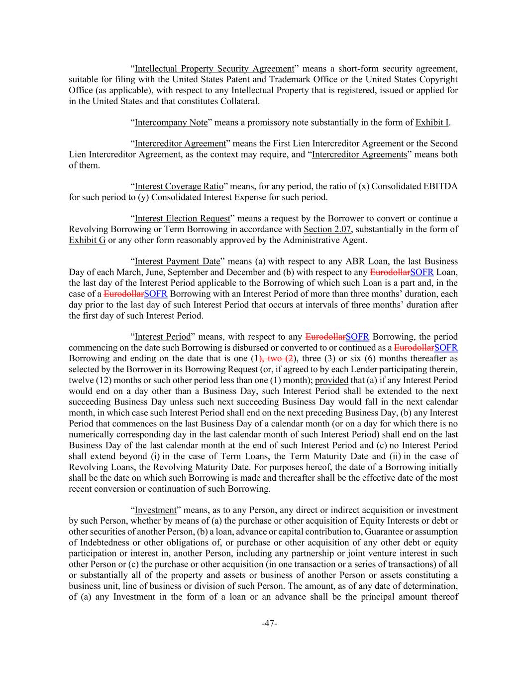 -47- “Intellectual Property Security Agreement” means a short-form security agreement, suitable for filing with the United States Patent and Trademark Office or the United States Copyright Office (as applicable), with respect to any Intellectual Property that is registered, issued or applied for in the United States and that constitutes Collateral. “Intercompany Note” means a promissory note substantially in the form of Exhibit I. “Intercreditor Agreement” means the First Lien Intercreditor Agreement or the Second Lien Intercreditor Agreement, as the context may require, and “Intercreditor Agreements” means both of them. “Interest Coverage Ratio” means, for any period, the ratio of (x) Consolidated EBITDA for such period to (y) Consolidated Interest Expense for such period. “Interest Election Request” means a request by the Borrower to convert or continue a Revolving Borrowing or Term Borrowing in accordance with Section 2.07, substantially in the form of Exhibit G or any other form reasonably approved by the Administrative Agent. “Interest Payment Date” means (a) with respect to any ABR Loan, the last Business Day of each March, June, September and December and (b) with respect to any EurodollarSOFR Loan, the last day of the Interest Period applicable to the Borrowing of which such Loan is a part and, in the case of a EurodollarSOFR Borrowing with an Interest Period of more than three months’ duration, each day prior to the last day of such Interest Period that occurs at intervals of three months’ duration after the first day of such Interest Period. “Interest Period” means, with respect to any EurodollarSOFR Borrowing, the period commencing on the date such Borrowing is disbursed or converted to or continued as a EurodollarSOFR Borrowing and ending on the date that is one (1), two (2), three (3) or six (6) months thereafter as selected by the Borrower in its Borrowing Request (or, if agreed to by each Lender participating therein, twelve (12) months or such other period less than one (1) month); provided that (a) if any Interest Period would end on a day other than a Business Day, such Interest Period shall be extended to the next succeeding Business Day unless such next succeeding Business Day would fall in the next calendar month, in which case such Interest Period shall end on the next preceding Business Day, (b) any Interest Period that commences on the last Business Day of a calendar month (or on a day for which there is no numerically corresponding day in the last calendar month of such Interest Period) shall end on the last Business Day of the last calendar month at the end of such Interest Period and (c) no Interest Period shall extend beyond (i) in the case of Term Loans, the Term Maturity Date and (ii) in the case of Revolving Loans, the Revolving Maturity Date. For purposes hereof, the date of a Borrowing initially shall be the date on which such Borrowing is made and thereafter shall be the effective date of the most recent conversion or continuation of such Borrowing. “Investment” means, as to any Person, any direct or indirect acquisition or investment by such Person, whether by means of (a) the purchase or other acquisition of Equity Interests or debt or other securities of another Person, (b) a loan, advance or capital contribution to, Guarantee or assumption of Indebtedness or other obligations of, or purchase or other acquisition of any other debt or equity participation or interest in, another Person, including any partnership or joint venture interest in such other Person or (c) the purchase or other acquisition (in one transaction or a series of transactions) of all or substantially all of the property and assets or business of another Person or assets constituting a business unit, line of business or division of such Person. The amount, as of any date of determination, of (a) any Investment in the form of a loan or an advance shall be the principal amount thereof