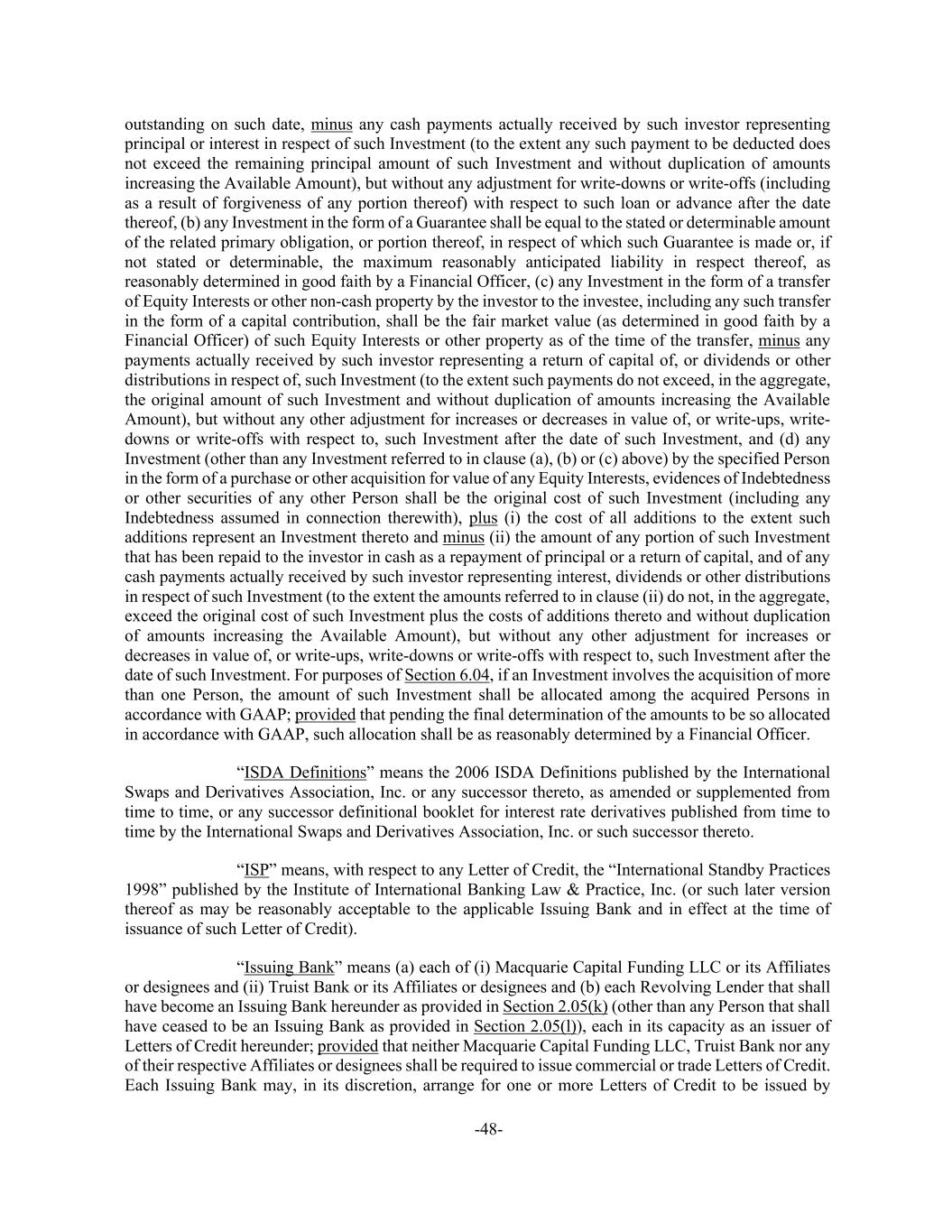 -48- outstanding on such date, minus any cash payments actually received by such investor representing principal or interest in respect of such Investment (to the extent any such payment to be deducted does not exceed the remaining principal amount of such Investment and without duplication of amounts increasing the Available Amount), but without any adjustment for write-downs or write-offs (including as a result of forgiveness of any portion thereof) with respect to such loan or advance after the date thereof, (b) any Investment in the form of a Guarantee shall be equal to the stated or determinable amount of the related primary obligation, or portion thereof, in respect of which such Guarantee is made or, if not stated or determinable, the maximum reasonably anticipated liability in respect thereof, as reasonably determined in good faith by a Financial Officer, (c) any Investment in the form of a transfer of Equity Interests or other non-cash property by the investor to the investee, including any such transfer in the form of a capital contribution, shall be the fair market value (as determined in good faith by a Financial Officer) of such Equity Interests or other property as of the time of the transfer, minus any payments actually received by such investor representing a return of capital of, or dividends or other distributions in respect of, such Investment (to the extent such payments do not exceed, in the aggregate, the original amount of such Investment and without duplication of amounts increasing the Available Amount), but without any other adjustment for increases or decreases in value of, or write-ups, write- downs or write-offs with respect to, such Investment after the date of such Investment, and (d) any Investment (other than any Investment referred to in clause (a), (b) or (c) above) by the specified Person in the form of a purchase or other acquisition for value of any Equity Interests, evidences of Indebtedness or other securities of any other Person shall be the original cost of such Investment (including any Indebtedness assumed in connection therewith), plus (i) the cost of all additions to the extent such additions represent an Investment thereto and minus (ii) the amount of any portion of such Investment that has been repaid to the investor in cash as a repayment of principal or a return of capital, and of any cash payments actually received by such investor representing interest, dividends or other distributions in respect of such Investment (to the extent the amounts referred to in clause (ii) do not, in the aggregate, exceed the original cost of such Investment plus the costs of additions thereto and without duplication of amounts increasing the Available Amount), but without any other adjustment for increases or decreases in value of, or write-ups, write-downs or write-offs with respect to, such Investment after the date of such Investment. For purposes of Section 6.04, if an Investment involves the acquisition of more than one Person, the amount of such Investment shall be allocated among the acquired Persons in accordance with GAAP; provided that pending the final determination of the amounts to be so allocated in accordance with GAAP, such allocation shall be as reasonably determined by a Financial Officer. “ISDA Definitions” means the 2006 ISDA Definitions published by the International Swaps and Derivatives Association, Inc. or any successor thereto, as amended or supplemented from time to time, or any successor definitional booklet for interest rate derivatives published from time to time by the International Swaps and Derivatives Association, Inc. or such successor thereto. “ISP” means, with respect to any Letter of Credit, the “International Standby Practices 1998” published by the Institute of International Banking Law & Practice, Inc. (or such later version thereof as may be reasonably acceptable to the applicable Issuing Bank and in effect at the time of issuance of such Letter of Credit). “Issuing Bank” means (a) each of (i) Macquarie Capital Funding LLC or its Affiliates or designees and (ii) Truist Bank or its Affiliates or designees and (b) each Revolving Lender that shall have become an Issuing Bank hereunder as provided in Section 2.05(k) (other than any Person that shall have ceased to be an Issuing Bank as provided in Section 2.05(l)), each in its capacity as an issuer of Letters of Credit hereunder; provided that neither Macquarie Capital Funding LLC, Truist Bank nor any of their respective Affiliates or designees shall be required to issue commercial or trade Letters of Credit. Each Issuing Bank may, in its discretion, arrange for one or more Letters of Credit to be issued by