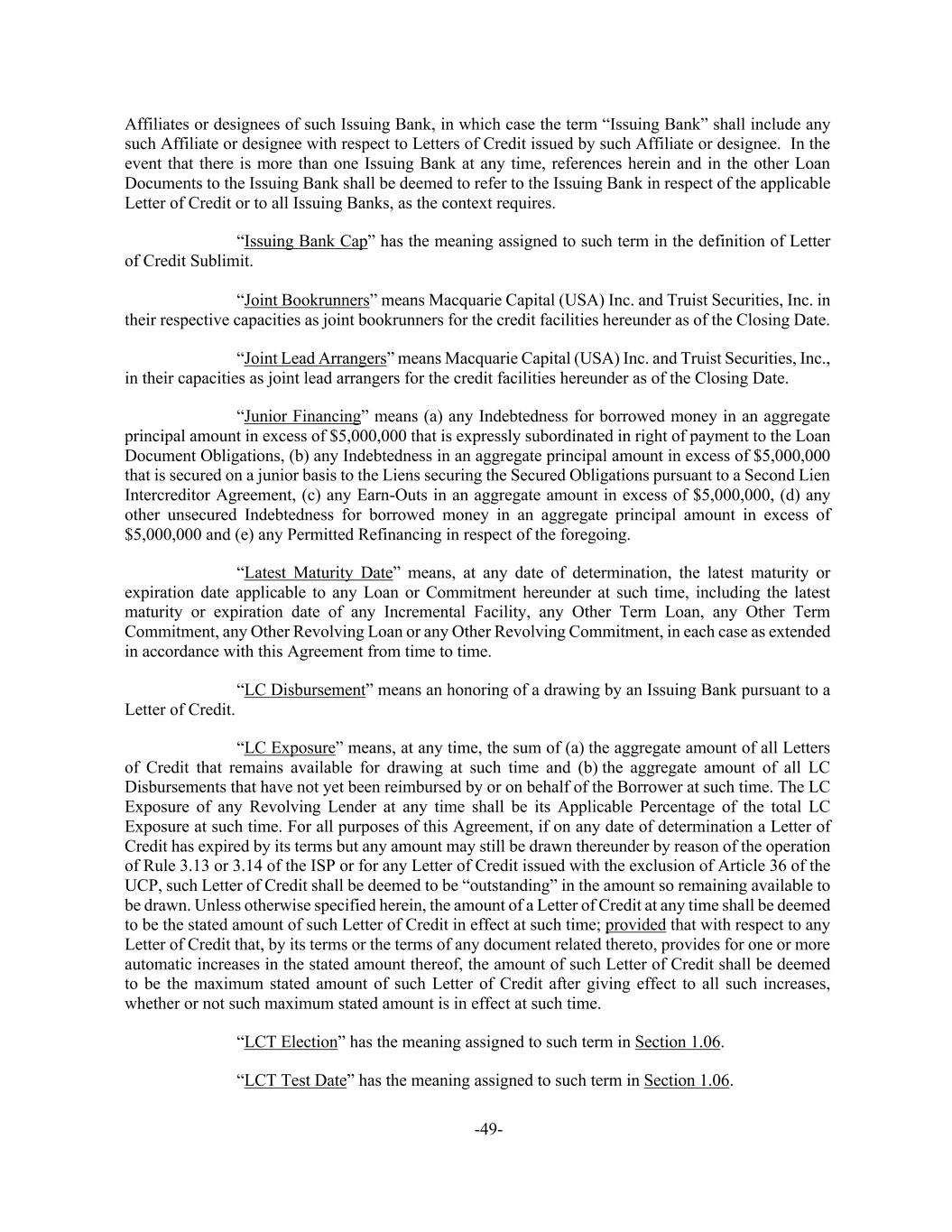 -49- Affiliates or designees of such Issuing Bank, in which case the term “Issuing Bank” shall include any such Affiliate or designee with respect to Letters of Credit issued by such Affiliate or designee. In the event that there is more than one Issuing Bank at any time, references herein and in the other Loan Documents to the Issuing Bank shall be deemed to refer to the Issuing Bank in respect of the applicable Letter of Credit or to all Issuing Banks, as the context requires. “Issuing Bank Cap” has the meaning assigned to such term in the definition of Letter of Credit Sublimit. “Joint Bookrunners” means Macquarie Capital (USA) Inc. and Truist Securities, Inc. in their respective capacities as joint bookrunners for the credit facilities hereunder as of the Closing Date. “Joint Lead Arrangers” means Macquarie Capital (USA) Inc. and Truist Securities, Inc., in their capacities as joint lead arrangers for the credit facilities hereunder as of the Closing Date. “Junior Financing” means (a) any Indebtedness for borrowed money in an aggregate principal amount in excess of $5,000,000 that is expressly subordinated in right of payment to the Loan Document Obligations, (b) any Indebtedness in an aggregate principal amount in excess of $5,000,000 that is secured on a junior basis to the Liens securing the Secured Obligations pursuant to a Second Lien Intercreditor Agreement, (c) any Earn-Outs in an aggregate amount in excess of $5,000,000, (d) any other unsecured Indebtedness for borrowed money in an aggregate principal amount in excess of $5,000,000 and (e) any Permitted Refinancing in respect of the foregoing. “Latest Maturity Date” means, at any date of determination, the latest maturity or expiration date applicable to any Loan or Commitment hereunder at such time, including the latest maturity or expiration date of any Incremental Facility, any Other Term Loan, any Other Term Commitment, any Other Revolving Loan or any Other Revolving Commitment, in each case as extended in accordance with this Agreement from time to time. “LC Disbursement” means an honoring of a drawing by an Issuing Bank pursuant to a Letter of Credit. “LC Exposure” means, at any time, the sum of (a) the aggregate amount of all Letters of Credit that remains available for drawing at such time and (b) the aggregate amount of all LC Disbursements that have not yet been reimbursed by or on behalf of the Borrower at such time. The LC Exposure of any Revolving Lender at any time shall be its Applicable Percentage of the total LC Exposure at such time. For all purposes of this Agreement, if on any date of determination a Letter of Credit has expired by its terms but any amount may still be drawn thereunder by reason of the operation of Rule 3.13 or 3.14 of the ISP or for any Letter of Credit issued with the exclusion of Article 36 of the UCP, such Letter of Credit shall be deemed to be “outstanding” in the amount so remaining available to be drawn. Unless otherwise specified herein, the amount of a Letter of Credit at any time shall be deemed to be the stated amount of such Letter of Credit in effect at such time; provided that with respect to any Letter of Credit that, by its terms or the terms of any document related thereto, provides for one or more automatic increases in the stated amount thereof, the amount of such Letter of Credit shall be deemed to be the maximum stated amount of such Letter of Credit after giving effect to all such increases, whether or not such maximum stated amount is in effect at such time. “LCT Election” has the meaning assigned to such term in Section 1.06. “LCT Test Date” has the meaning assigned to such term in Section 1.06.