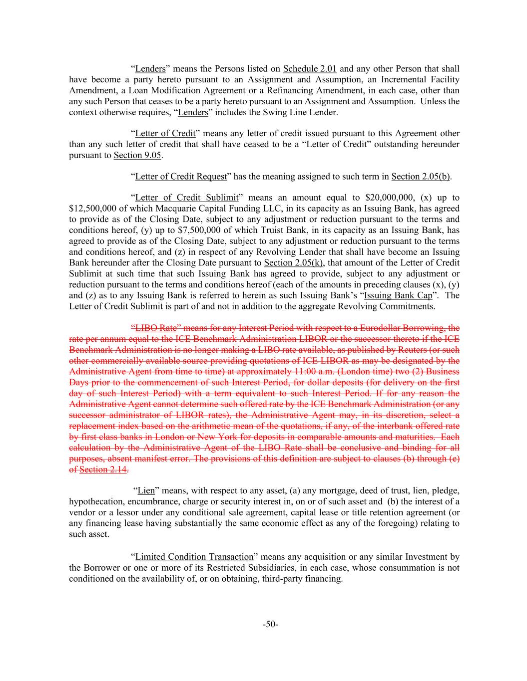 -50- “Lenders” means the Persons listed on Schedule 2.01 and any other Person that shall have become a party hereto pursuant to an Assignment and Assumption, an Incremental Facility Amendment, a Loan Modification Agreement or a Refinancing Amendment, in each case, other than any such Person that ceases to be a party hereto pursuant to an Assignment and Assumption. Unless the context otherwise requires, “Lenders” includes the Swing Line Lender. “Letter of Credit” means any letter of credit issued pursuant to this Agreement other than any such letter of credit that shall have ceased to be a “Letter of Credit” outstanding hereunder pursuant to Section 9.05. “Letter of Credit Request” has the meaning assigned to such term in Section 2.05(b). “Letter of Credit Sublimit” means an amount equal to $20,000,000, (x) up to $12,500,000 of which Macquarie Capital Funding LLC, in its capacity as an Issuing Bank, has agreed to provide as of the Closing Date, subject to any adjustment or reduction pursuant to the terms and conditions hereof, (y) up to $7,500,000 of which Truist Bank, in its capacity as an Issuing Bank, has agreed to provide as of the Closing Date, subject to any adjustment or reduction pursuant to the terms and conditions hereof, and (z) in respect of any Revolving Lender that shall have become an Issuing Bank hereunder after the Closing Date pursuant to Section 2.05(k), that amount of the Letter of Credit Sublimit at such time that such Issuing Bank has agreed to provide, subject to any adjustment or reduction pursuant to the terms and conditions hereof (each of the amounts in preceding clauses (x), (y) and (z) as to any Issuing Bank is referred to herein as such Issuing Bank’s “Issuing Bank Cap”. The Letter of Credit Sublimit is part of and not in addition to the aggregate Revolving Commitments. “LIBO Rate” means for any Interest Period with respect to a Eurodollar Borrowing, the rate per annum equal to the ICE Benchmark Administration LIBOR or the successor thereto if the ICE Benchmark Administration is no longer making a LIBO rate available, as published by Reuters (or such other commercially available source providing quotations of ICE LIBOR as may be designated by the Administrative Agent from time to time) at approximately 11:00 a.m. (London time) two (2) Business Days prior to the commencement of such Interest Period, for dollar deposits (for delivery on the first day of such Interest Period) with a term equivalent to such Interest Period. If for any reason the Administrative Agent cannot determine such offered rate by the ICE Benchmark Administration (or any successor administrator of LIBOR rates), the Administrative Agent may, in its discretion, select a replacement index based on the arithmetic mean of the quotations, if any, of the interbank offered rate by first class banks in London or New York for deposits in comparable amounts and maturities. Each calculation by the Administrative Agent of the LIBO Rate shall be conclusive and binding for all purposes, absent manifest error. The provisions of this definition are subject to clauses (b) through (e) of Section 2.14. “Lien” means, with respect to any asset, (a) any mortgage, deed of trust, lien, pledge, hypothecation, encumbrance, charge or security interest in, on or of such asset and (b) the interest of a vendor or a lessor under any conditional sale agreement, capital lease or title retention agreement (or any financing lease having substantially the same economic effect as any of the foregoing) relating to such asset. “Limited Condition Transaction” means any acquisition or any similar Investment by the Borrower or one or more of its Restricted Subsidiaries, in each case, whose consummation is not conditioned on the availability of, or on obtaining, third-party financing.