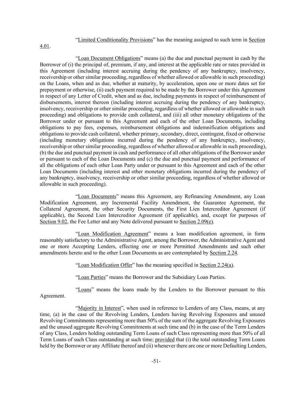 -51- “Limited Conditionality Provisions” has the meaning assigned to such term in Section 4.01. “Loan Document Obligations” means (a) the due and punctual payment in cash by the Borrower of (i) the principal of, premium, if any, and interest at the applicable rate or rates provided in this Agreement (including interest accruing during the pendency of any bankruptcy, insolvency, receivership or other similar proceeding, regardless of whether allowed or allowable in such proceeding) on the Loans, when and as due, whether at maturity, by acceleration, upon one or more dates set for prepayment or otherwise, (ii) each payment required to be made by the Borrower under this Agreement in respect of any Letter of Credit, when and as due, including payments in respect of reimbursement of disbursements, interest thereon (including interest accruing during the pendency of any bankruptcy, insolvency, receivership or other similar proceeding, regardless of whether allowed or allowable in such proceeding) and obligations to provide cash collateral, and (iii) all other monetary obligations of the Borrower under or pursuant to this Agreement and each of the other Loan Documents, including obligations to pay fees, expenses, reimbursement obligations and indemnification obligations and obligations to provide cash collateral, whether primary, secondary, direct, contingent, fixed or otherwise (including monetary obligations incurred during the pendency of any bankruptcy, insolvency, receivership or other similar proceeding, regardless of whether allowed or allowable in such proceeding), (b) the due and punctual payment in cash and performance of all other obligations of the Borrower under or pursuant to each of the Loan Documents and (c) the due and punctual payment and performance of all the obligations of each other Loan Party under or pursuant to this Agreement and each of the other Loan Documents (including interest and other monetary obligations incurred during the pendency of any bankruptcy, insolvency, receivership or other similar proceeding, regardless of whether allowed or allowable in such proceeding). “Loan Documents” means this Agreement, any Refinancing Amendment, any Loan Modification Agreement, any Incremental Facility Amendment, the Guarantee Agreement, the Collateral Agreement, the other Security Documents, the First Lien Intercreditor Agreement (if applicable), the Second Lien Intercreditor Agreement (if applicable), and, except for purposes of Section 9.02, the Fee Letter and any Note delivered pursuant to Section 2.09(e). “Loan Modification Agreement” means a loan modification agreement, in form reasonably satisfactory to the Administrative Agent, among the Borrower, the Administrative Agent and one or more Accepting Lenders, effecting one or more Permitted Amendments and such other amendments hereto and to the other Loan Documents as are contemplated by Section 2.24. “Loan Modification Offer” has the meaning specified in Section 2.24(a). “Loan Parties” means the Borrower and the Subsidiary Loan Parties. “Loans” means the loans made by the Lenders to the Borrower pursuant to this Agreement. “Majority in Interest”, when used in reference to Lenders of any Class, means, at any time, (a) in the case of the Revolving Lenders, Lenders having Revolving Exposures and unused Revolving Commitments representing more than 50% of the sum of the aggregate Revolving Exposures and the unused aggregate Revolving Commitments at such time and (b) in the case of the Term Lenders of any Class, Lenders holding outstanding Term Loans of such Class representing more than 50% of all Term Loans of such Class outstanding at such time; provided that (i) the total outstanding Term Loans held by the Borrower or any Affiliate thereof and (ii) whenever there are one or more Defaulting Lenders,