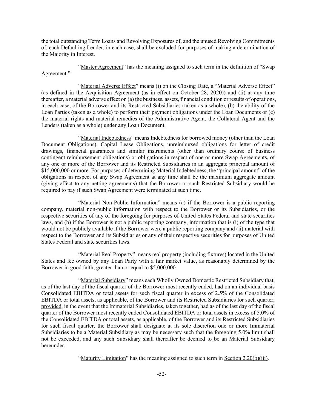 -52- the total outstanding Term Loans and Revolving Exposures of, and the unused Revolving Commitments of, each Defaulting Lender, in each case, shall be excluded for purposes of making a determination of the Majority in Interest. “Master Agreement” has the meaning assigned to such term in the definition of “Swap Agreement.” “Material Adverse Effect” means (i) on the Closing Date, a “Material Adverse Effect” (as defined in the Acquisition Agreement (as in effect on October 28, 2020)) and (ii) at any time thereafter, a material adverse effect on (a) the business, assets, financial condition or results of operations, in each case, of the Borrower and its Restricted Subsidiaries (taken as a whole), (b) the ability of the Loan Parties (taken as a whole) to perform their payment obligations under the Loan Documents or (c) the material rights and material remedies of the Administrative Agent, the Collateral Agent and the Lenders (taken as a whole) under any Loan Document. “Material Indebtedness” means Indebtedness for borrowed money (other than the Loan Document Obligations), Capital Lease Obligations, unreimbursed obligations for letter of credit drawings, financial guarantees and similar instruments (other than ordinary course of business contingent reimbursement obligations) or obligations in respect of one or more Swap Agreements, of any one or more of the Borrower and its Restricted Subsidiaries in an aggregate principal amount of $15,000,000 or more. For purposes of determining Material Indebtedness, the “principal amount” of the obligations in respect of any Swap Agreement at any time shall be the maximum aggregate amount (giving effect to any netting agreements) that the Borrower or such Restricted Subsidiary would be required to pay if such Swap Agreement were terminated at such time. “Material Non-Public Information” means (a) if the Borrower is a public reporting company, material non-public information with respect to the Borrower or its Subsidiaries, or the respective securities of any of the foregoing for purposes of United States Federal and state securities laws, and (b) if the Borrower is not a public reporting company, information that is (i) of the type that would not be publicly available if the Borrower were a public reporting company and (ii) material with respect to the Borrower and its Subsidiaries or any of their respective securities for purposes of United States Federal and state securities laws. “Material Real Property” means real property (including fixtures) located in the United States and fee owned by any Loan Party with a fair market value, as reasonably determined by the Borrower in good faith, greater than or equal to $5,000,000. “Material Subsidiary” means each Wholly Owned Domestic Restricted Subsidiary that, as of the last day of the fiscal quarter of the Borrower most recently ended, had on an individual basis Consolidated EBITDA or total assets for such fiscal quarter in excess of 2.5% of the Consolidated EBITDA or total assets, as applicable, of the Borrower and its Restricted Subsidiaries for such quarter; provided, in the event that the Immaterial Subsidiaries, taken together, had as of the last day of the fiscal quarter of the Borrower most recently ended Consolidated EBITDA or total assets in excess of 5.0% of the Consolidated EBITDA or total assets, as applicable, of the Borrower and its Restricted Subsidiaries for such fiscal quarter, the Borrower shall designate at its sole discretion one or more Immaterial Subsidiaries to be a Material Subsidiary as may be necessary such that the foregoing 5.0% limit shall not be exceeded, and any such Subsidiary shall thereafter be deemed to be an Material Subsidiary hereunder. “Maturity Limitation” has the meaning assigned to such term in Section 2.20(b)(iii).