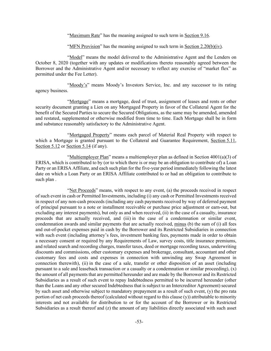 -53- “Maximum Rate” has the meaning assigned to such term in Section 9.16. “MFN Provision” has the meaning assigned to such term in Section 2.20(b)(iv). “Model” means the model delivered to the Administrative Agent and the Lenders on October 8, 2020 (together with any updates or modifications thereto reasonably agreed between the Borrower and the Administrative Agent and/or necessary to reflect any exercise of “market flex” as permitted under the Fee Letter). “Moody’s” means Moody’s Investors Service, Inc. and any successor to its rating agency business. “Mortgage” means a mortgage, deed of trust, assignment of leases and rents or other security document granting a Lien on any Mortgaged Property in favor of the Collateral Agent for the benefit of the Secured Parties to secure the Secured Obligations, as the same may be amended, amended and restated, supplemented or otherwise modified from time to time. Each Mortgage shall be in form and substance reasonably satisfactory to the Administrative Agent. “Mortgaged Property” means each parcel of Material Real Property with respect to which a Mortgage is granted pursuant to the Collateral and Guarantee Requirement, Section 5.11, Section 5.12 or Section 5.14 (if any). “Multiemployer Plan” means a multiemployer plan as defined in Section 4001(a)(3) of ERISA, which is contributed to by (or to which there is or may be an obligation to contribute of) a Loan Party or an ERISA Affiliate, and each such plan for the five-year period immediately following the latest date on which a Loan Party or an ERISA Affiliate contributed to or had an obligation to contribute to such plan . “Net Proceeds” means, with respect to any event, (a) the proceeds received in respect of such event in cash or Permitted Investments, including (i) any cash or Permitted Investments received in respect of any non-cash proceeds (including any cash payments received by way of deferred payment of principal pursuant to a note or installment receivable or purchase price adjustment or earn-out, but excluding any interest payments), but only as and when received, (ii) in the case of a casualty, insurance proceeds that are actually received, and (iii) in the case of a condemnation or similar event, condemnation awards and similar payments that are actually received, minus (b) the sum of (i) all fees and out-of-pocket expenses paid in cash by the Borrower and its Restricted Subsidiaries in connection with such event (including attorney’s fees, investment banking fees, payments made in order to obtain a necessary consent or required by any Requirements of Law, survey costs, title insurance premiums, and related search and recording charges, transfer taxes, deed or mortgage recording taxes, underwriting discounts and commissions, other customary expenses and brokerage, consultant, accountant and other customary fees and costs and expenses in connection with unwinding any Swap Agreement in connection therewith), (ii) in the case of a sale, transfer or other disposition of an asset (including pursuant to a sale and leaseback transaction or a casualty or a condemnation or similar proceeding), (x) the amount of all payments that are permitted hereunder and are made by the Borrower and its Restricted Subsidiaries as a result of such event to repay Indebtedness permitted to be incurred hereunder (other than the Loans and any other secured Indebtedness that is subject to an Intercreditor Agreement) secured by such asset and otherwise subject to mandatory prepayment as a result of such event, (y) the pro rata portion of net cash proceeds thereof (calculated without regard to this clause (y)) attributable to minority interests and not available for distribution to or for the account of the Borrower or its Restricted Subsidiaries as a result thereof and (z) the amount of any liabilities directly associated with such asset