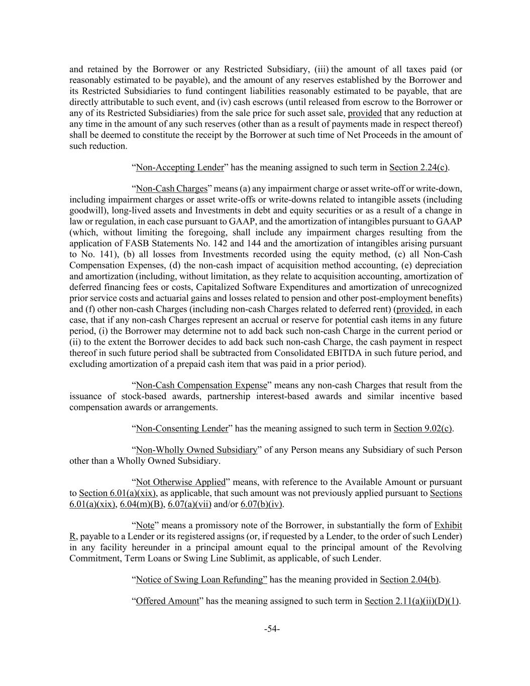 -54- and retained by the Borrower or any Restricted Subsidiary, (iii) the amount of all taxes paid (or reasonably estimated to be payable), and the amount of any reserves established by the Borrower and its Restricted Subsidiaries to fund contingent liabilities reasonably estimated to be payable, that are directly attributable to such event, and (iv) cash escrows (until released from escrow to the Borrower or any of its Restricted Subsidiaries) from the sale price for such asset sale, provided that any reduction at any time in the amount of any such reserves (other than as a result of payments made in respect thereof) shall be deemed to constitute the receipt by the Borrower at such time of Net Proceeds in the amount of such reduction. “Non-Accepting Lender” has the meaning assigned to such term in Section 2.24(c). “Non-Cash Charges” means (a) any impairment charge or asset write-off or write-down, including impairment charges or asset write-offs or write-downs related to intangible assets (including goodwill), long-lived assets and Investments in debt and equity securities or as a result of a change in law or regulation, in each case pursuant to GAAP, and the amortization of intangibles pursuant to GAAP (which, without limiting the foregoing, shall include any impairment charges resulting from the application of FASB Statements No. 142 and 144 and the amortization of intangibles arising pursuant to No. 141), (b) all losses from Investments recorded using the equity method, (c) all Non-Cash Compensation Expenses, (d) the non-cash impact of acquisition method accounting, (e) depreciation and amortization (including, without limitation, as they relate to acquisition accounting, amortization of deferred financing fees or costs, Capitalized Software Expenditures and amortization of unrecognized prior service costs and actuarial gains and losses related to pension and other post-employment benefits) and (f) other non-cash Charges (including non-cash Charges related to deferred rent) (provided, in each case, that if any non-cash Charges represent an accrual or reserve for potential cash items in any future period, (i) the Borrower may determine not to add back such non-cash Charge in the current period or (ii) to the extent the Borrower decides to add back such non-cash Charge, the cash payment in respect thereof in such future period shall be subtracted from Consolidated EBITDA in such future period, and excluding amortization of a prepaid cash item that was paid in a prior period). “Non-Cash Compensation Expense” means any non-cash Charges that result from the issuance of stock-based awards, partnership interest-based awards and similar incentive based compensation awards or arrangements. “Non-Consenting Lender” has the meaning assigned to such term in Section 9.02(c). “Non-Wholly Owned Subsidiary” of any Person means any Subsidiary of such Person other than a Wholly Owned Subsidiary. “Not Otherwise Applied” means, with reference to the Available Amount or pursuant to Section 6.01(a)(xix), as applicable, that such amount was not previously applied pursuant to Sections 6.01(a)(xix), 6.04(m)(B), 6.07(a)(vii) and/or 6.07(b)(iv). “Note” means a promissory note of the Borrower, in substantially the form of Exhibit R, payable to a Lender or its registered assigns (or, if requested by a Lender, to the order of such Lender) in any facility hereunder in a principal amount equal to the principal amount of the Revolving Commitment, Term Loans or Swing Line Sublimit, as applicable, of such Lender. “Notice of Swing Loan Refunding” has the meaning provided in Section 2.04(b). “Offered Amount” has the meaning assigned to such term in Section 2.11(a)(ii)(D)(1).