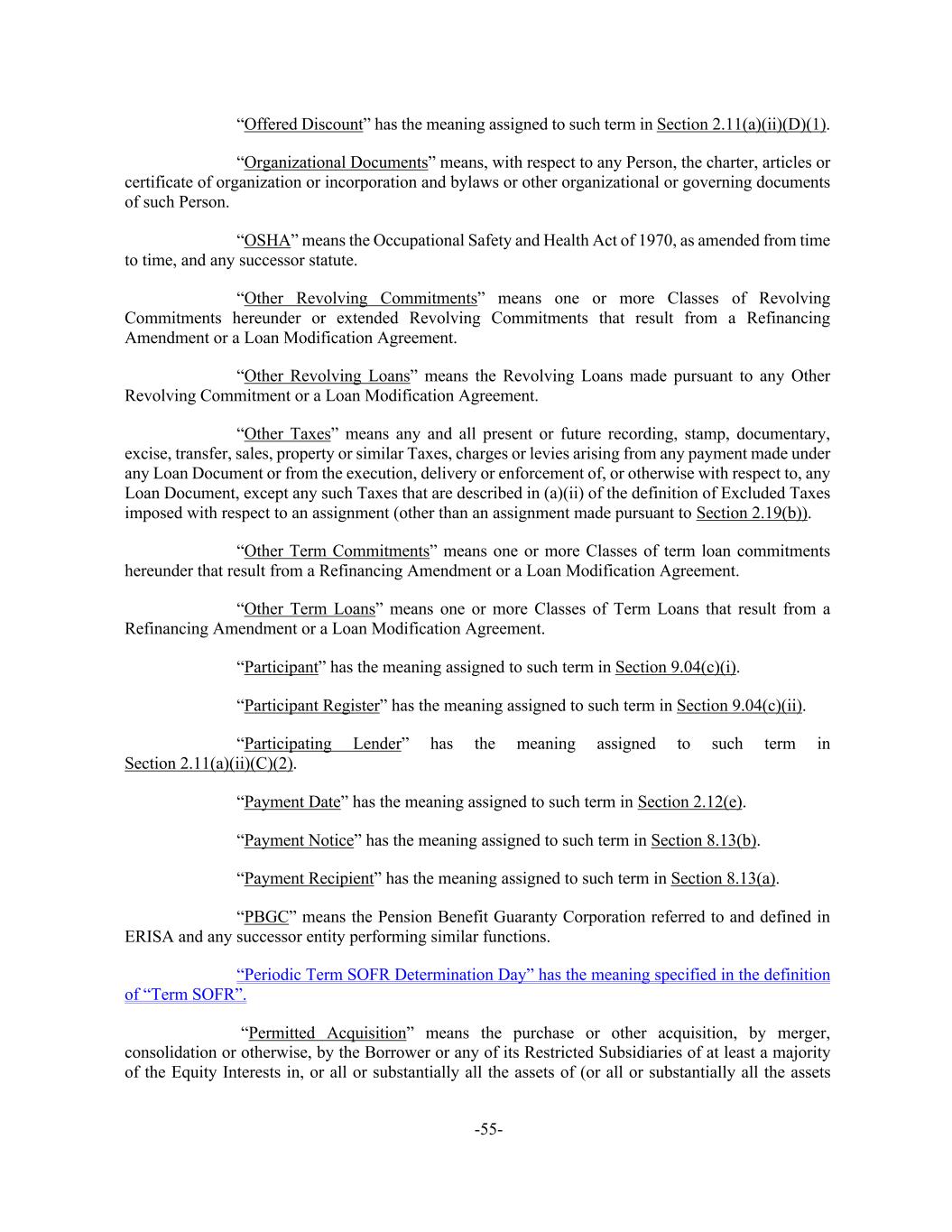 -55- “Offered Discount” has the meaning assigned to such term in Section 2.11(a)(ii)(D)(1). “Organizational Documents” means, with respect to any Person, the charter, articles or certificate of organization or incorporation and bylaws or other organizational or governing documents of such Person. “OSHA” means the Occupational Safety and Health Act of 1970, as amended from time to time, and any successor statute. “Other Revolving Commitments” means one or more Classes of Revolving Commitments hereunder or extended Revolving Commitments that result from a Refinancing Amendment or a Loan Modification Agreement. “Other Revolving Loans” means the Revolving Loans made pursuant to any Other Revolving Commitment or a Loan Modification Agreement. “Other Taxes” means any and all present or future recording, stamp, documentary, excise, transfer, sales, property or similar Taxes, charges or levies arising from any payment made under any Loan Document or from the execution, delivery or enforcement of, or otherwise with respect to, any Loan Document, except any such Taxes that are described in (a)(ii) of the definition of Excluded Taxes imposed with respect to an assignment (other than an assignment made pursuant to Section 2.19(b)). “Other Term Commitments” means one or more Classes of term loan commitments hereunder that result from a Refinancing Amendment or a Loan Modification Agreement. “Other Term Loans” means one or more Classes of Term Loans that result from a Refinancing Amendment or a Loan Modification Agreement. “Participant” has the meaning assigned to such term in Section 9.04(c)(i). “Participant Register” has the meaning assigned to such term in Section 9.04(c)(ii). “Participating Lender” has the meaning assigned to such term in Section 2.11(a)(ii)(C)(2). “Payment Date” has the meaning assigned to such term in Section 2.12(e). “Payment Notice” has the meaning assigned to such term in Section 8.13(b). “Payment Recipient” has the meaning assigned to such term in Section 8.13(a). “PBGC” means the Pension Benefit Guaranty Corporation referred to and defined in ERISA and any successor entity performing similar functions. “Periodic Term SOFR Determination Day” has the meaning specified in the definition of “Term SOFR”. “Permitted Acquisition” means the purchase or other acquisition, by merger, consolidation or otherwise, by the Borrower or any of its Restricted Subsidiaries of at least a majority of the Equity Interests in, or all or substantially all the assets of (or all or substantially all the assets