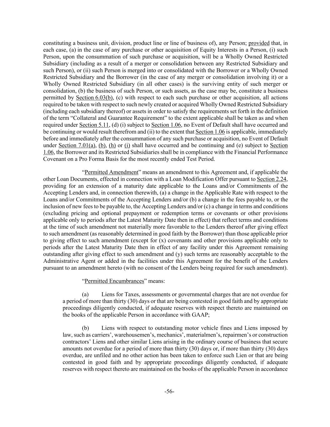 -56- constituting a business unit, division, product line or line of business of), any Person; provided that, in each case, (a) in the case of any purchase or other acquisition of Equity Interests in a Person, (i) such Person, upon the consummation of such purchase or acquisition, will be a Wholly Owned Restricted Subsidiary (including as a result of a merger or consolidation between any Restricted Subsidiary and such Person), or (ii) such Person is merged into or consolidated with the Borrower or a Wholly Owned Restricted Subsidiary and the Borrower (in the case of any merger or consolidation involving it) or a Wholly Owned Restricted Subsidiary (in all other cases) is the surviving entity of such merger or consolidation, (b) the business of such Person, or such assets, as the case may be, constitute a business permitted by Section 6.03(b), (c) with respect to each such purchase or other acquisition, all actions required to be taken with respect to such newly created or acquired Wholly Owned Restricted Subsidiary (including each subsidiary thereof) or assets in order to satisfy the requirements set forth in the definition of the term “Collateral and Guarantee Requirement” to the extent applicable shall be taken as and when required under Section 5.11, (d) (i) subject to Section 1.06, no Event of Default shall have occurred and be continuing or would result therefrom and (ii) to the extent that Section 1.06 is applicable, immediately before and immediately after the consummation of any such purchase or acquisition, no Event of Default under Section 7.01(a), (b), (h) or (i) shall have occurred and be continuing and (e) subject to Section 1.06, the Borrower and its Restricted Subsidiaries shall be in compliance with the Financial Performance Covenant on a Pro Forma Basis for the most recently ended Test Period. “Permitted Amendment” means an amendment to this Agreement and, if applicable the other Loan Documents, effected in connection with a Loan Modification Offer pursuant to Section 2.24, providing for an extension of a maturity date applicable to the Loans and/or Commitments of the Accepting Lenders and, in connection therewith, (a) a change in the Applicable Rate with respect to the Loans and/or Commitments of the Accepting Lenders and/or (b) a change in the fees payable to, or the inclusion of new fees to be payable to, the Accepting Lenders and/or (c) a change in terms and conditions (excluding pricing and optional prepayment or redemption terms or covenants or other provisions applicable only to periods after the Latest Maturity Date then in effect) that reflect terms and conditions at the time of such amendment not materially more favorable to the Lenders thereof after giving effect to such amendment (as reasonably determined in good faith by the Borrower) than those applicable prior to giving effect to such amendment (except for (x) covenants and other provisions applicable only to periods after the Latest Maturity Date then in effect of any facility under this Agreement remaining outstanding after giving effect to such amendment and (y) such terms are reasonably acceptable to the Administrative Agent or added in the facilities under this Agreement for the benefit of the Lenders pursuant to an amendment hereto (with no consent of the Lenders being required for such amendment). “Permitted Encumbrances” means: (a) Liens for Taxes, assessments or governmental charges that are not overdue for a period of more than thirty (30) days or that are being contested in good faith and by appropriate proceedings diligently conducted, if adequate reserves with respect thereto are maintained on the books of the applicable Person in accordance with GAAP; (b) Liens with respect to outstanding motor vehicle fines and Liens imposed by law, such as carriers’, warehousemen’s, mechanics’, materialmen’s, repairmen’s or construction contractors’ Liens and other similar Liens arising in the ordinary course of business that secure amounts not overdue for a period of more than thirty (30) days or, if more than thirty (30) days overdue, are unfiled and no other action has been taken to enforce such Lien or that are being contested in good faith and by appropriate proceedings diligently conducted, if adequate reserves with respect thereto are maintained on the books of the applicable Person in accordance