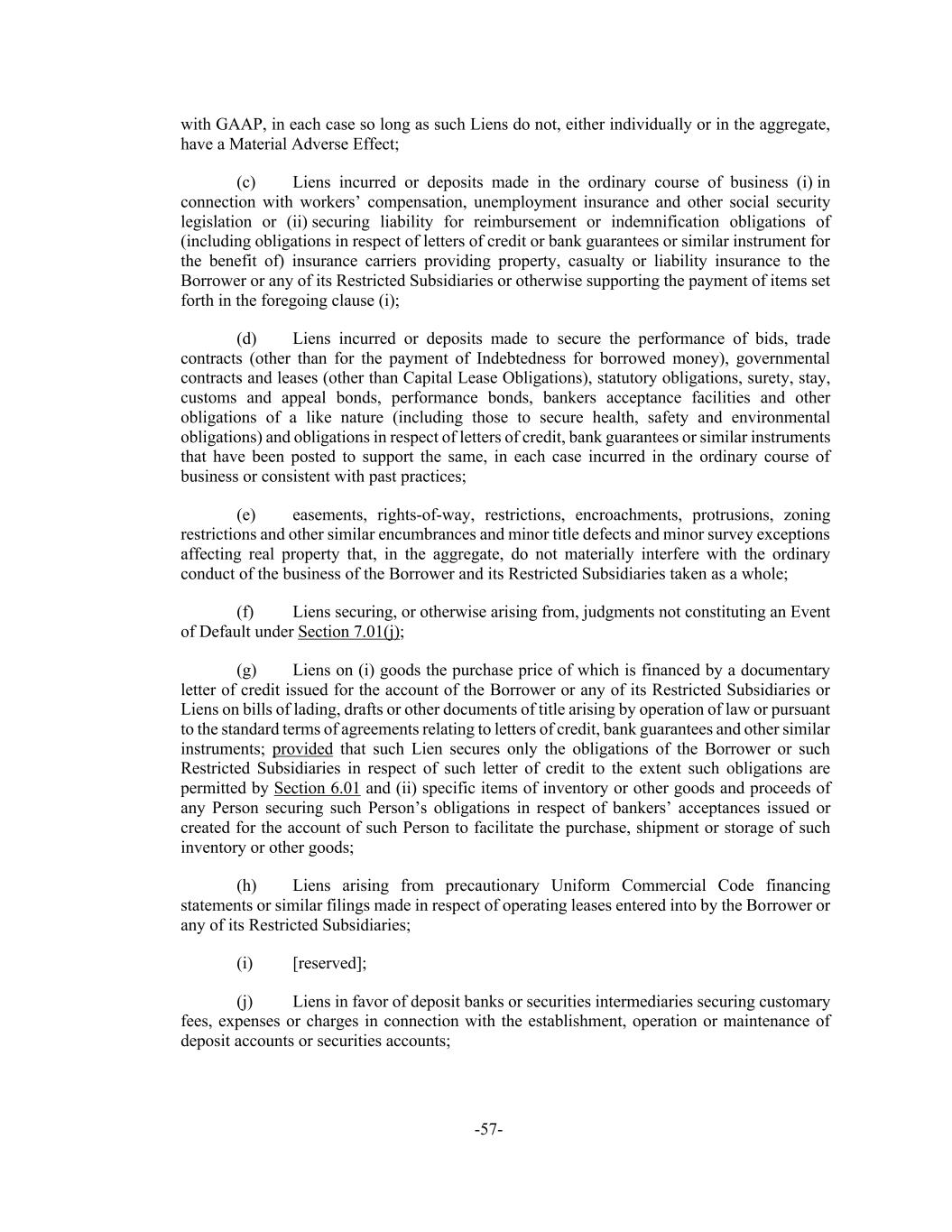 -57- with GAAP, in each case so long as such Liens do not, either individually or in the aggregate, have a Material Adverse Effect; (c) Liens incurred or deposits made in the ordinary course of business (i) in connection with workers’ compensation, unemployment insurance and other social security legislation or (ii) securing liability for reimbursement or indemnification obligations of (including obligations in respect of letters of credit or bank guarantees or similar instrument for the benefit of) insurance carriers providing property, casualty or liability insurance to the Borrower or any of its Restricted Subsidiaries or otherwise supporting the payment of items set forth in the foregoing clause (i); (d) Liens incurred or deposits made to secure the performance of bids, trade contracts (other than for the payment of Indebtedness for borrowed money), governmental contracts and leases (other than Capital Lease Obligations), statutory obligations, surety, stay, customs and appeal bonds, performance bonds, bankers acceptance facilities and other obligations of a like nature (including those to secure health, safety and environmental obligations) and obligations in respect of letters of credit, bank guarantees or similar instruments that have been posted to support the same, in each case incurred in the ordinary course of business or consistent with past practices; (e) easements, rights-of-way, restrictions, encroachments, protrusions, zoning restrictions and other similar encumbrances and minor title defects and minor survey exceptions affecting real property that, in the aggregate, do not materially interfere with the ordinary conduct of the business of the Borrower and its Restricted Subsidiaries taken as a whole; (f) Liens securing, or otherwise arising from, judgments not constituting an Event of Default under Section 7.01(j); (g) Liens on (i) goods the purchase price of which is financed by a documentary letter of credit issued for the account of the Borrower or any of its Restricted Subsidiaries or Liens on bills of lading, drafts or other documents of title arising by operation of law or pursuant to the standard terms of agreements relating to letters of credit, bank guarantees and other similar instruments; provided that such Lien secures only the obligations of the Borrower or such Restricted Subsidiaries in respect of such letter of credit to the extent such obligations are permitted by Section 6.01 and (ii) specific items of inventory or other goods and proceeds of any Person securing such Person’s obligations in respect of bankers’ acceptances issued or created for the account of such Person to facilitate the purchase, shipment or storage of such inventory or other goods; (h) Liens arising from precautionary Uniform Commercial Code financing statements or similar filings made in respect of operating leases entered into by the Borrower or any of its Restricted Subsidiaries; (i) [reserved]; (j) Liens in favor of deposit banks or securities intermediaries securing customary fees, expenses or charges in connection with the establishment, operation or maintenance of deposit accounts or securities accounts;