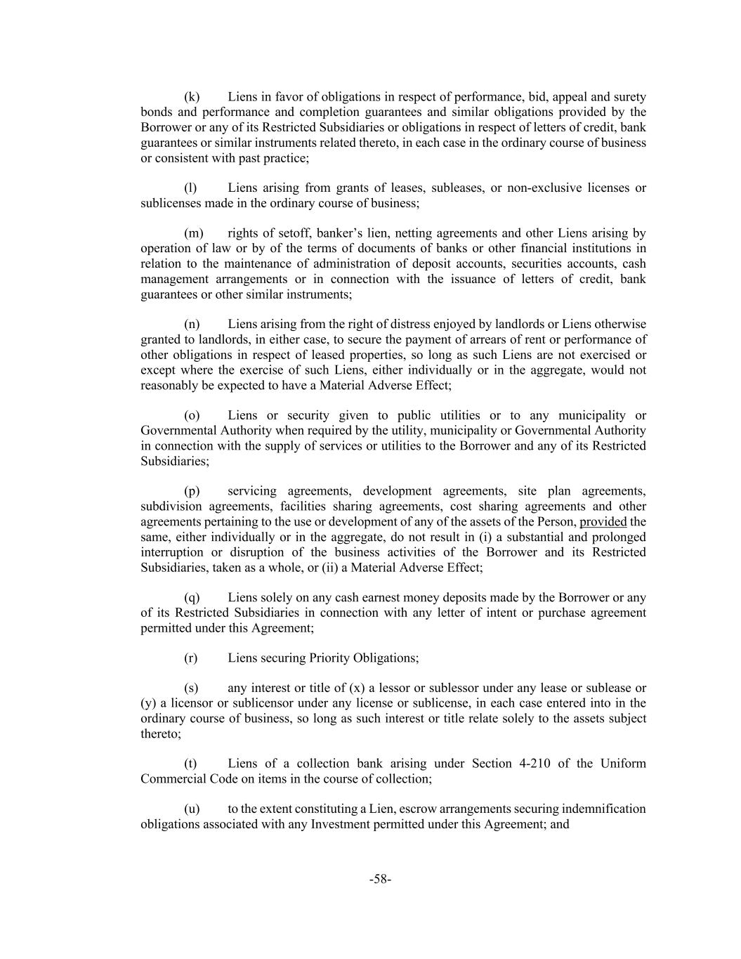 -58- (k) Liens in favor of obligations in respect of performance, bid, appeal and surety bonds and performance and completion guarantees and similar obligations provided by the Borrower or any of its Restricted Subsidiaries or obligations in respect of letters of credit, bank guarantees or similar instruments related thereto, in each case in the ordinary course of business or consistent with past practice; (l) Liens arising from grants of leases, subleases, or non-exclusive licenses or sublicenses made in the ordinary course of business; (m) rights of setoff, banker’s lien, netting agreements and other Liens arising by operation of law or by of the terms of documents of banks or other financial institutions in relation to the maintenance of administration of deposit accounts, securities accounts, cash management arrangements or in connection with the issuance of letters of credit, bank guarantees or other similar instruments; (n) Liens arising from the right of distress enjoyed by landlords or Liens otherwise granted to landlords, in either case, to secure the payment of arrears of rent or performance of other obligations in respect of leased properties, so long as such Liens are not exercised or except where the exercise of such Liens, either individually or in the aggregate, would not reasonably be expected to have a Material Adverse Effect; (o) Liens or security given to public utilities or to any municipality or Governmental Authority when required by the utility, municipality or Governmental Authority in connection with the supply of services or utilities to the Borrower and any of its Restricted Subsidiaries; (p) servicing agreements, development agreements, site plan agreements, subdivision agreements, facilities sharing agreements, cost sharing agreements and other agreements pertaining to the use or development of any of the assets of the Person, provided the same, either individually or in the aggregate, do not result in (i) a substantial and prolonged interruption or disruption of the business activities of the Borrower and its Restricted Subsidiaries, taken as a whole, or (ii) a Material Adverse Effect; (q) Liens solely on any cash earnest money deposits made by the Borrower or any of its Restricted Subsidiaries in connection with any letter of intent or purchase agreement permitted under this Agreement; (r) Liens securing Priority Obligations; (s) any interest or title of (x) a lessor or sublessor under any lease or sublease or (y) a licensor or sublicensor under any license or sublicense, in each case entered into in the ordinary course of business, so long as such interest or title relate solely to the assets subject thereto; (t) Liens of a collection bank arising under Section 4-210 of the Uniform Commercial Code on items in the course of collection; (u) to the extent constituting a Lien, escrow arrangements securing indemnification obligations associated with any Investment permitted under this Agreement; and