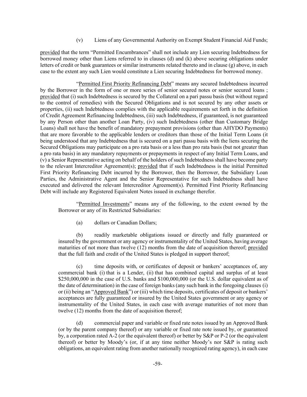 -59- (v) Liens of any Governmental Authority on Exempt Student Financial Aid Funds; provided that the term “Permitted Encumbrances” shall not include any Lien securing Indebtedness for borrowed money other than Liens referred to in clauses (d) and (k) above securing obligations under letters of credit or bank guarantees or similar instruments related thereto and in clause (g) above, in each case to the extent any such Lien would constitute a Lien securing Indebtedness for borrowed money. “Permitted First Priority Refinancing Debt” means any secured Indebtedness incurred by the Borrower in the form of one or more series of senior secured notes or senior secured loans ; provided that (i) such Indebtedness is secured by the Collateral on a pari passu basis (but without regard to the control of remedies) with the Secured Obligations and is not secured by any other assets or properties, (ii) such Indebtedness complies with the applicable requirements set forth in the definition of Credit Agreement Refinancing Indebtedness, (iii) such Indebtedness, if guaranteed, is not guaranteed by any Person other than another Loan Party, (iv) such Indebtedness (other than Customary Bridge Loans) shall not have the benefit of mandatory prepayment provisions (other than AHYDO Payments) that are more favorable to the applicable lenders or creditors than those of the Initial Term Loans (it being understood that any Indebtedness that is secured on a pari passu basis with the liens securing the Secured Obligations may participate on a pro rata basis or a less than pro rata basis (but not greater than a pro rata basis) in any mandatory repayments or prepayments in respect of any Initial Term Loans, and (v) a Senior Representative acting on behalf of the holders of such Indebtedness shall have become party to the relevant Intercreditor Agreement(s); provided that if such Indebtedness is the initial Permitted First Priority Refinancing Debt incurred by the Borrower, then the Borrower, the Subsidiary Loan Parties, the Administrative Agent and the Senior Representative for such Indebtedness shall have executed and delivered the relevant Intercreditor Agreement(s). Permitted First Priority Refinancing Debt will include any Registered Equivalent Notes issued in exchange therefor. “Permitted Investments” means any of the following, to the extent owned by the Borrower or any of its Restricted Subsidiaries: (a) dollars or Canadian Dollars; (b) readily marketable obligations issued or directly and fully guaranteed or insured by the government or any agency or instrumentality of the United States, having average maturities of not more than twelve (12) months from the date of acquisition thereof; provided that the full faith and credit of the United States is pledged in support thereof; (c) time deposits with, or certificates of deposit or bankers’ acceptances of, any commercial bank (i) that is a Lender, (ii) that has combined capital and surplus of at least $250,000,000 in the case of U.S. banks and $100,000,000 (or the U.S. dollar equivalent as of the date of determination) in the case of foreign banks (any such bank in the foregoing clauses (i) or (ii) being an “Approved Bank”) or (iii) which time deposits, certificates of deposit or bankers’ acceptances are fully guaranteed or insured by the United States government or any agency or instrumentality of the United States, in each case with average maturities of not more than twelve (12) months from the date of acquisition thereof; (d) commercial paper and variable or fixed rate notes issued by an Approved Bank (or by the parent company thereof) or any variable or fixed rate note issued by, or guaranteed by, a corporation rated A-2 (or the equivalent thereof) or better by S&P or P-2 (or the equivalent thereof) or better by Moody’s (or, if at any time neither Moody’s nor S&P is rating such obligations, an equivalent rating from another nationally recognized rating agency), in each case