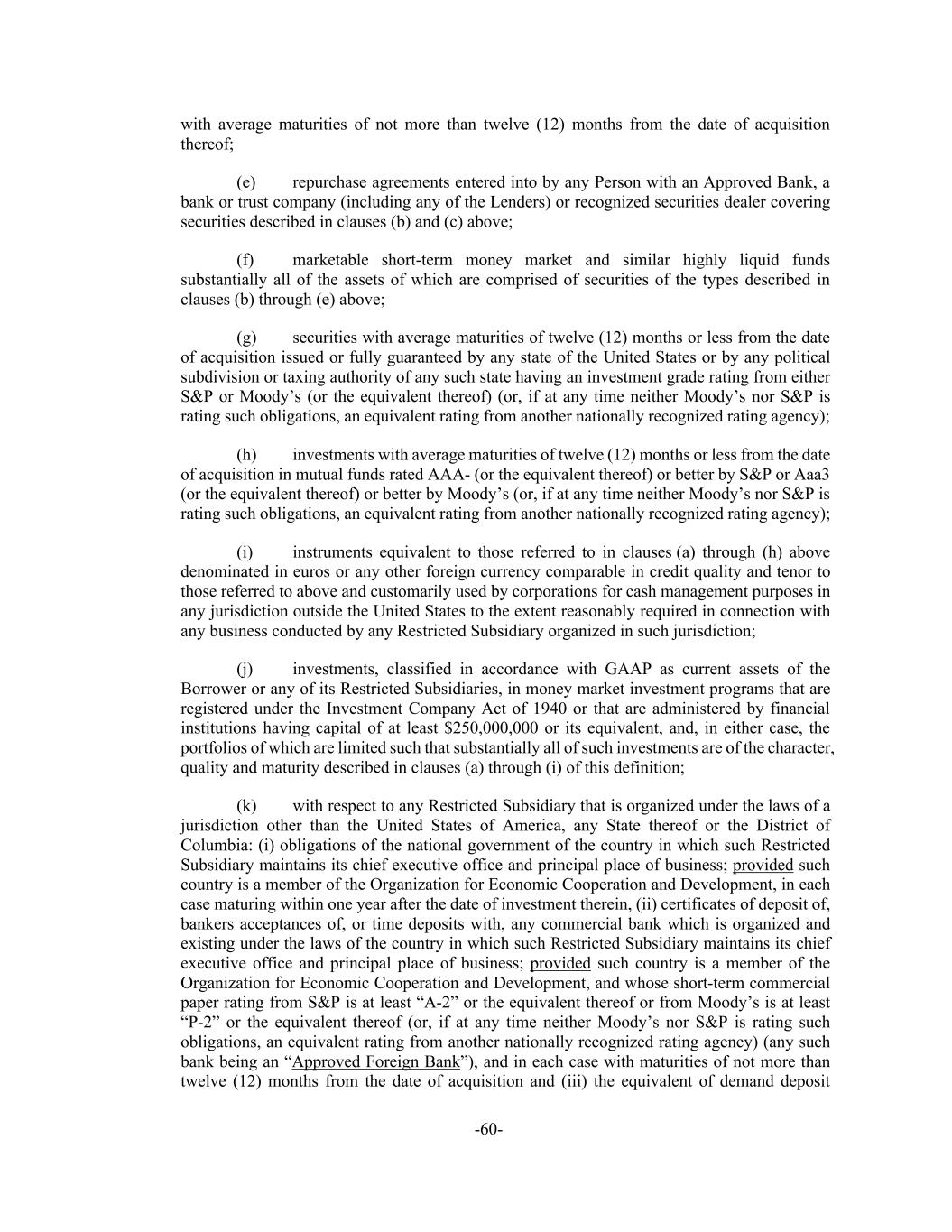 -60- with average maturities of not more than twelve (12) months from the date of acquisition thereof; (e) repurchase agreements entered into by any Person with an Approved Bank, a bank or trust company (including any of the Lenders) or recognized securities dealer covering securities described in clauses (b) and (c) above; (f) marketable short-term money market and similar highly liquid funds substantially all of the assets of which are comprised of securities of the types described in clauses (b) through (e) above; (g) securities with average maturities of twelve (12) months or less from the date of acquisition issued or fully guaranteed by any state of the United States or by any political subdivision or taxing authority of any such state having an investment grade rating from either S&P or Moody’s (or the equivalent thereof) (or, if at any time neither Moody’s nor S&P is rating such obligations, an equivalent rating from another nationally recognized rating agency); (h) investments with average maturities of twelve (12) months or less from the date of acquisition in mutual funds rated AAA- (or the equivalent thereof) or better by S&P or Aaa3 (or the equivalent thereof) or better by Moody’s (or, if at any time neither Moody’s nor S&P is rating such obligations, an equivalent rating from another nationally recognized rating agency); (i) instruments equivalent to those referred to in clauses (a) through (h) above denominated in euros or any other foreign currency comparable in credit quality and tenor to those referred to above and customarily used by corporations for cash management purposes in any jurisdiction outside the United States to the extent reasonably required in connection with any business conducted by any Restricted Subsidiary organized in such jurisdiction; (j) investments, classified in accordance with GAAP as current assets of the Borrower or any of its Restricted Subsidiaries, in money market investment programs that are registered under the Investment Company Act of 1940 or that are administered by financial institutions having capital of at least $250,000,000 or its equivalent, and, in either case, the portfolios of which are limited such that substantially all of such investments are of the character, quality and maturity described in clauses (a) through (i) of this definition; (k) with respect to any Restricted Subsidiary that is organized under the laws of a jurisdiction other than the United States of America, any State thereof or the District of Columbia: (i) obligations of the national government of the country in which such Restricted Subsidiary maintains its chief executive office and principal place of business; provided such country is a member of the Organization for Economic Cooperation and Development, in each case maturing within one year after the date of investment therein, (ii) certificates of deposit of, bankers acceptances of, or time deposits with, any commercial bank which is organized and existing under the laws of the country in which such Restricted Subsidiary maintains its chief executive office and principal place of business; provided such country is a member of the Organization for Economic Cooperation and Development, and whose short-term commercial paper rating from S&P is at least “A-2” or the equivalent thereof or from Moody’s is at least “P-2” or the equivalent thereof (or, if at any time neither Moody’s nor S&P is rating such obligations, an equivalent rating from another nationally recognized rating agency) (any such bank being an “Approved Foreign Bank”), and in each case with maturities of not more than twelve (12) months from the date of acquisition and (iii) the equivalent of demand deposit