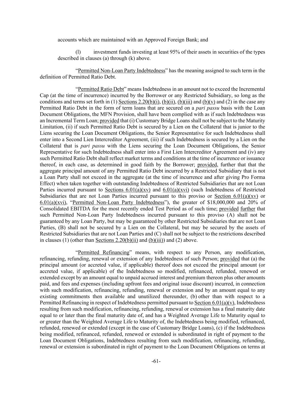 -61- accounts which are maintained with an Approved Foreign Bank; and (l) investment funds investing at least 95% of their assets in securities of the types described in clauses (a) through (k) above. “Permitted Non-Loan Party Indebtedness” has the meaning assigned to such term in the definition of Permitted Ratio Debt. “Permitted Ratio Debt” means Indebtedness in an amount not to exceed the Incremental Cap (at the time of incurrence) incurred by the Borrower or any Restricted Subsidiary, so long as the conditions and terms set forth in (1) Sections 2.20(b)(i), (b)(ii), (b)(iii) and (b)(v) and (2) in the case any Permitted Ratio Debt in the form of term loans that are secured on a pari passu basis with the Loan Document Obligations, the MFN Provision, shall have been complied with as if such Indebtedness was an Incremental Term Loan; provided that (i) Customary Bridge Loans shall not be subject to the Maturity Limitation, (ii) if such Permitted Ratio Debt is secured by a Lien on the Collateral that is junior to the Liens securing the Loan Document Obligations, the Senior Representative for such Indebtedness shall enter into a Second Lien Intercreditor Agreement, (iii) if such Indebtedness is secured by a Lien on the Collateral that is pari passu with the Liens securing the Loan Document Obligations, the Senior Representative for such Indebtedness shall enter into a First Lien Intercreditor Agreement and (iv) any such Permitted Ratio Debt shall reflect market terms and conditions at the time of incurrence or issuance thereof, in each case, as determined in good faith by the Borrower; provided, further that that the aggregate principal amount of any Permitted Ratio Debt incurred by a Restricted Subsidiary that is not a Loan Party shall not exceed in the aggregate (at the time of incurrence and after giving Pro Forma Effect) when taken together with outstanding Indebtedness of Restricted Subsidiaries that are not Loan Parties incurred pursuant to Sections 6.01(a)(xv) and 6.01(a)(xvi) (such Indebtedness of Restricted Subsidiaries that are not Loan Parties incurred pursuant to this proviso or Section 6.01(a)(xv) or 6.01(a)(xvi), “Permitted Non-Loan Party Indebtedness”), the greater of $18,000,000 and 20% of Consolidated EBITDA for the most recently ended Test Period as of such time; provided further that such Permitted Non-Loan Party Indebtedness incurred pursuant to this proviso (A) shall not be guaranteed by any Loan Party, but may be guaranteed by other Restricted Subsidiaries that are not Loan Parties, (B) shall not be secured by a Lien on the Collateral, but may be secured by the assets of Restricted Subsidiaries that are not Loan Parties and (C) shall not be subject to the restrictions described in clauses (1) (other than Sections 2.20(b)(ii) and (b)(iii)) and (2) above. “Permitted Refinancing” means, with respect to any Person, any modification, refinancing, refunding, renewal or extension of any Indebtedness of such Person; provided that (a) the principal amount (or accreted value, if applicable) thereof does not exceed the principal amount (or accreted value, if applicable) of the Indebtedness so modified, refinanced, refunded, renewed or extended except by an amount equal to unpaid accrued interest and premium thereon plus other amounts paid, and fees and expenses (including upfront fees and original issue discount) incurred, in connection with such modification, refinancing, refunding, renewal or extension and by an amount equal to any existing commitments then available and unutilized thereunder, (b) other than with respect to a Permitted Refinancing in respect of Indebtedness permitted pursuant to Section 6.01(a)(v), Indebtedness resulting from such modification, refinancing, refunding, renewal or extension has a final maturity date equal to or later than the final maturity date of, and has a Weighted Average Life to Maturity equal to or greater than the Weighted Average Life to Maturity of, the Indebtedness being modified, refinanced, refunded, renewed or extended (except in the case of Customary Bridge Loans), (c) if the Indebtedness being modified, refinanced, refunded, renewed or extended is subordinated in right of payment to the Loan Document Obligations, Indebtedness resulting from such modification, refinancing, refunding, renewal or extension is subordinated in right of payment to the Loan Document Obligations on terms at