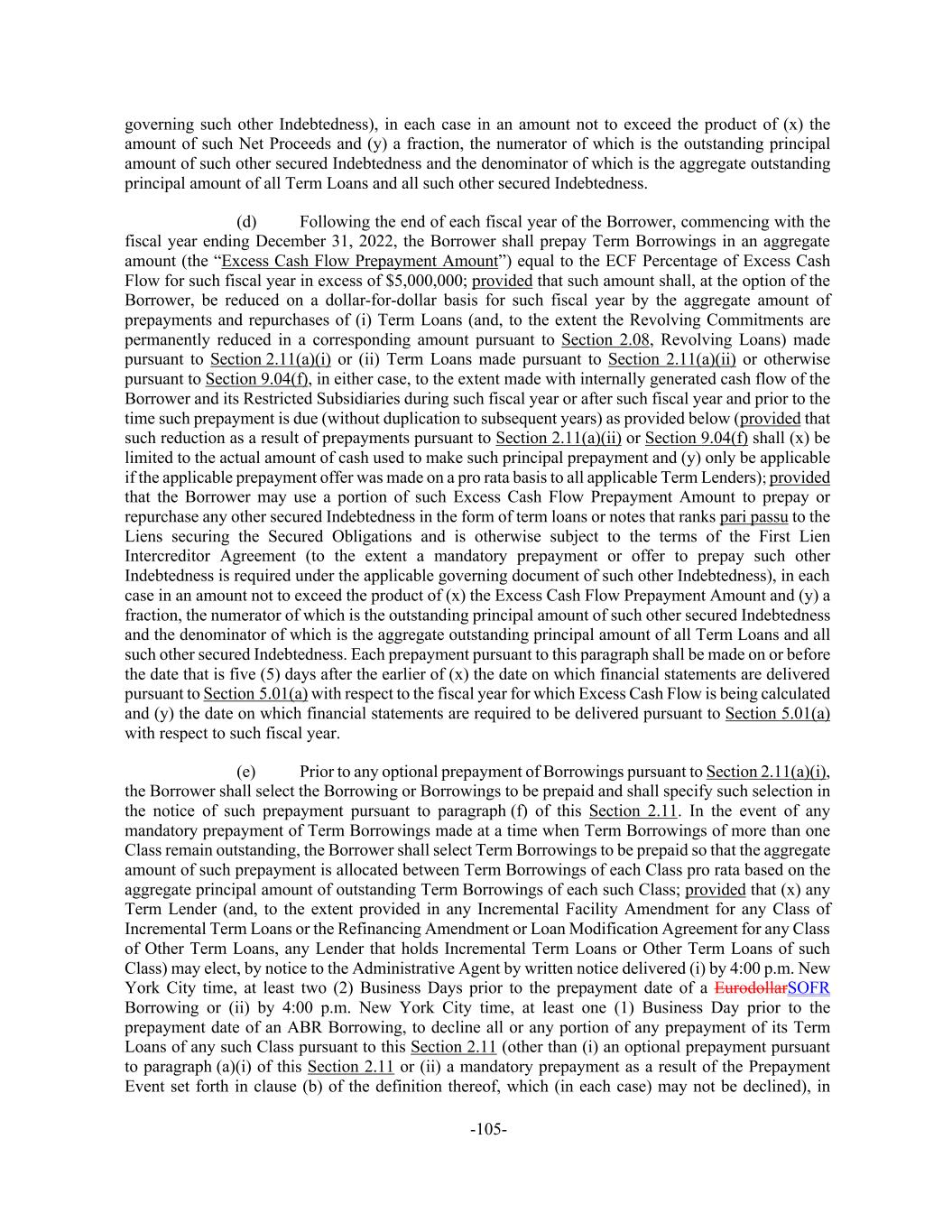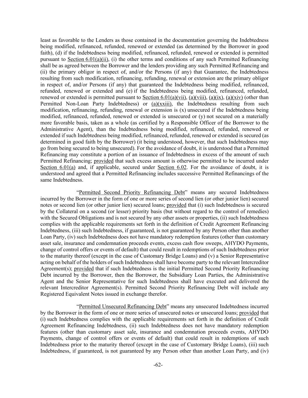 -62- least as favorable to the Lenders as those contained in the documentation governing the Indebtedness being modified, refinanced, refunded, renewed or extended (as determined by the Borrower in good faith), (d) if the Indebtedness being modified, refinanced, refunded, renewed or extended is permitted pursuant to Section 6.01(a)(ii), (i) the other terms and conditions of any such Permitted Refinancing shall be as agreed between the Borrower and the lenders providing any such Permitted Refinancing and (ii) the primary obligor in respect of, and/or the Persons (if any) that Guarantee, the Indebtedness resulting from such modification, refinancing, refunding, renewal or extension are the primary obligor in respect of, and/or Persons (if any) that guaranteed the Indebtedness being modified, refinanced, refunded, renewed or extended and (e) if the Indebtedness being modified, refinanced, refunded, renewed or extended is permitted pursuant to Section 6.01(a)(vii), (a)(viii), (a)(ix), (a)(xiv) (other than Permitted Non-Loan Party Indebtedness) or (a)(xxiii), the Indebtedness resulting from such modification, refinancing, refunding, renewal or extension is (x) unsecured if the Indebtedness being modified, refinanced, refunded, renewed or extended is unsecured or (y) not secured on a materially more favorable basis, taken as a whole (as certified by a Responsible Officer of the Borrower to the Administrative Agent), than the Indebtedness being modified, refinanced, refunded, renewed or extended if such Indebtedness being modified, refinanced, refunded, renewed or extended is secured (as determined in good faith by the Borrower) (it being understood, however, that such Indebtedness may go from being secured to being unsecured). For the avoidance of doubt, it is understood that a Permitted Refinancing may constitute a portion of an issuance of Indebtedness in excess of the amount of such Permitted Refinancing; provided that such excess amount is otherwise permitted to be incurred under Section 6.01(a) and, if applicable, secured under Section 6.02. For the avoidance of doubt, it is understood and agreed that a Permitted Refinancing includes successive Permitted Refinancings of the same Indebtedness. “Permitted Second Priority Refinancing Debt” means any secured Indebtedness incurred by the Borrower in the form of one or more series of second lien (or other junior lien) secured notes or second lien (or other junior lien) secured loans; provided that (i) such Indebtedness is secured by the Collateral on a second (or lesser) priority basis (but without regard to the control of remedies) with the Secured Obligations and is not secured by any other assets or properties, (ii) such Indebtedness complies with the applicable requirements set forth in the definition of Credit Agreement Refinancing Indebtedness, (iii) such Indebtedness, if guaranteed, is not guaranteed by any Person other than another Loan Party, (iv) such Indebtedness does not have mandatory redemption features (other than customary asset sale, insurance and condemnation proceeds events, excess cash flow sweeps, AHYDO Payments, change of control offers or events of default) that could result in redemptions of such Indebtedness prior to the maturity thereof (except in the case of Customary Bridge Loans) and (v) a Senior Representative acting on behalf of the holders of such Indebtedness shall have become party to the relevant Intercreditor Agreement(s); provided that if such Indebtedness is the initial Permitted Second Priority Refinancing Debt incurred by the Borrower, then the Borrower, the Subsidiary Loan Parties, the Administrative Agent and the Senior Representative for such Indebtedness shall have executed and delivered the relevant Intercreditor Agreement(s). Permitted Second Priority Refinancing Debt will include any Registered Equivalent Notes issued in exchange therefor. “Permitted Unsecured Refinancing Debt” means any unsecured Indebtedness incurred by the Borrower in the form of one or more series of unsecured notes or unsecured loans; provided that (i) such Indebtedness complies with the applicable requirements set forth in the definition of Credit Agreement Refinancing Indebtedness, (ii) such Indebtedness does not have mandatory redemption features (other than customary asset sale, insurance and condemnation proceeds events, AHYDO Payments, change of control offers or events of default) that could result in redemptions of such Indebtedness prior to the maturity thereof (except in the case of Customary Bridge Loans), (iii) such Indebtedness, if guaranteed, is not guaranteed by any Person other than another Loan Party, and (iv)
