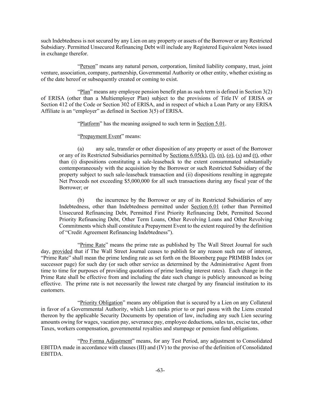 -63- such Indebtedness is not secured by any Lien on any property or assets of the Borrower or any Restricted Subsidiary. Permitted Unsecured Refinancing Debt will include any Registered Equivalent Notes issued in exchange therefor. “Person” means any natural person, corporation, limited liability company, trust, joint venture, association, company, partnership, Governmental Authority or other entity, whether existing as of the date hereof or subsequently created or coming to exist. “Plan” means any employee pension benefit plan as such term is defined in Section 3(2) of ERISA (other than a Multiemployer Plan) subject to the provisions of Title IV of ERISA or Section 412 of the Code or Section 302 of ERISA, and in respect of which a Loan Party or any ERISA Affiliate is an “employer” as defined in Section 3(5) of ERISA. “Platform” has the meaning assigned to such term in Section 5.01. “Prepayment Event” means: (a) any sale, transfer or other disposition of any property or asset of the Borrower or any of its Restricted Subsidiaries permitted by Sections 6.05(k), (l), (n), (o), (s) and (t), other than (i) dispositions constituting a sale-leaseback to the extent consummated substantially contemporaneously with the acquisition by the Borrower or such Restricted Subsidiary of the property subject to such sale-leaseback transaction and (ii) dispositions resulting in aggregate Net Proceeds not exceeding $5,000,000 for all such transactions during any fiscal year of the Borrower; or (b) the incurrence by the Borrower or any of its Restricted Subsidiaries of any Indebtedness, other than Indebtedness permitted under Section 6.01 (other than Permitted Unsecured Refinancing Debt, Permitted First Priority Refinancing Debt, Permitted Second Priority Refinancing Debt, Other Term Loans, Other Revolving Loans and Other Revolving Commitments which shall constitute a Prepayment Event to the extent required by the definition of “Credit Agreement Refinancing Indebtedness”). “Prime Rate” means the prime rate as published by The Wall Street Journal for such day, provided that if The Wall Street Journal ceases to publish for any reason such rate of interest, “Prime Rate” shall mean the prime lending rate as set forth on the Bloomberg page PRIMBB Index (or successor page) for such day (or such other service as determined by the Administrative Agent from time to time for purposes of providing quotations of prime lending interest rates). Each change in the Prime Rate shall be effective from and including the date such change is publicly announced as being effective. The prime rate is not necessarily the lowest rate charged by any financial institution to its customers. “Priority Obligation” means any obligation that is secured by a Lien on any Collateral in favor of a Governmental Authority, which Lien ranks prior to or pari passu with the Liens created thereon by the applicable Security Documents by operation of law, including any such Lien securing amounts owing for wages, vacation pay, severance pay, employee deductions, sales tax, excise tax, other Taxes, workers compensation, governmental royalties and stumpage or pension fund obligations. “Pro Forma Adjustment” means, for any Test Period, any adjustment to Consolidated EBITDA made in accordance with clauses (III) and (IV) to the proviso of the definition of Consolidated EBITDA.