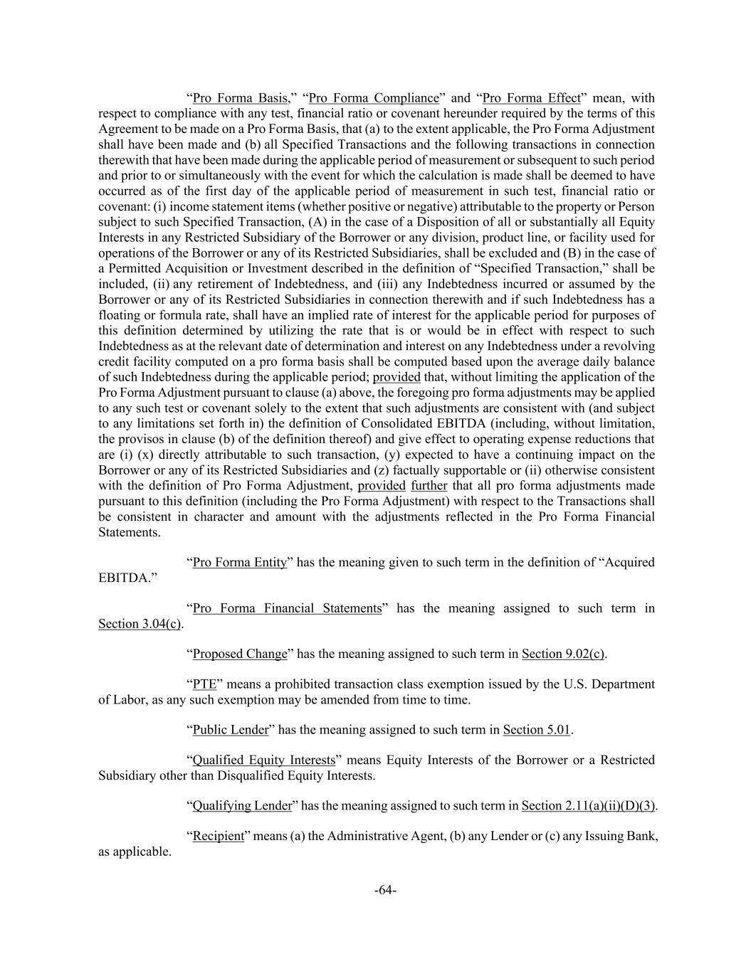 -64- “Pro Forma Basis,” “Pro Forma Compliance” and “Pro Forma Effect” mean, with respect to compliance with any test, financial ratio or covenant hereunder required by the terms of this Agreement to be made on a Pro Forma Basis, that (a) to the extent applicable, the Pro Forma Adjustment shall have been made and (b) all Specified Transactions and the following transactions in connection therewith that have been made during the applicable period of measurement or subsequent to such period and prior to or simultaneously with the event for which the calculation is made shall be deemed to have occurred as of the first day of the applicable period of measurement in such test, financial ratio or covenant: (i) income statement items (whether positive or negative) attributable to the property or Person subject to such Specified Transaction, (A) in the case of a Disposition of all or substantially all Equity Interests in any Restricted Subsidiary of the Borrower or any division, product line, or facility used for operations of the Borrower or any of its Restricted Subsidiaries, shall be excluded and (B) in the case of a Permitted Acquisition or Investment described in the definition of “Specified Transaction,” shall be included, (ii) any retirement of Indebtedness, and (iii) any Indebtedness incurred or assumed by the Borrower or any of its Restricted Subsidiaries in connection therewith and if such Indebtedness has a floating or formula rate, shall have an implied rate of interest for the applicable period for purposes of this definition determined by utilizing the rate that is or would be in effect with respect to such Indebtedness as at the relevant date of determination and interest on any Indebtedness under a revolving credit facility computed on a pro forma basis shall be computed based upon the average daily balance of such Indebtedness during the applicable period; provided that, without limiting the application of the Pro Forma Adjustment pursuant to clause (a) above, the foregoing pro forma adjustments may be applied to any such test or covenant solely to the extent that such adjustments are consistent with (and subject to any limitations set forth in) the definition of Consolidated EBITDA (including, without limitation, the provisos in clause (b) of the definition thereof) and give effect to operating expense reductions that are (i) (x) directly attributable to such transaction, (y) expected to have a continuing impact on the Borrower or any of its Restricted Subsidiaries and (z) factually supportable or (ii) otherwise consistent with the definition of Pro Forma Adjustment, provided further that all pro forma adjustments made pursuant to this definition (including the Pro Forma Adjustment) with respect to the Transactions shall be consistent in character and amount with the adjustments reflected in the Pro Forma Financial Statements. “Pro Forma Entity” has the meaning given to such term in the definition of “Acquired EBITDA.” “Pro Forma Financial Statements” has the meaning assigned to such term in Section 3.04(c). “Proposed Change” has the meaning assigned to such term in Section 9.02(c). “PTE” means a prohibited transaction class exemption issued by the U.S. Department of Labor, as any such exemption may be amended from time to time. “Public Lender” has the meaning assigned to such term in Section 5.01. “Qualified Equity Interests” means Equity Interests of the Borrower or a Restricted Subsidiary other than Disqualified Equity Interests. “Qualifying Lender” has the meaning assigned to such term in Section 2.11(a)(ii)(D)(3). “Recipient” means (a) the Administrative Agent, (b) any Lender or (c) any Issuing Bank, as applicable.