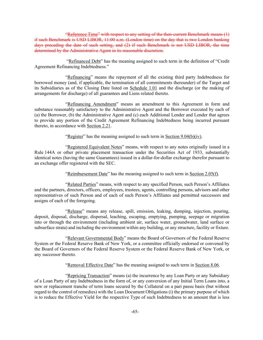 -65- “Reference Time” with respect to any setting of the then-current Benchmark means (1) if such Benchmark is USD LIBOR, 11:00 a.m. (London time) on the day that is two London banking days preceding the date of such setting, and (2) if such Benchmark is not USD LIBOR, the time determined by the Administrative Agent in its reasonable discretion. “Refinanced Debt” has the meaning assigned to such term in the definition of “Credit Agreement Refinancing Indebtedness.” “Refinancing” means the repayment of all the existing third party Indebtedness for borrowed money (and, if applicable, the termination of all commitments thereunder) of the Target and its Subsidiaries as of the Closing Date listed on Schedule 1.01 and the discharge (or the making of arrangements for discharge) of all guarantees and Liens related thereto. “Refinancing Amendment” means an amendment to this Agreement in form and substance reasonably satisfactory to the Administrative Agent and the Borrower executed by each of (a) the Borrower, (b) the Administrative Agent and (c) each Additional Lender and Lender that agrees to provide any portion of the Credit Agreement Refinancing Indebtedness being incurred pursuant thereto, in accordance with Section 2.21. “Register” has the meaning assigned to such term in Section 9.04(b)(iv). “Registered Equivalent Notes” means, with respect to any notes originally issued in a Rule 144A or other private placement transaction under the Securities Act of 1933, substantially identical notes (having the same Guarantees) issued in a dollar-for-dollar exchange therefor pursuant to an exchange offer registered with the SEC. “Reimbursement Date” has the meaning assigned to such term in Section 2.05(f). “Related Parties” means, with respect to any specified Person, such Person’s Affiliates and the partners, directors, officers, employees, trustees, agents, controlling persons, advisors and other representatives of such Person and of each of such Person’s Affiliates and permitted successors and assigns of each of the foregoing. “Release” means any release, spill, emission, leaking, dumping, injection, pouring, deposit, disposal, discharge, dispersal, leaching, escaping, emptying, pumping, seepage or migration into or through the environment (including ambient air, surface water, groundwater, land surface or subsurface strata) and including the environment within any building, or any structure, facility or fixture. “Relevant Governmental Body” means the Board of Governors of the Federal Reserve System or the Federal Reserve Bank of New York, or a committee officially endorsed or convened by the Board of Governors of the Federal Reserve System or the Federal Reserve Bank of New York, or any successor thereto. “Removal Effective Date” has the meaning assigned to such term in Section 8.06. “Repricing Transaction” means (a) the incurrence by any Loan Party or any Subsidiary of a Loan Party of any Indebtedness in the form of, or any conversion of any Initial Term Loans into, a new or replacement tranche of term loans secured by the Collateral on a pari passu basis (but without regard to the control of remedies) with the Loan Document Obligations (i) the primary purpose of which is to reduce the Effective Yield for the respective Type of such Indebtedness to an amount that is less