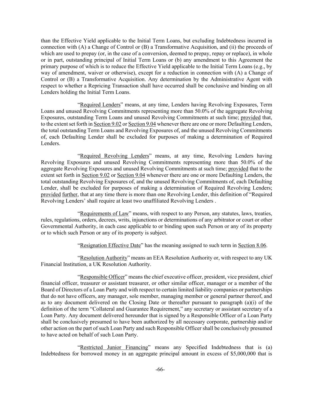 -66- than the Effective Yield applicable to the Initial Term Loans, but excluding Indebtedness incurred in connection with (A) a Change of Control or (B) a Transformative Acquisition, and (ii) the proceeds of which are used to prepay (or, in the case of a conversion, deemed to prepay, repay or replace), in whole or in part, outstanding principal of Initial Term Loans or (b) any amendment to this Agreement the primary purpose of which is to reduce the Effective Yield applicable to the Initial Term Loans (e.g., by way of amendment, waiver or otherwise), except for a reduction in connection with (A) a Change of Control or (B) a Transformative Acquisition. Any determination by the Administrative Agent with respect to whether a Repricing Transaction shall have occurred shall be conclusive and binding on all Lenders holding the Initial Term Loans. “Required Lenders” means, at any time, Lenders having Revolving Exposures, Term Loans and unused Revolving Commitments representing more than 50.0% of the aggregate Revolving Exposures, outstanding Term Loans and unused Revolving Commitments at such time; provided that, to the extent set forth in Section 9.02 or Section 9.04 whenever there are one or more Defaulting Lenders, the total outstanding Term Loans and Revolving Exposures of, and the unused Revolving Commitments of, each Defaulting Lender shall be excluded for purposes of making a determination of Required Lenders. “Required Revolving Lenders” means, at any time, Revolving Lenders having Revolving Exposures and unused Revolving Commitments representing more than 50.0% of the aggregate Revolving Exposures and unused Revolving Commitments at such time; provided that to the extent set forth in Section 9.02 or Section 9.04 whenever there are one or more Defaulting Lenders, the total outstanding Revolving Exposures of, and the unused Revolving Commitments of, each Defaulting Lender, shall be excluded for purposes of making a determination of Required Revolving Lenders; provided further, that at any time there is more than one Revolving Lender, this definition of “Required Revolving Lenders’ shall require at least two unaffiliated Revolving Lenders . “Requirements of Law” means, with respect to any Person, any statutes, laws, treaties, rules, regulations, orders, decrees, writs, injunctions or determinations of any arbitrator or court or other Governmental Authority, in each case applicable to or binding upon such Person or any of its property or to which such Person or any of its property is subject. “Resignation Effective Date” has the meaning assigned to such term in Section 8.06. “Resolution Authority” means an EEA Resolution Authority or, with respect to any UK Financial Institution, a UK Resolution Authority. “Responsible Officer” means the chief executive officer, president, vice president, chief financial officer, treasurer or assistant treasurer, or other similar officer, manager or a member of the Board of Directors of a Loan Party and with respect to certain limited liability companies or partnerships that do not have officers, any manager, sole member, managing member or general partner thereof, and as to any document delivered on the Closing Date or thereafter pursuant to paragraph (a)(i) of the definition of the term “Collateral and Guarantee Requirement,” any secretary or assistant secretary of a Loan Party. Any document delivered hereunder that is signed by a Responsible Officer of a Loan Party shall be conclusively presumed to have been authorized by all necessary corporate, partnership and/or other action on the part of such Loan Party and such Responsible Officer shall be conclusively presumed to have acted on behalf of such Loan Party. “Restricted Junior Financing” means any Specified Indebtedness that is (a) Indebtedness for borrowed money in an aggregate principal amount in excess of $5,000,000 that is