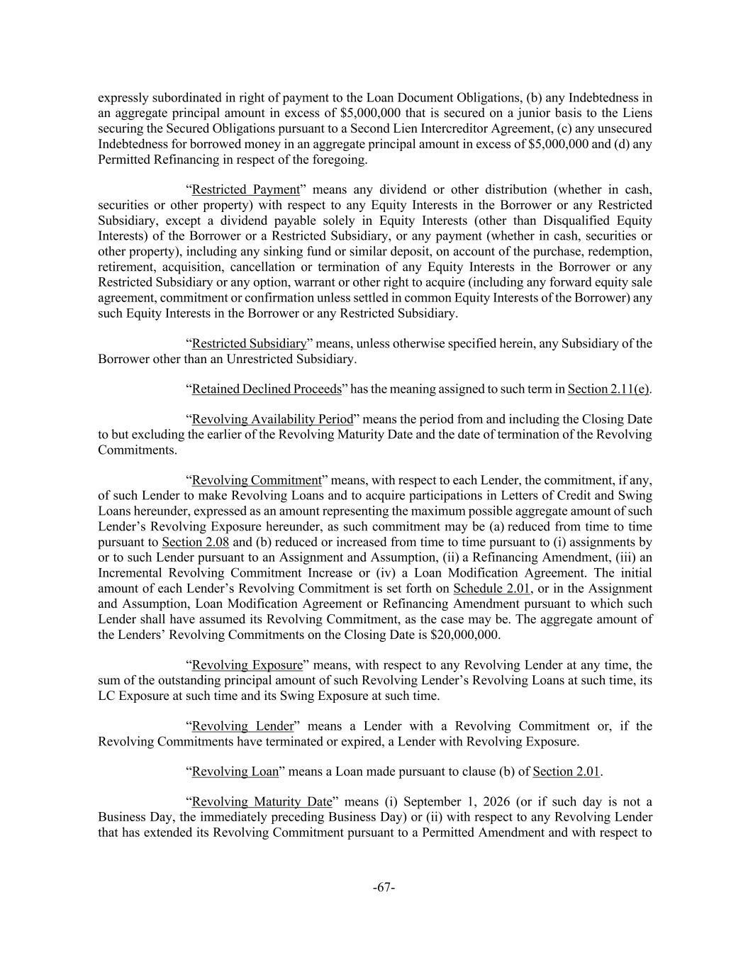 -67- expressly subordinated in right of payment to the Loan Document Obligations, (b) any Indebtedness in an aggregate principal amount in excess of $5,000,000 that is secured on a junior basis to the Liens securing the Secured Obligations pursuant to a Second Lien Intercreditor Agreement, (c) any unsecured Indebtedness for borrowed money in an aggregate principal amount in excess of $5,000,000 and (d) any Permitted Refinancing in respect of the foregoing. “Restricted Payment” means any dividend or other distribution (whether in cash, securities or other property) with respect to any Equity Interests in the Borrower or any Restricted Subsidiary, except a dividend payable solely in Equity Interests (other than Disqualified Equity Interests) of the Borrower or a Restricted Subsidiary, or any payment (whether in cash, securities or other property), including any sinking fund or similar deposit, on account of the purchase, redemption, retirement, acquisition, cancellation or termination of any Equity Interests in the Borrower or any Restricted Subsidiary or any option, warrant or other right to acquire (including any forward equity sale agreement, commitment or confirmation unless settled in common Equity Interests of the Borrower) any such Equity Interests in the Borrower or any Restricted Subsidiary. “Restricted Subsidiary” means, unless otherwise specified herein, any Subsidiary of the Borrower other than an Unrestricted Subsidiary. “Retained Declined Proceeds” has the meaning assigned to such term in Section 2.11(e). “Revolving Availability Period” means the period from and including the Closing Date to but excluding the earlier of the Revolving Maturity Date and the date of termination of the Revolving Commitments. “Revolving Commitment” means, with respect to each Lender, the commitment, if any, of such Lender to make Revolving Loans and to acquire participations in Letters of Credit and Swing Loans hereunder, expressed as an amount representing the maximum possible aggregate amount of such Lender’s Revolving Exposure hereunder, as such commitment may be (a) reduced from time to time pursuant to Section 2.08 and (b) reduced or increased from time to time pursuant to (i) assignments by or to such Lender pursuant to an Assignment and Assumption, (ii) a Refinancing Amendment, (iii) an Incremental Revolving Commitment Increase or (iv) a Loan Modification Agreement. The initial amount of each Lender’s Revolving Commitment is set forth on Schedule 2.01, or in the Assignment and Assumption, Loan Modification Agreement or Refinancing Amendment pursuant to which such Lender shall have assumed its Revolving Commitment, as the case may be. The aggregate amount of the Lenders’ Revolving Commitments on the Closing Date is $20,000,000. “Revolving Exposure” means, with respect to any Revolving Lender at any time, the sum of the outstanding principal amount of such Revolving Lender’s Revolving Loans at such time, its LC Exposure at such time and its Swing Exposure at such time. “Revolving Lender” means a Lender with a Revolving Commitment or, if the Revolving Commitments have terminated or expired, a Lender with Revolving Exposure. “Revolving Loan” means a Loan made pursuant to clause (b) of Section 2.01. “Revolving Maturity Date” means (i) September 1, 2026 (or if such day is not a Business Day, the immediately preceding Business Day) or (ii) with respect to any Revolving Lender that has extended its Revolving Commitment pursuant to a Permitted Amendment and with respect to