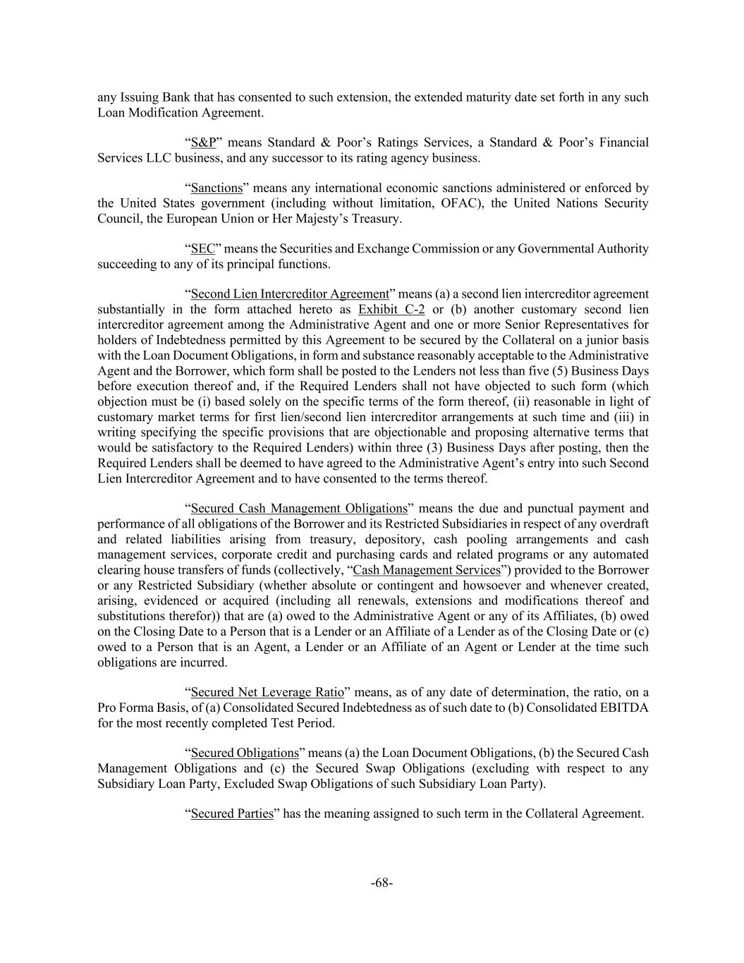 -68- any Issuing Bank that has consented to such extension, the extended maturity date set forth in any such Loan Modification Agreement. “S&P” means Standard & Poor’s Ratings Services, a Standard & Poor’s Financial Services LLC business, and any successor to its rating agency business. “Sanctions” means any international economic sanctions administered or enforced by the United States government (including without limitation, OFAC), the United Nations Security Council, the European Union or Her Majesty’s Treasury. “SEC” means the Securities and Exchange Commission or any Governmental Authority succeeding to any of its principal functions. “Second Lien Intercreditor Agreement” means (a) a second lien intercreditor agreement substantially in the form attached hereto as Exhibit C-2 or (b) another customary second lien intercreditor agreement among the Administrative Agent and one or more Senior Representatives for holders of Indebtedness permitted by this Agreement to be secured by the Collateral on a junior basis with the Loan Document Obligations, in form and substance reasonably acceptable to the Administrative Agent and the Borrower, which form shall be posted to the Lenders not less than five (5) Business Days before execution thereof and, if the Required Lenders shall not have objected to such form (which objection must be (i) based solely on the specific terms of the form thereof, (ii) reasonable in light of customary market terms for first lien/second lien intercreditor arrangements at such time and (iii) in writing specifying the specific provisions that are objectionable and proposing alternative terms that would be satisfactory to the Required Lenders) within three (3) Business Days after posting, then the Required Lenders shall be deemed to have agreed to the Administrative Agent’s entry into such Second Lien Intercreditor Agreement and to have consented to the terms thereof. “Secured Cash Management Obligations” means the due and punctual payment and performance of all obligations of the Borrower and its Restricted Subsidiaries in respect of any overdraft and related liabilities arising from treasury, depository, cash pooling arrangements and cash management services, corporate credit and purchasing cards and related programs or any automated clearing house transfers of funds (collectively, “Cash Management Services”) provided to the Borrower or any Restricted Subsidiary (whether absolute or contingent and howsoever and whenever created, arising, evidenced or acquired (including all renewals, extensions and modifications thereof and substitutions therefor)) that are (a) owed to the Administrative Agent or any of its Affiliates, (b) owed on the Closing Date to a Person that is a Lender or an Affiliate of a Lender as of the Closing Date or (c) owed to a Person that is an Agent, a Lender or an Affiliate of an Agent or Lender at the time such obligations are incurred. “Secured Net Leverage Ratio” means, as of any date of determination, the ratio, on a Pro Forma Basis, of (a) Consolidated Secured Indebtedness as of such date to (b) Consolidated EBITDA for the most recently completed Test Period. “Secured Obligations” means (a) the Loan Document Obligations, (b) the Secured Cash Management Obligations and (c) the Secured Swap Obligations (excluding with respect to any Subsidiary Loan Party, Excluded Swap Obligations of such Subsidiary Loan Party). “Secured Parties” has the meaning assigned to such term in the Collateral Agreement.
