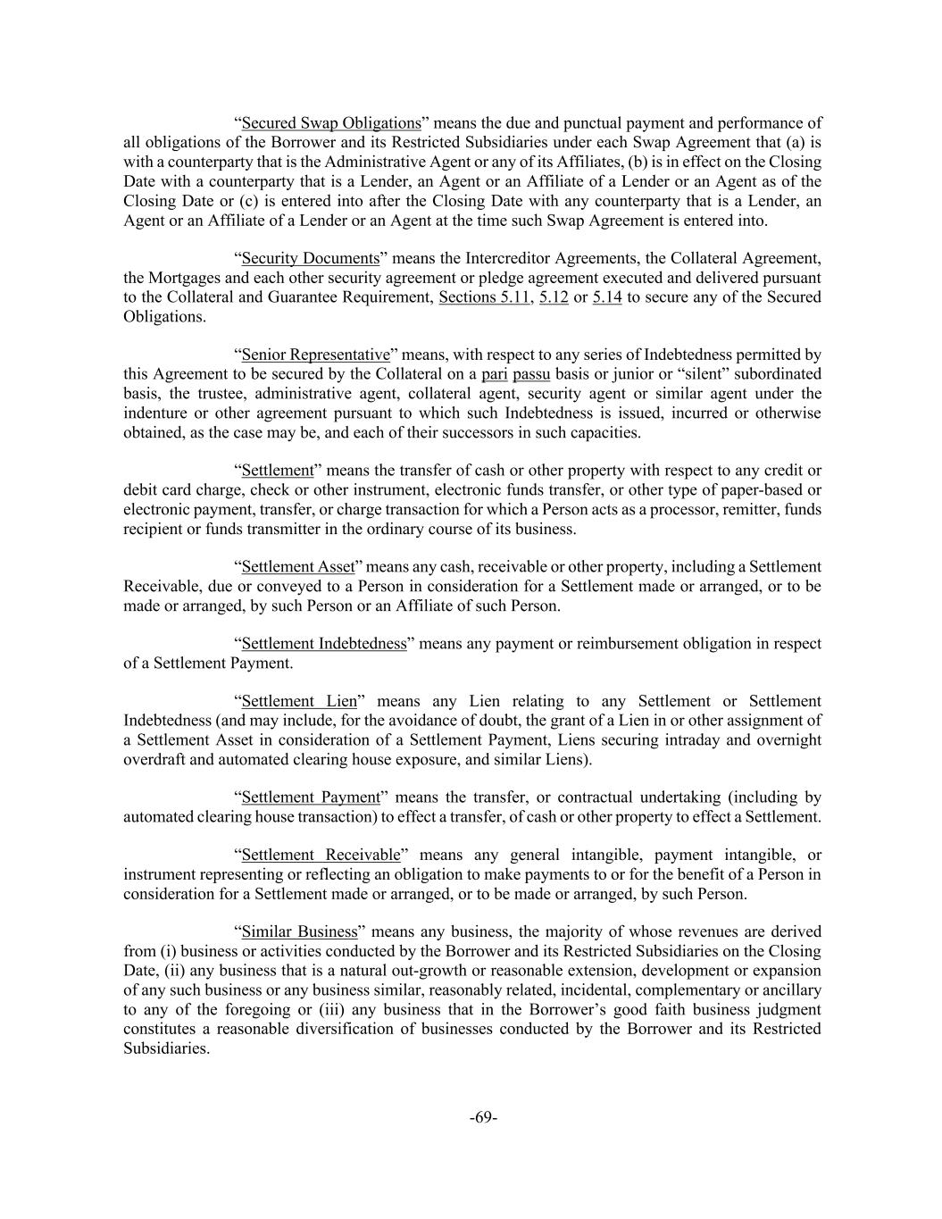 -69- “Secured Swap Obligations” means the due and punctual payment and performance of all obligations of the Borrower and its Restricted Subsidiaries under each Swap Agreement that (a) is with a counterparty that is the Administrative Agent or any of its Affiliates, (b) is in effect on the Closing Date with a counterparty that is a Lender, an Agent or an Affiliate of a Lender or an Agent as of the Closing Date or (c) is entered into after the Closing Date with any counterparty that is a Lender, an Agent or an Affiliate of a Lender or an Agent at the time such Swap Agreement is entered into. “Security Documents” means the Intercreditor Agreements, the Collateral Agreement, the Mortgages and each other security agreement or pledge agreement executed and delivered pursuant to the Collateral and Guarantee Requirement, Sections 5.11, 5.12 or 5.14 to secure any of the Secured Obligations. “Senior Representative” means, with respect to any series of Indebtedness permitted by this Agreement to be secured by the Collateral on a pari passu basis or junior or “silent” subordinated basis, the trustee, administrative agent, collateral agent, security agent or similar agent under the indenture or other agreement pursuant to which such Indebtedness is issued, incurred or otherwise obtained, as the case may be, and each of their successors in such capacities. “Settlement” means the transfer of cash or other property with respect to any credit or debit card charge, check or other instrument, electronic funds transfer, or other type of paper-based or electronic payment, transfer, or charge transaction for which a Person acts as a processor, remitter, funds recipient or funds transmitter in the ordinary course of its business. “Settlement Asset” means any cash, receivable or other property, including a Settlement Receivable, due or conveyed to a Person in consideration for a Settlement made or arranged, or to be made or arranged, by such Person or an Affiliate of such Person. “Settlement Indebtedness” means any payment or reimbursement obligation in respect of a Settlement Payment. “Settlement Lien” means any Lien relating to any Settlement or Settlement Indebtedness (and may include, for the avoidance of doubt, the grant of a Lien in or other assignment of a Settlement Asset in consideration of a Settlement Payment, Liens securing intraday and overnight overdraft and automated clearing house exposure, and similar Liens). “Settlement Payment” means the transfer, or contractual undertaking (including by automated clearing house transaction) to effect a transfer, of cash or other property to effect a Settlement. “Settlement Receivable” means any general intangible, payment intangible, or instrument representing or reflecting an obligation to make payments to or for the benefit of a Person in consideration for a Settlement made or arranged, or to be made or arranged, by such Person. “Similar Business” means any business, the majority of whose revenues are derived from (i) business or activities conducted by the Borrower and its Restricted Subsidiaries on the Closing Date, (ii) any business that is a natural out-growth or reasonable extension, development or expansion of any such business or any business similar, reasonably related, incidental, complementary or ancillary to any of the foregoing or (iii) any business that in the Borrower’s good faith business judgment constitutes a reasonable diversification of businesses conducted by the Borrower and its Restricted Subsidiaries.