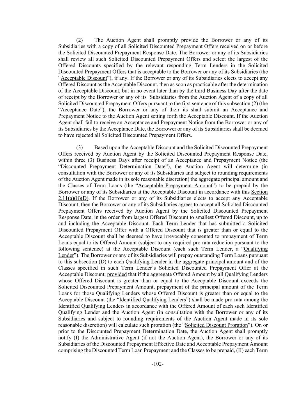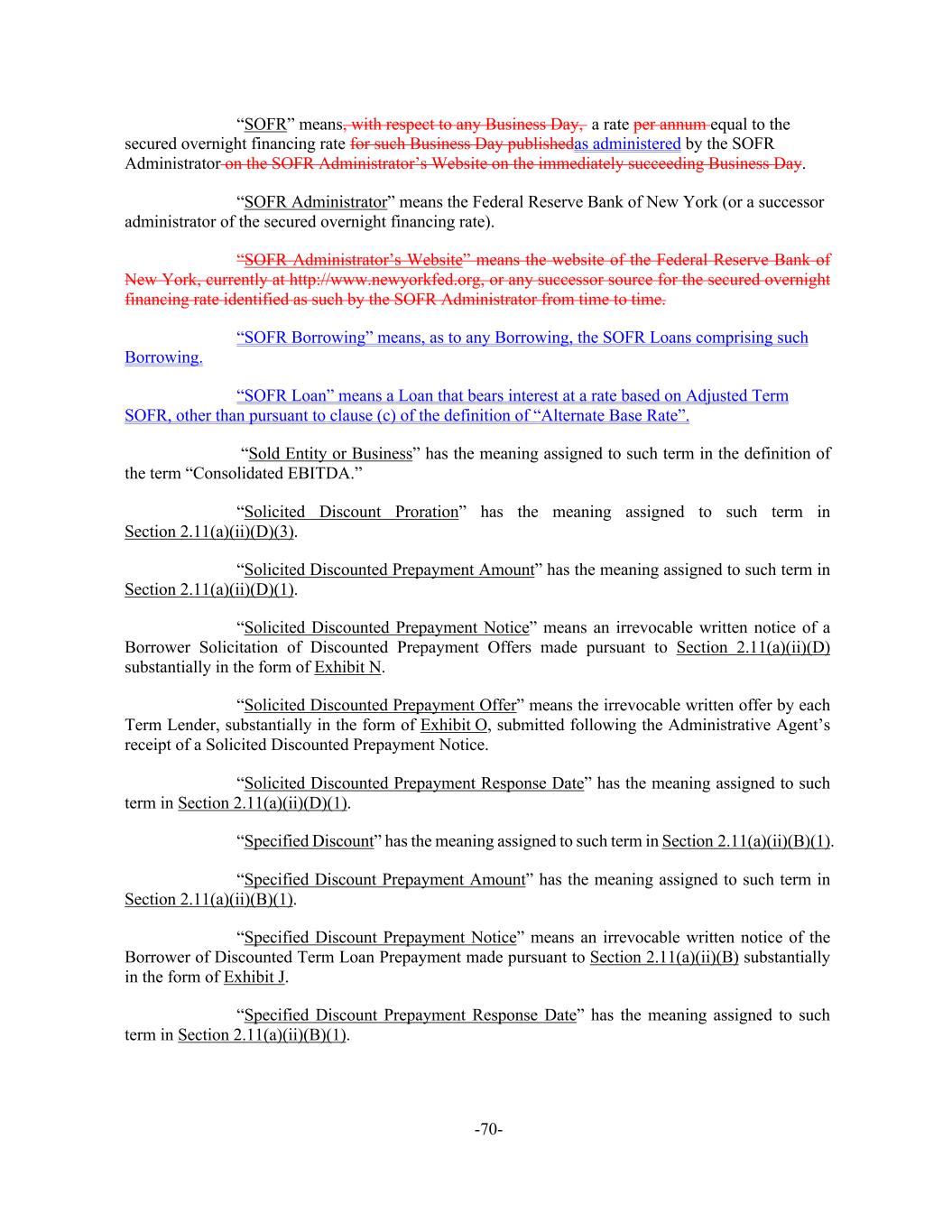 -70- “SOFR” means, with respect to any Business Day, a rate per annum equal to the secured overnight financing rate for such Business Day publishedas administered by the SOFR Administrator on the SOFR Administrator’s Website on the immediately succeeding Business Day. “SOFR Administrator” means the Federal Reserve Bank of New York (or a successor administrator of the secured overnight financing rate). “SOFR Administrator’s Website” means the website of the Federal Reserve Bank of New York, currently at http://www.newyorkfed.org, or any successor source for the secured overnight financing rate identified as such by the SOFR Administrator from time to time. “SOFR Borrowing” means, as to any Borrowing, the SOFR Loans comprising such Borrowing. “SOFR Loan” means a Loan that bears interest at a rate based on Adjusted Term SOFR, other than pursuant to clause (c) of the definition of “Alternate Base Rate”. “Sold Entity or Business” has the meaning assigned to such term in the definition of the term “Consolidated EBITDA.” “Solicited Discount Proration” has the meaning assigned to such term in Section 2.11(a)(ii)(D)(3). “Solicited Discounted Prepayment Amount” has the meaning assigned to such term in Section 2.11(a)(ii)(D)(1). “Solicited Discounted Prepayment Notice” means an irrevocable written notice of a Borrower Solicitation of Discounted Prepayment Offers made pursuant to Section 2.11(a)(ii)(D) substantially in the form of Exhibit N. “Solicited Discounted Prepayment Offer” means the irrevocable written offer by each Term Lender, substantially in the form of Exhibit O, submitted following the Administrative Agent’s receipt of a Solicited Discounted Prepayment Notice. “Solicited Discounted Prepayment Response Date” has the meaning assigned to such term in Section 2.11(a)(ii)(D)(1). “Specified Discount” has the meaning assigned to such term in Section 2.11(a)(ii)(B)(1). “Specified Discount Prepayment Amount” has the meaning assigned to such term in Section 2.11(a)(ii)(B)(1). “Specified Discount Prepayment Notice” means an irrevocable written notice of the Borrower of Discounted Term Loan Prepayment made pursuant to Section 2.11(a)(ii)(B) substantially in the form of Exhibit J. “Specified Discount Prepayment Response Date” has the meaning assigned to such term in Section 2.11(a)(ii)(B)(1).
