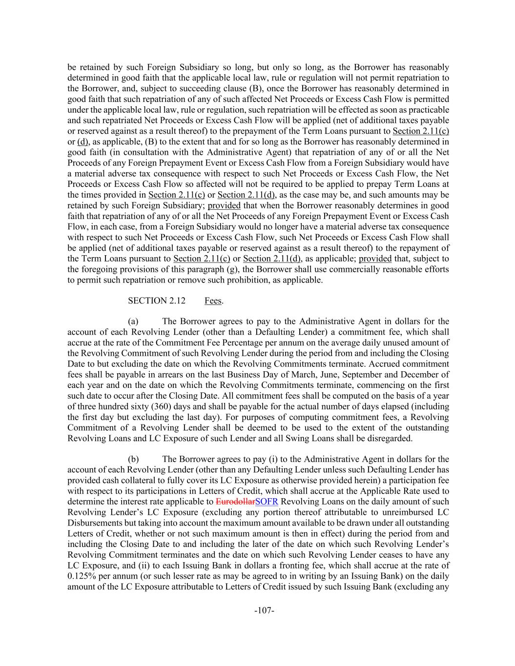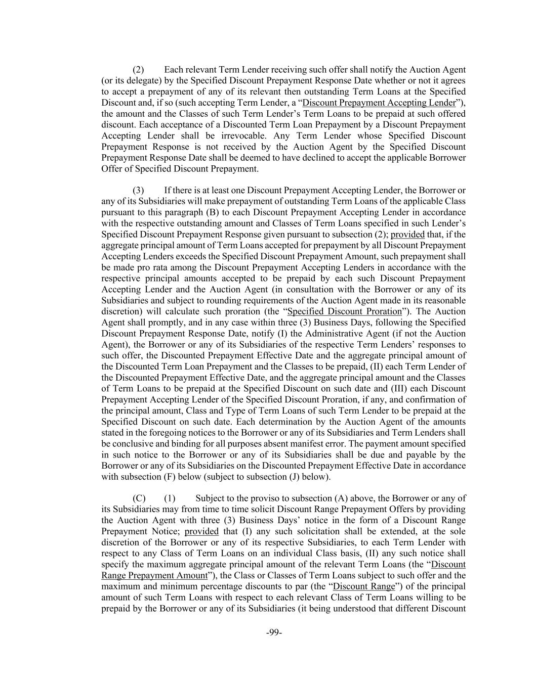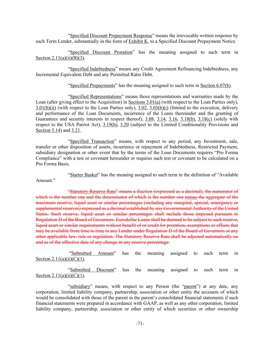 -71- “Specified Discount Prepayment Response” means the irrevocable written response by each Term Lender, substantially in the form of Exhibit K, to a Specified Discount Prepayment Notice. “Specified Discount Proration” has the meaning assigned to such term in Section 2.11(a)(ii)(B)(3). “Specified Indebtedness” means any Credit Agreement Refinancing Indebtedness, any Incremental Equivalent Debt and any Permitted Ratio Debt. “Specified Prepayments” has the meaning assigned to such term in Section 6.07(b). “Specified Representations” means those representations and warranties made by the Loan (after giving effect to the Acquisition) in Sections 3.01(a) (with respect to the Loan Parties only), 3.01(b)(ii) (with respect to the Loan Parties only), 3.02, 3.03(b)(i) (limited to the execution, delivery and performance of the Loan Documents, incurrence of the Loans thereunder and the granting of Guarantees and security interests in respect thereof), 3.08, 3.14, 3.16, 3.18(b), 3.18(c) (solely with respect to the USA Patriot Act), 3.19(b), 3.20 (subject to the Limited Conditionality Provisions and Section 5.14) and 3.21. “Specified Transaction” means, with respect to any period, any Investment, sale, transfer or other disposition of assets, incurrence or repayment of Indebtedness, Restricted Payment, subsidiary designation or other event that by the terms of the Loan Documents requires “Pro Forma Compliance” with a test or covenant hereunder or requires such test or covenant to be calculated on a Pro Forma Basis. “Starter Basket” has the meaning assigned to such term in the definition of “Available Amount.” “Statutory Reserve Rate” means a fraction (expressed as a decimal), the numerator of which is the number one and the denominator of which is the number one minus the aggregate of the maximum reserve, liquid asset or similar percentages (including any marginal, special, emergency or supplemental reserves) expressed as a decimal established by any Governmental Authority of the United States. Such reserve, liquid asset or similar percentages shall include those imposed pursuant to Regulation D of the Board of Governors. Eurodollar Loans shall be deemed to be subject to such reserve, liquid asset or similar requirements without benefit of or credit for proration, exemptions or offsets that may be available from time to time to any Lender under Regulation D of the Board of Governors or any other applicable law, rule or regulation. The Statutory Reserve Rate shall be adjusted automatically on and as of the effective date of any change in any reserve percentage. “Submitted Amount” has the meaning assigned to such term in Section 2.11(a)(ii)(C)(1). “Submitted Discount” has the meaning assigned to such term in Section 2.11(a)(ii)(C)(1). “subsidiary” means, with respect to any Person (the “parent”) at any date, any corporation, limited liability company, partnership, association or other entity the accounts of which would be consolidated with those of the parent in the parent’s consolidated financial statements if such financial statements were prepared in accordance with GAAP, as well as any other corporation, limited liability company, partnership, association or other entity of which securities or other ownership