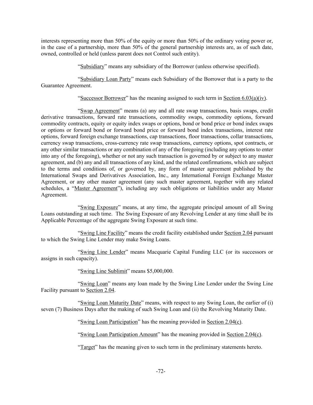 -72- interests representing more than 50% of the equity or more than 50% of the ordinary voting power or, in the case of a partnership, more than 50% of the general partnership interests are, as of such date, owned, controlled or held (unless parent does not Control such entity). “Subsidiary” means any subsidiary of the Borrower (unless otherwise specified). “Subsidiary Loan Party” means each Subsidiary of the Borrower that is a party to the Guarantee Agreement. “Successor Borrower” has the meaning assigned to such term in Section 6.03(a)(iv). “Swap Agreement” means (a) any and all rate swap transactions, basis swaps, credit derivative transactions, forward rate transactions, commodity swaps, commodity options, forward commodity contracts, equity or equity index swaps or options, bond or bond price or bond index swaps or options or forward bond or forward bond price or forward bond index transactions, interest rate options, forward foreign exchange transactions, cap transactions, floor transactions, collar transactions, currency swap transactions, cross-currency rate swap transactions, currency options, spot contracts, or any other similar transactions or any combination of any of the foregoing (including any options to enter into any of the foregoing), whether or not any such transaction is governed by or subject to any master agreement, and (b) any and all transactions of any kind, and the related confirmations, which are subject to the terms and conditions of, or governed by, any form of master agreement published by the International Swaps and Derivatives Association, Inc., any International Foreign Exchange Master Agreement, or any other master agreement (any such master agreement, together with any related schedules, a “Master Agreement”), including any such obligations or liabilities under any Master Agreement. “Swing Exposure” means, at any time, the aggregate principal amount of all Swing Loans outstanding at such time. The Swing Exposure of any Revolving Lender at any time shall be its Applicable Percentage of the aggregate Swing Exposure at such time. “Swing Line Facility” means the credit facility established under Section 2.04 pursuant to which the Swing Line Lender may make Swing Loans. “Swing Line Lender” means Macquarie Capital Funding LLC (or its successors or assigns in such capacity). “Swing Line Sublimit” means $5,000,000. “Swing Loan” means any loan made by the Swing Line Lender under the Swing Line Facility pursuant to Section 2.04. “Swing Loan Maturity Date” means, with respect to any Swing Loan, the earlier of (i) seven (7) Business Days after the making of such Swing Loan and (ii) the Revolving Maturity Date. “Swing Loan Participation” has the meaning provided in Section 2.04(c). “Swing Loan Participation Amount” has the meaning provided in Section 2.04(c). “Target” has the meaning given to such term in the preliminary statements hereto.