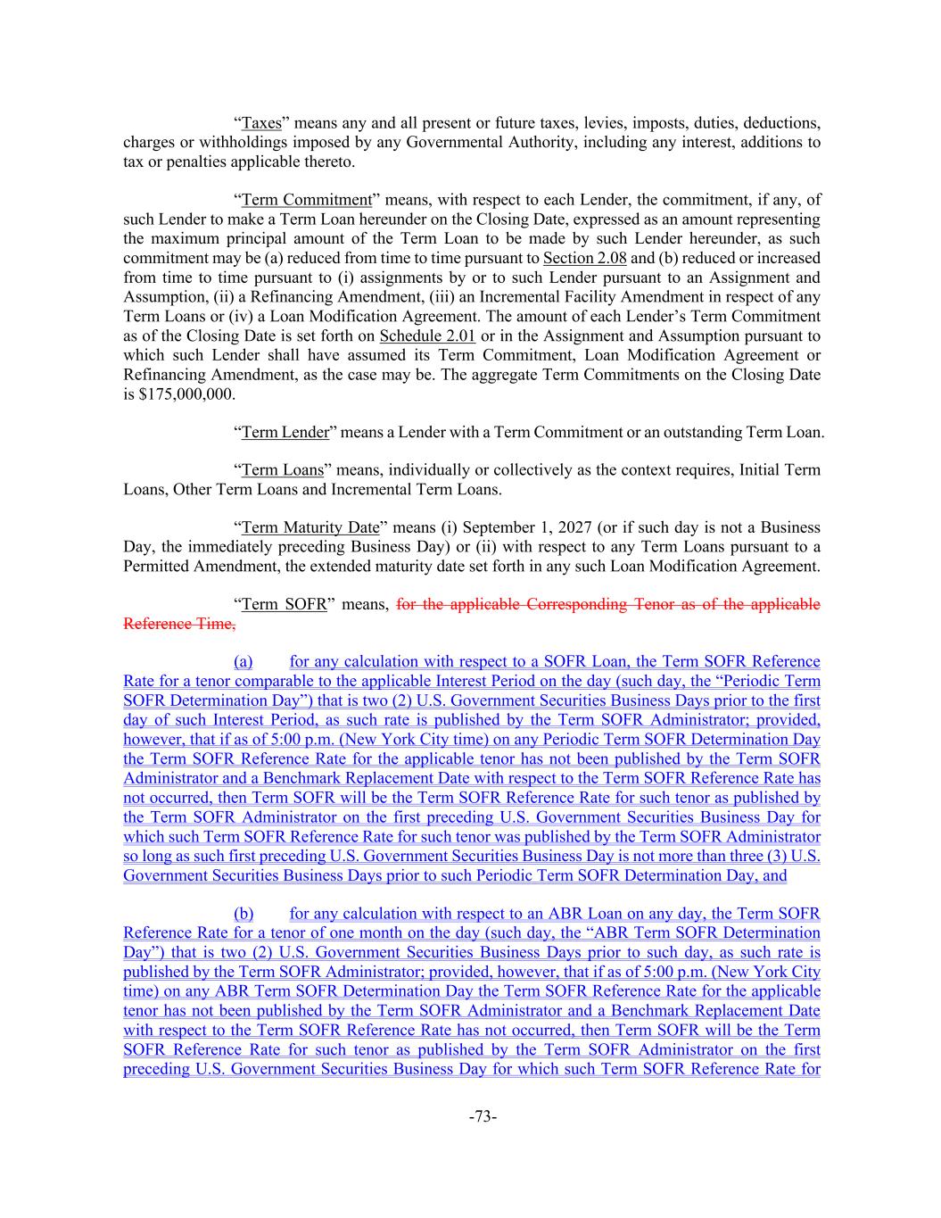 -73- “Taxes” means any and all present or future taxes, levies, imposts, duties, deductions, charges or withholdings imposed by any Governmental Authority, including any interest, additions to tax or penalties applicable thereto. “Term Commitment” means, with respect to each Lender, the commitment, if any, of such Lender to make a Term Loan hereunder on the Closing Date, expressed as an amount representing the maximum principal amount of the Term Loan to be made by such Lender hereunder, as such commitment may be (a) reduced from time to time pursuant to Section 2.08 and (b) reduced or increased from time to time pursuant to (i) assignments by or to such Lender pursuant to an Assignment and Assumption, (ii) a Refinancing Amendment, (iii) an Incremental Facility Amendment in respect of any Term Loans or (iv) a Loan Modification Agreement. The amount of each Lender’s Term Commitment as of the Closing Date is set forth on Schedule 2.01 or in the Assignment and Assumption pursuant to which such Lender shall have assumed its Term Commitment, Loan Modification Agreement or Refinancing Amendment, as the case may be. The aggregate Term Commitments on the Closing Date is $175,000,000. “Term Lender” means a Lender with a Term Commitment or an outstanding Term Loan. “Term Loans” means, individually or collectively as the context requires, Initial Term Loans, Other Term Loans and Incremental Term Loans. “Term Maturity Date” means (i) September 1, 2027 (or if such day is not a Business Day, the immediately preceding Business Day) or (ii) with respect to any Term Loans pursuant to a Permitted Amendment, the extended maturity date set forth in any such Loan Modification Agreement. “Term SOFR” means, for the applicable Corresponding Tenor as of the applicable Reference Time, (a) for any calculation with respect to a SOFR Loan, the Term SOFR Reference Rate for a tenor comparable to the applicable Interest Period on the day (such day, the “Periodic Term SOFR Determination Day”) that is two (2) U.S. Government Securities Business Days prior to the first day of such Interest Period, as such rate is published by the Term SOFR Administrator; provided, however, that if as of 5:00 p.m. (New York City time) on any Periodic Term SOFR Determination Day the Term SOFR Reference Rate for the applicable tenor has not been published by the Term SOFR Administrator and a Benchmark Replacement Date with respect to the Term SOFR Reference Rate has not occurred, then Term SOFR will be the Term SOFR Reference Rate for such tenor as published by the Term SOFR Administrator on the first preceding U.S. Government Securities Business Day for which such Term SOFR Reference Rate for such tenor was published by the Term SOFR Administrator so long as such first preceding U.S. Government Securities Business Day is not more than three (3) U.S. Government Securities Business Days prior to such Periodic Term SOFR Determination Day, and (b) for any calculation with respect to an ABR Loan on any day, the Term SOFR Reference Rate for a tenor of one month on the day (such day, the “ABR Term SOFR Determination Day”) that is two (2) U.S. Government Securities Business Days prior to such day, as such rate is published by the Term SOFR Administrator; provided, however, that if as of 5:00 p.m. (New York City time) on any ABR Term SOFR Determination Day the Term SOFR Reference Rate for the applicable tenor has not been published by the Term SOFR Administrator and a Benchmark Replacement Date with respect to the Term SOFR Reference Rate has not occurred, then Term SOFR will be the Term SOFR Reference Rate for such tenor as published by the Term SOFR Administrator on the first preceding U.S. Government Securities Business Day for which such Term SOFR Reference Rate for