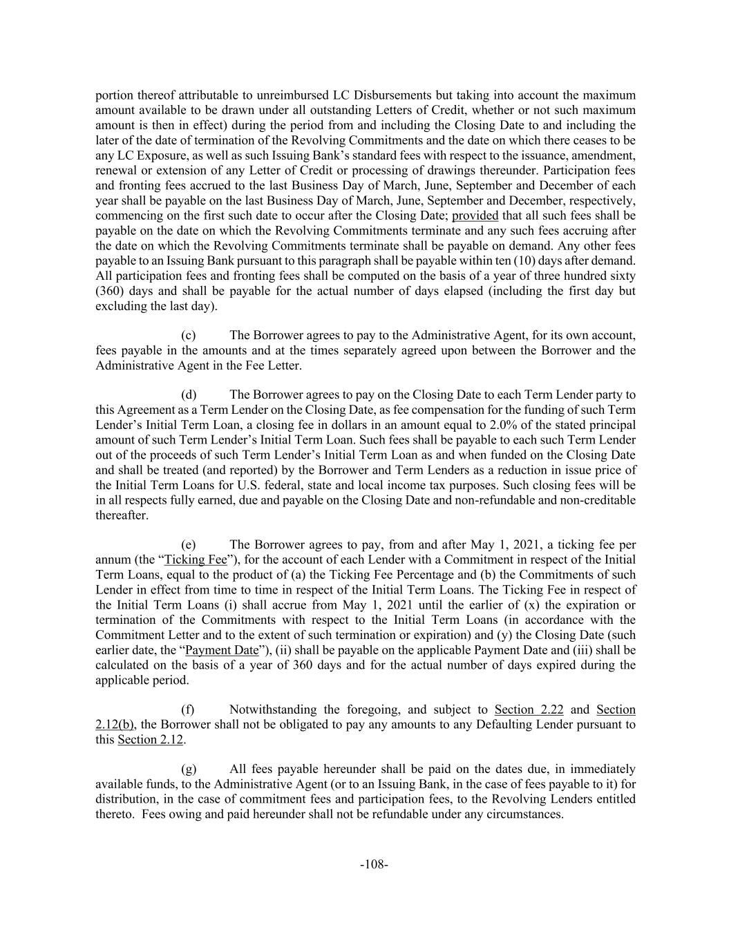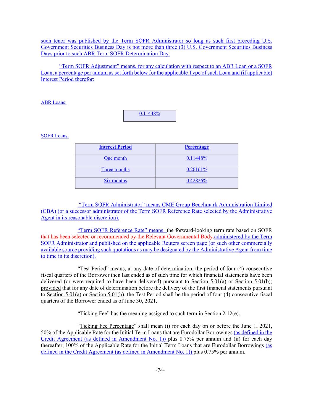 -74- such tenor was published by the Term SOFR Administrator so long as such first preceding U.S. Government Securities Business Day is not more than three (3) U.S. Government Securities Business Days prior to such ABR Term SOFR Determination Day. “Term SOFR Adjustment” means, for any calculation with respect to an ABR Loan or a SOFR Loan, a percentage per annum as set forth below for the applicable Type of such Loan and (if applicable) Interest Period therefor: ABR Loans: 0.11448% SOFR Loans: Interest Period Percentage One month 0.11448% Three months 0.26161% Six months 0.42826% “Term SOFR Administrator” means CME Group Benchmark Administration Limited (CBA) (or a successor administrator of the Term SOFR Reference Rate selected by the Administrative Agent in its reasonable discretion). “Term SOFR Reference Rate” means the forward-looking term rate based on SOFR that has been selected or recommended by the Relevant Governmental Body.administered by the Term SOFR Administrator and published on the applicable Reuters screen page (or such other commercially available source providing such quotations as may be designated by the Administrative Agent from time to time in its discretion). “Test Period” means, at any date of determination, the period of four (4) consecutive fiscal quarters of the Borrower then last ended as of such time for which financial statements have been delivered (or were required to have been delivered) pursuant to Section 5.01(a) or Section 5.01(b); provided that for any date of determination before the delivery of the first financial statements pursuant to Section 5.01(a) or Section 5.01(b), the Test Period shall be the period of four (4) consecutive fiscal quarters of the Borrower ended as of June 30, 2021. “Ticking Fee” has the meaning assigned to such term in Section 2.12(e). “Ticking Fee Percentage” shall mean (i) for each day on or before the June 1, 2021, 50% of the Applicable Rate for the Initial Term Loans that are Eurodollar Borrowings (as defined in the Credit Agreement (as defined in Amendment No. 1)) plus 0.75% per annum and (ii) for each day thereafter, 100% of the Applicable Rate for the Initial Term Loans that are Eurodollar Borrowings (as defined in the Credit Agreement (as defined in Amendment No. 1)) plus 0.75% per annum.