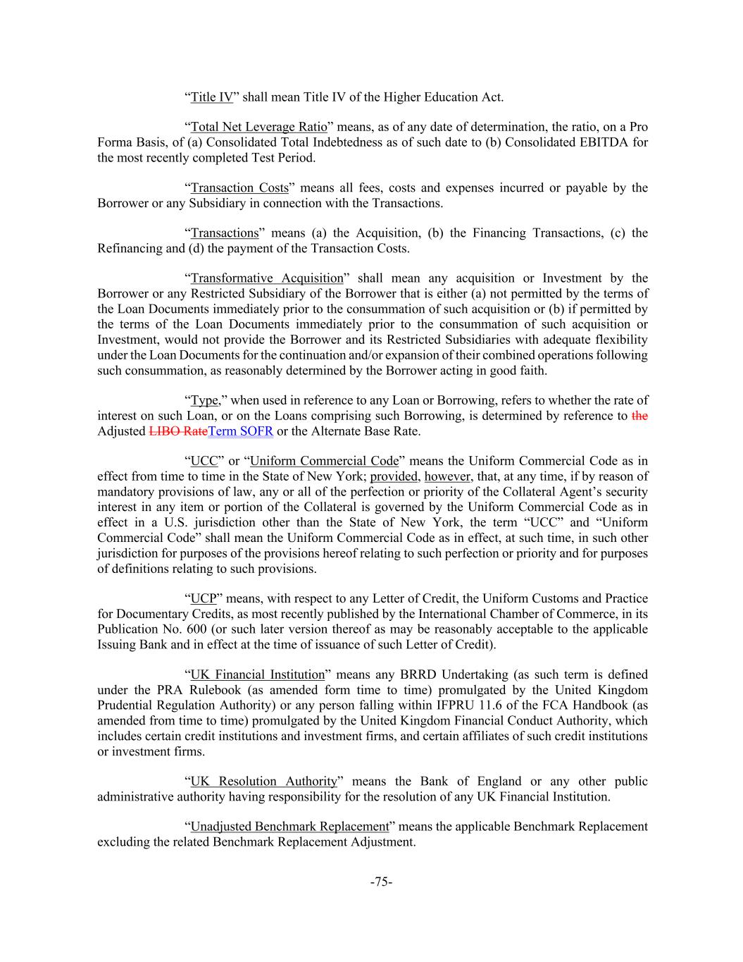 -75- “Title IV” shall mean Title IV of the Higher Education Act. “Total Net Leverage Ratio” means, as of any date of determination, the ratio, on a Pro Forma Basis, of (a) Consolidated Total Indebtedness as of such date to (b) Consolidated EBITDA for the most recently completed Test Period. “Transaction Costs” means all fees, costs and expenses incurred or payable by the Borrower or any Subsidiary in connection with the Transactions. “Transactions” means (a) the Acquisition, (b) the Financing Transactions, (c) the Refinancing and (d) the payment of the Transaction Costs. “Transformative Acquisition” shall mean any acquisition or Investment by the Borrower or any Restricted Subsidiary of the Borrower that is either (a) not permitted by the terms of the Loan Documents immediately prior to the consummation of such acquisition or (b) if permitted by the terms of the Loan Documents immediately prior to the consummation of such acquisition or Investment, would not provide the Borrower and its Restricted Subsidiaries with adequate flexibility under the Loan Documents for the continuation and/or expansion of their combined operations following such consummation, as reasonably determined by the Borrower acting in good faith. “Type,” when used in reference to any Loan or Borrowing, refers to whether the rate of interest on such Loan, or on the Loans comprising such Borrowing, is determined by reference to the Adjusted LIBO RateTerm SOFR or the Alternate Base Rate. “UCC” or “Uniform Commercial Code” means the Uniform Commercial Code as in effect from time to time in the State of New York; provided, however, that, at any time, if by reason of mandatory provisions of law, any or all of the perfection or priority of the Collateral Agent’s security interest in any item or portion of the Collateral is governed by the Uniform Commercial Code as in effect in a U.S. jurisdiction other than the State of New York, the term “UCC” and “Uniform Commercial Code” shall mean the Uniform Commercial Code as in effect, at such time, in such other jurisdiction for purposes of the provisions hereof relating to such perfection or priority and for purposes of definitions relating to such provisions. “UCP” means, with respect to any Letter of Credit, the Uniform Customs and Practice for Documentary Credits, as most recently published by the International Chamber of Commerce, in its Publication No. 600 (or such later version thereof as may be reasonably acceptable to the applicable Issuing Bank and in effect at the time of issuance of such Letter of Credit). “UK Financial Institution” means any BRRD Undertaking (as such term is defined under the PRA Rulebook (as amended form time to time) promulgated by the United Kingdom Prudential Regulation Authority) or any person falling within IFPRU 11.6 of the FCA Handbook (as amended from time to time) promulgated by the United Kingdom Financial Conduct Authority, which includes certain credit institutions and investment firms, and certain affiliates of such credit institutions or investment firms. “UK Resolution Authority” means the Bank of England or any other public administrative authority having responsibility for the resolution of any UK Financial Institution. “Unadjusted Benchmark Replacement” means the applicable Benchmark Replacement excluding the related Benchmark Replacement Adjustment.